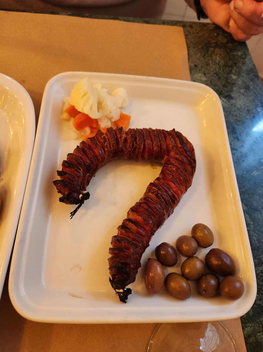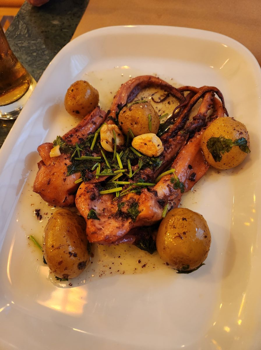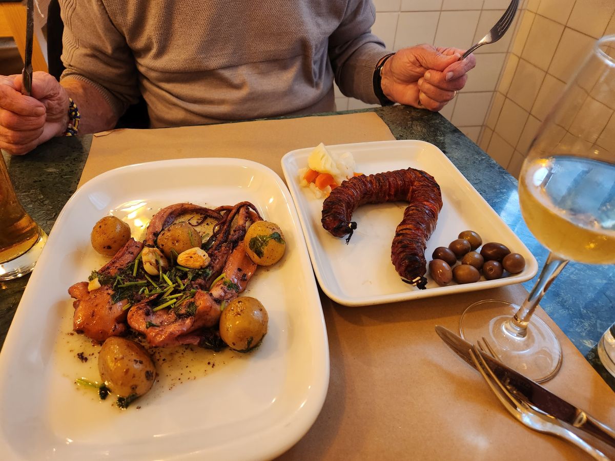 At one point the skies open up, and we hang out on a street corner under a shop awning. Once the rain shower passed, we head to Menina, where they aren’t yet open, so we continue on into Alfama, climbing up those steep streets, looking for someplace to eat. There is a little shop selling Obidos Ginja, which we can’t pass up and right around the corner an open restaurant with a patio area, but also a few tables inside by the windows – which is the best choice as it begins to pour once we settle ourselves inside for an excellent meal of chorizo and a tender, perfectly seasoned grilled octopus.