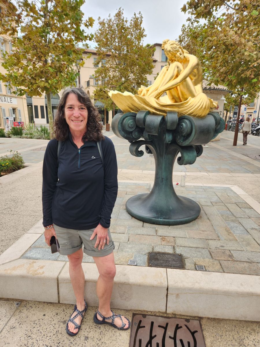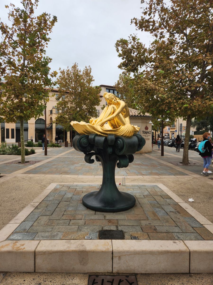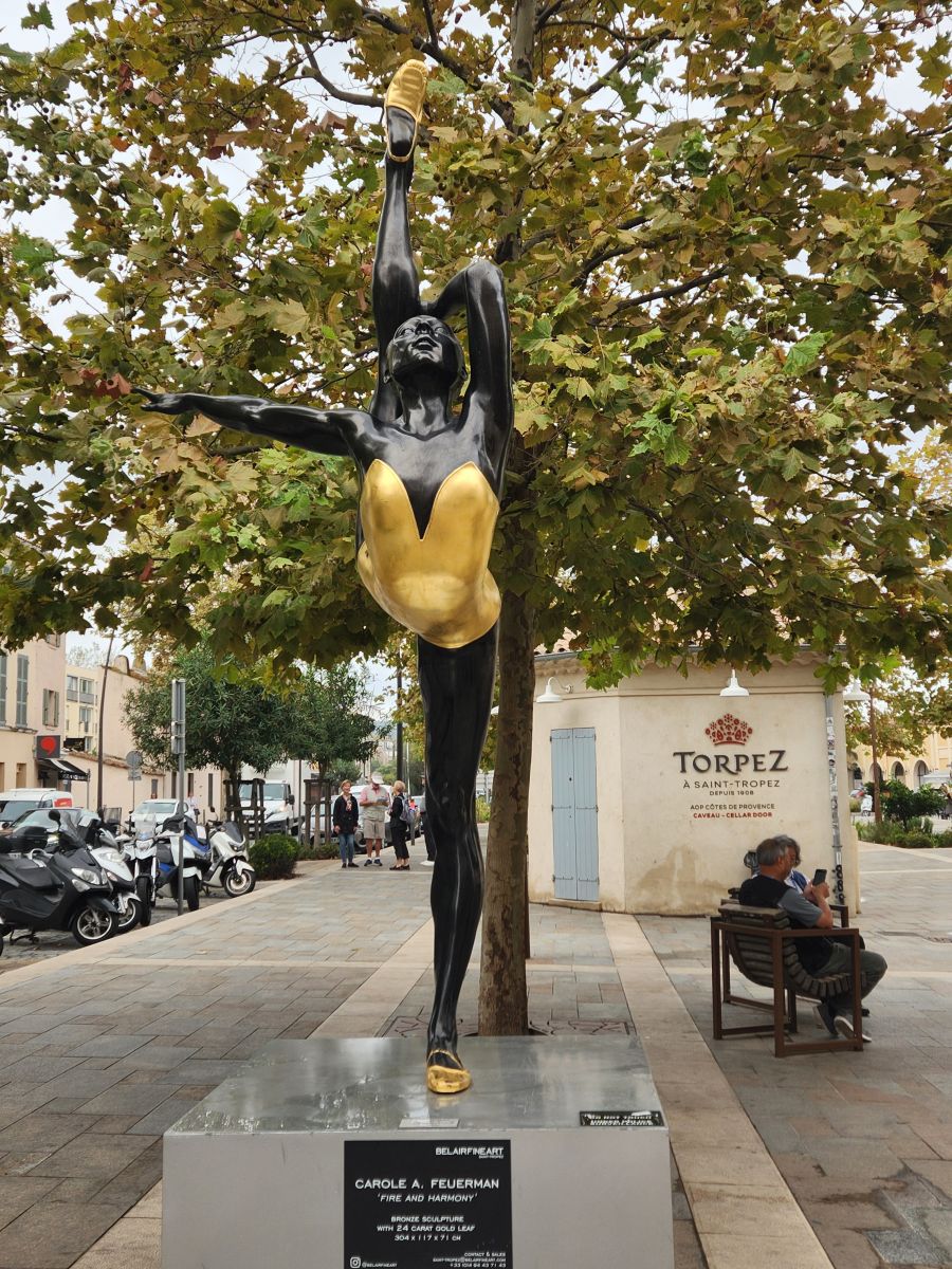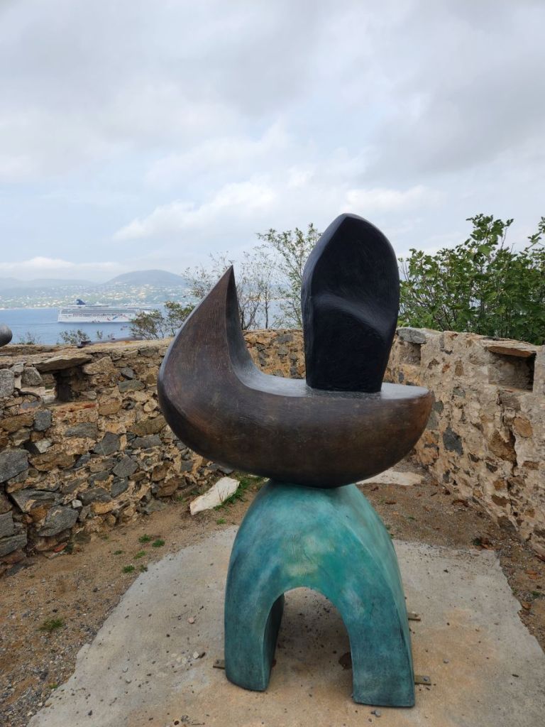 From the pier it’s a quick walk to town, where we stop at the first café we see for a cappuccino. Expensive. But, yeah, it’s St. Tropez. Onward we march, through the town proper, passing these great black and gold statues that are all over town, to the tourist office for a map and brochures, where an oddly lifelike swimmer statue is placed out front, then up to the Citadel for the war history museum and the views.