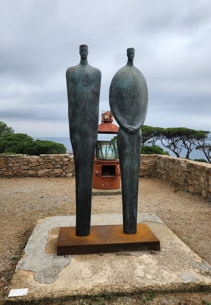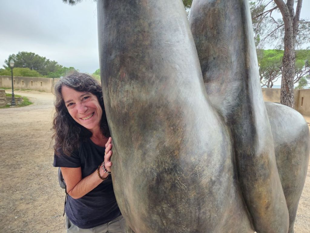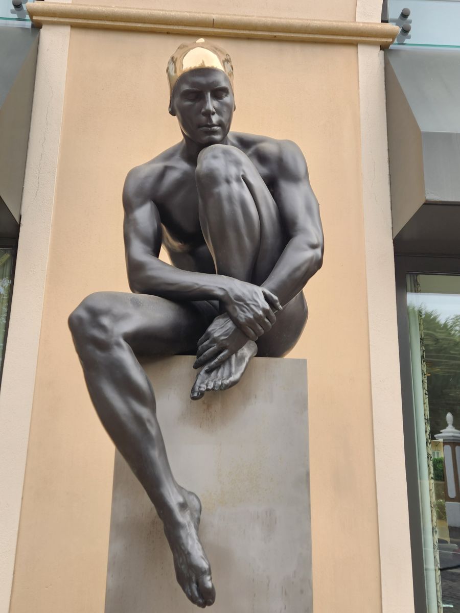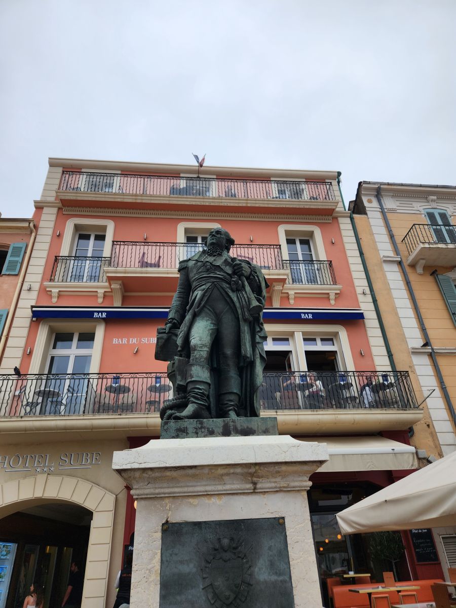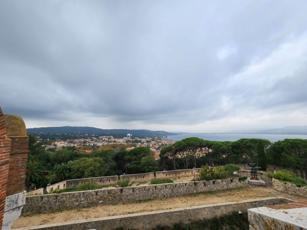 From the pier it’s a quick walk to town, where we stop at the first café we see for a cappuccino. Expensive. But, yeah, it’s St. Tropez. Onward we march, through the town proper, passing these great black and gold statues that are all over town, to the tourist office for a map and brochures, where an oddly lifelike swimmer statue is placed out front, then up to the Citadel for the war history museum and the views.