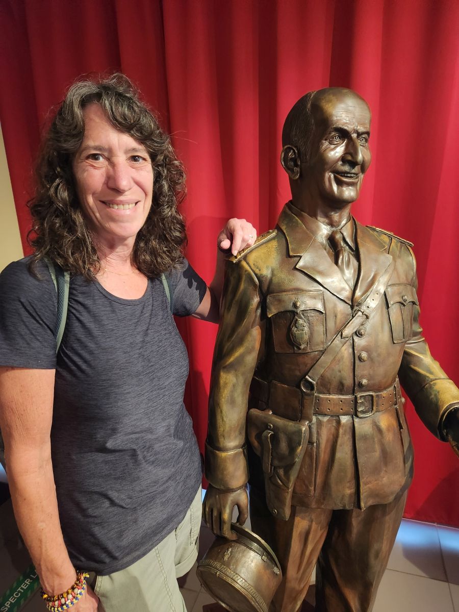 Leaving the citadel, we walk back into town to the Gendarmerie and Cinema museum located in the old Gendarmerie building. Even though we know nothing about French cinema, this turns out to be a great visit. Most of the first floor is devoted to a local French comedian/actor, Michel Galabru, who made a series of movies about Gendarmes beginning in the 1960s and continuing for 18 years. He sounds like he was the most interesting man – lots of stories (thankfully translated in English) about who he was, what he did in life and how he acted. It was really quite a fun exhibit. The 2nd floor had a whole room full of exhibits on the actual Gendarmerie, actual desks that were used there and an entire display about how the Gendarmes were conscripted, where they lived and how they came to build a barracks like building to house them all.