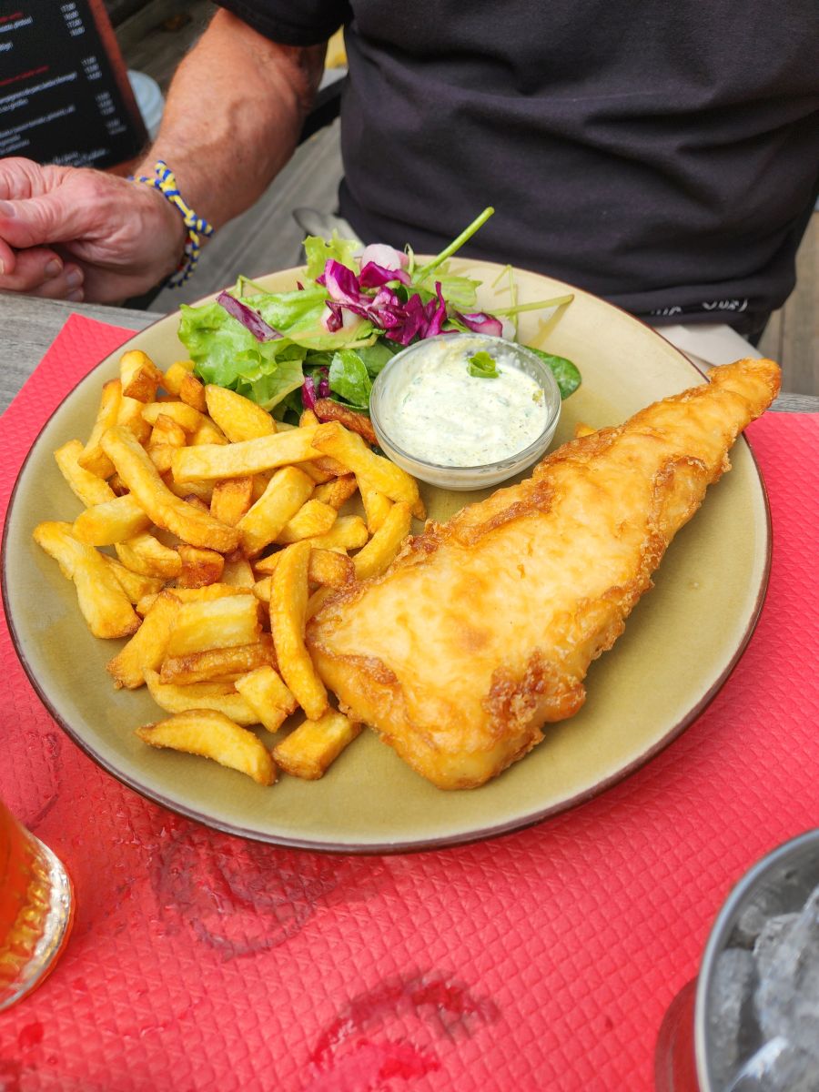 This is the cutest place. The décor is all beachy, but in a really relaxed, campy sort of way. Not the hoity-toity St. Tropez way. The menu is great. I don’t know if anyone here really speaks a lot of English, but we make do and manage to order the fish and chips and the goat cheese salad. We start off with a little dish of lentils being delivered to the table that we really don’t know what to do with – until we watch the guys next to us who just eat them out of the bowl. Our main meals come, both of which are huge and wonderful, and we just hang outside in our garden table enjoying the food, the weather and the ambiance.
