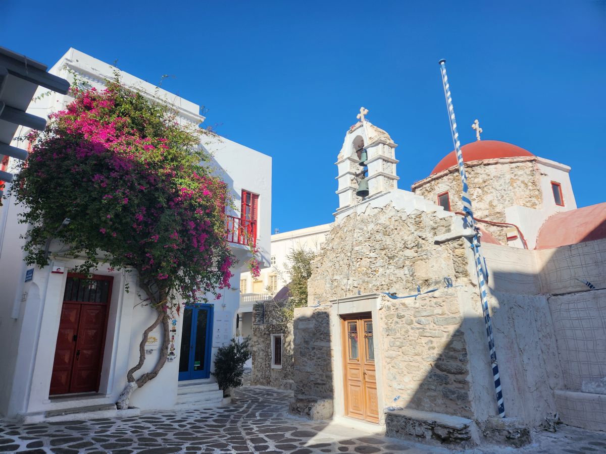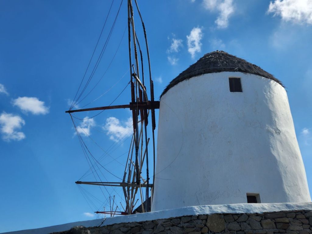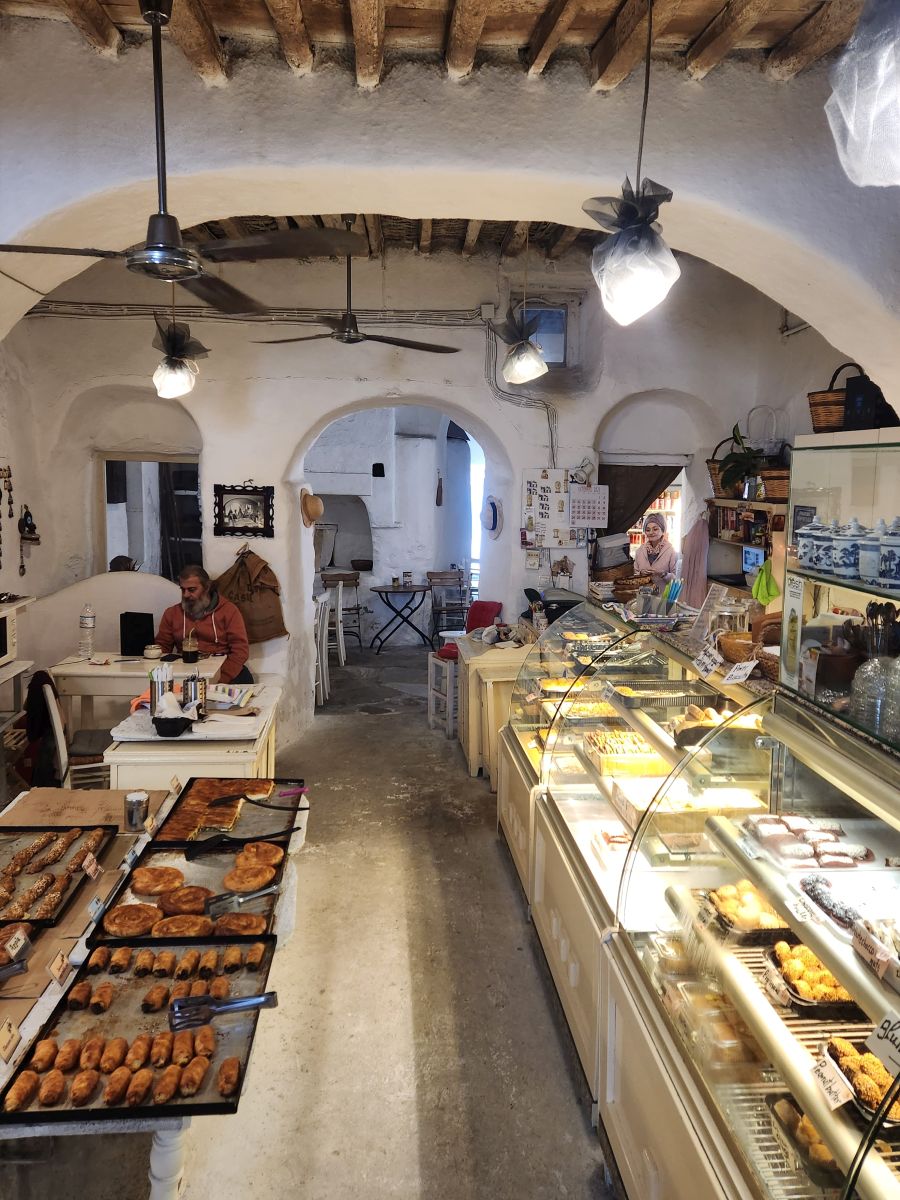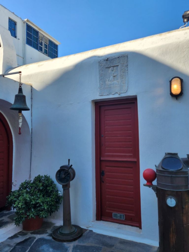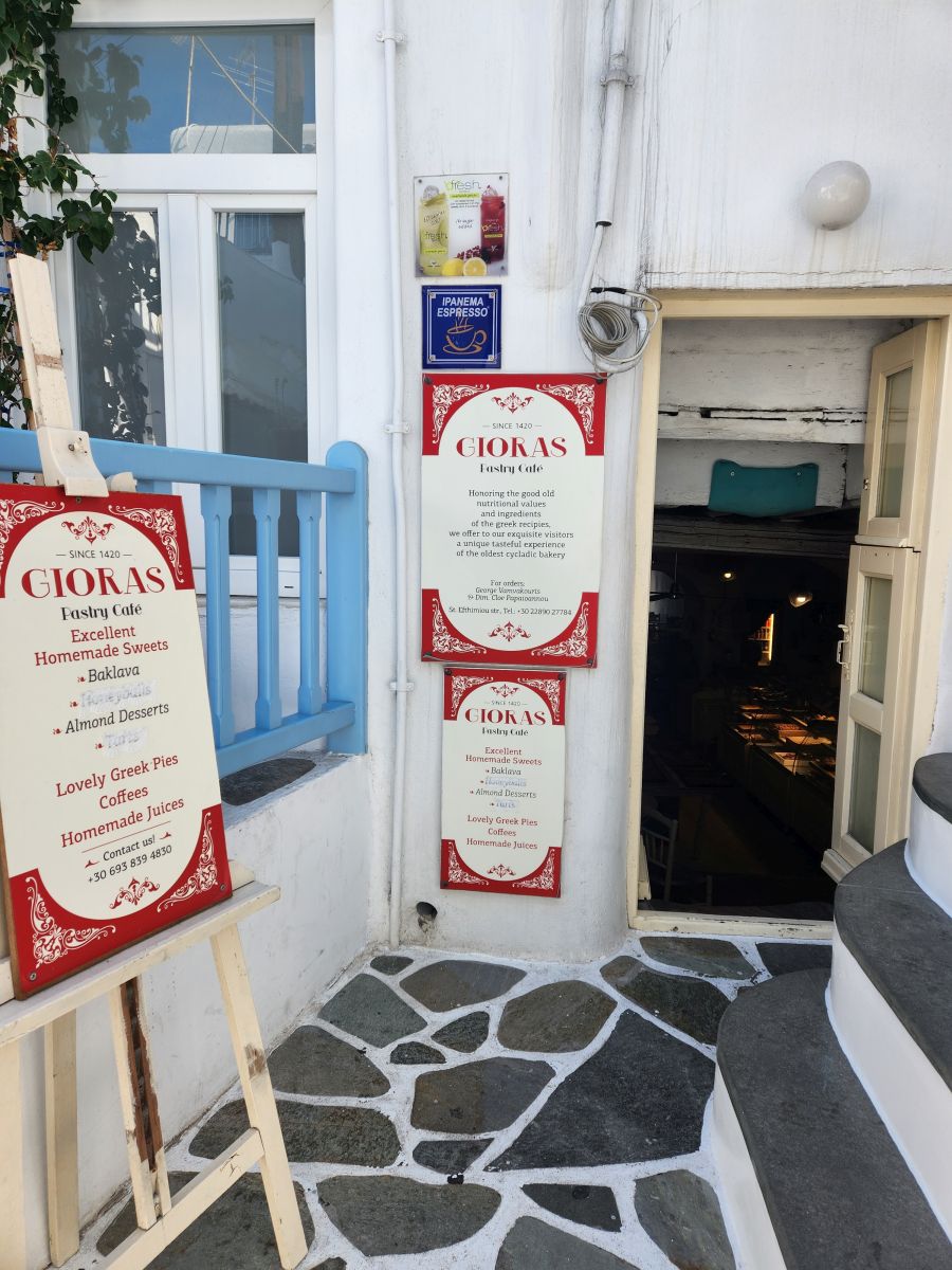Time wasted, we slowly walk the little cobblestone streets browsing the shop windows and restaurants. Still too early for the museum, we find Gioras, open, yes! And walk in through the short doorframe, navigating down the 5 steep stone stairs to ensure they will remain open after we visit the museum, talking to a lovely woman whom we assume is one of the family members who has owned and operated the bakery for over 200 years. Gioras (the Mykonos dialect for George, the baker) is one of the last wood bakeries in the Cyclades and has existed since medieval times, dating back to the 15th century. The entire building is hand made of stone, hay and wood – and has remained so since the beginning of its existence. The wood used for the ovens is recycled left over wood from all over the island. As it turns out, it is a good thing we are here now, as they close November 3 for the season – which is why we missed them last year! Timing is everything, as we know very well.
