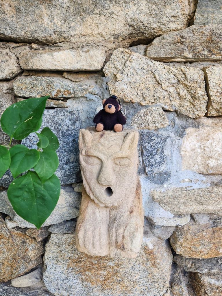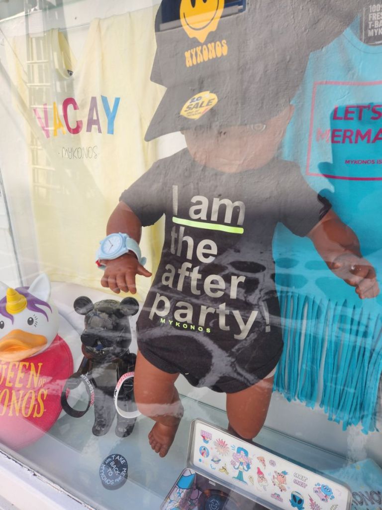 Besides the conversation, it is so nice to sit here in better weather and enjoy our coffee and people watch. The walking tours. The individual ship people. Other island visitors. The locals doing their best to swerve around the googly eyed tourists. It is quite the entertainment – and this isn’t even what the island is known for – we can’t even imagine it at night. Crazy town for certain (as this one doll in a shop reflects!).