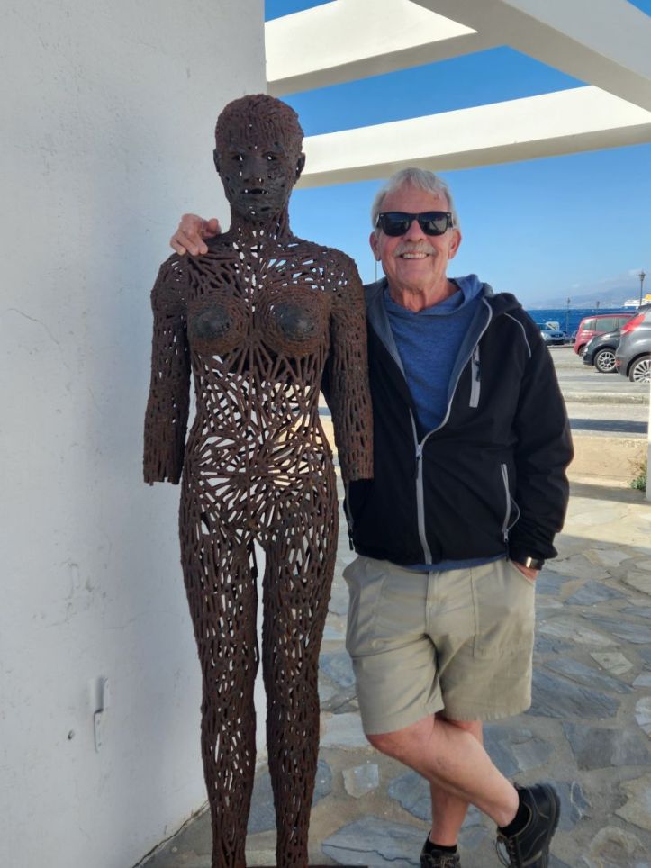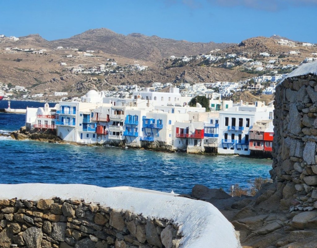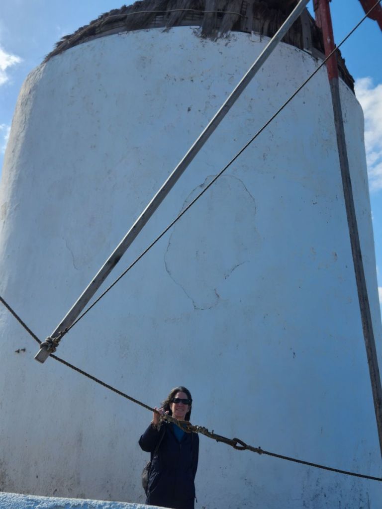 So, we go back to the little café we hid out in when the weather was so awful in November last year. 2 Cappuccinos (Yep, it’s Mykonos! 5 euros each!) and a darling waitress from Serbia who talks to us for a long time. Tomorrow is her last day of work – winter season begins on November 1, and she is going home. Then she will go to Thailand. Which of course begins a whole discussion of when and where and we suggest she visit Chiang Mai and tell her we will be there as well as Bangkok which is where she is planning to stay for a while to learn the language. Would that not be wild if we see her somewhere there?