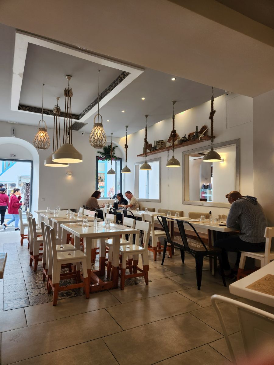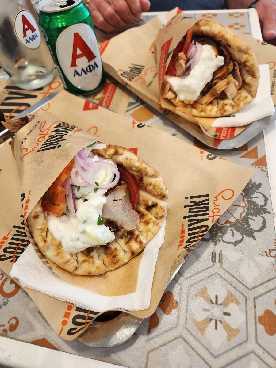 We had passed this place a few times and decided we’d just grab a pita sandwich here. It’s reasonably priced (except the wine and beer) and we were in the mood for souvlaki. Yikes – should have checked the size of these things though! We made the tactical error of ordering 2 – only really needed one, tbh. Sigh. At least we didn’t order them with fries inside. We can be thankful of that at least!