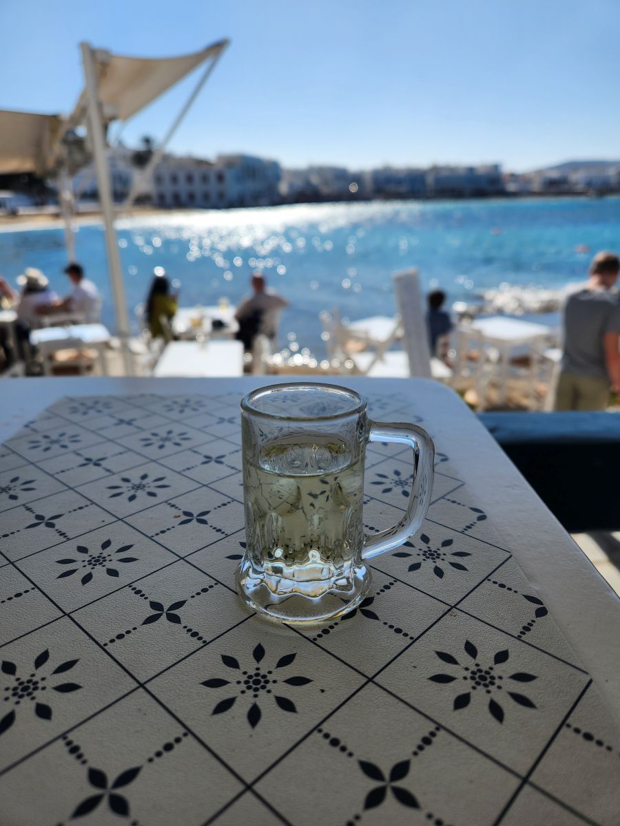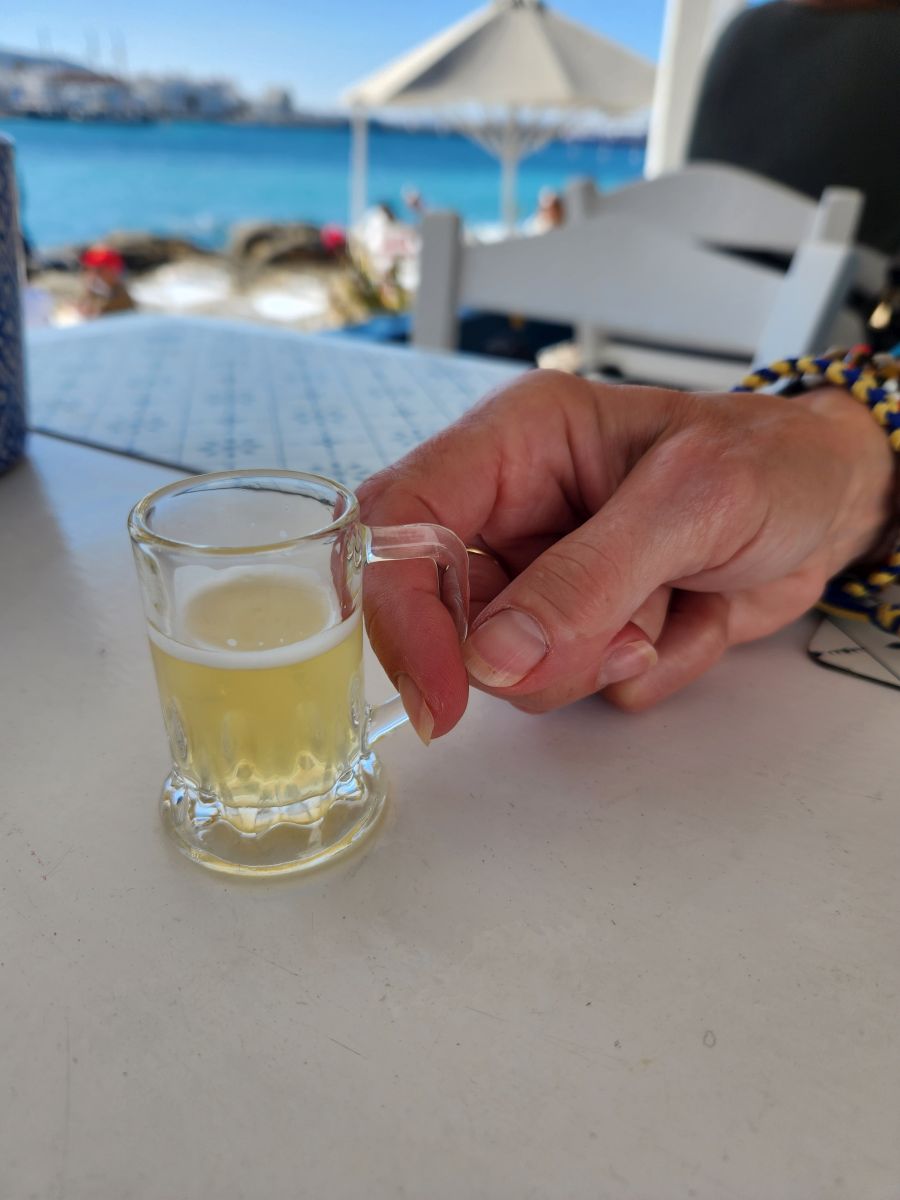But of course, before we go, we have to stop at Boboulas, “the least gourmet restaurant on the island.” We love that place. Right on the edge of the old port, with a lovely outside seating area up on a raised patio, we relax with a glass of wine (after a long conversation about what type of chardonnay the wine actually is, the waiter assuring me it is good, then giving me a “shot of wine” to taste in an adorable miniature beer stein) and beer, watching the masses pass us by heading toward the shuttle. Just listening to conversations is extra entertainment. People can be so humorous.