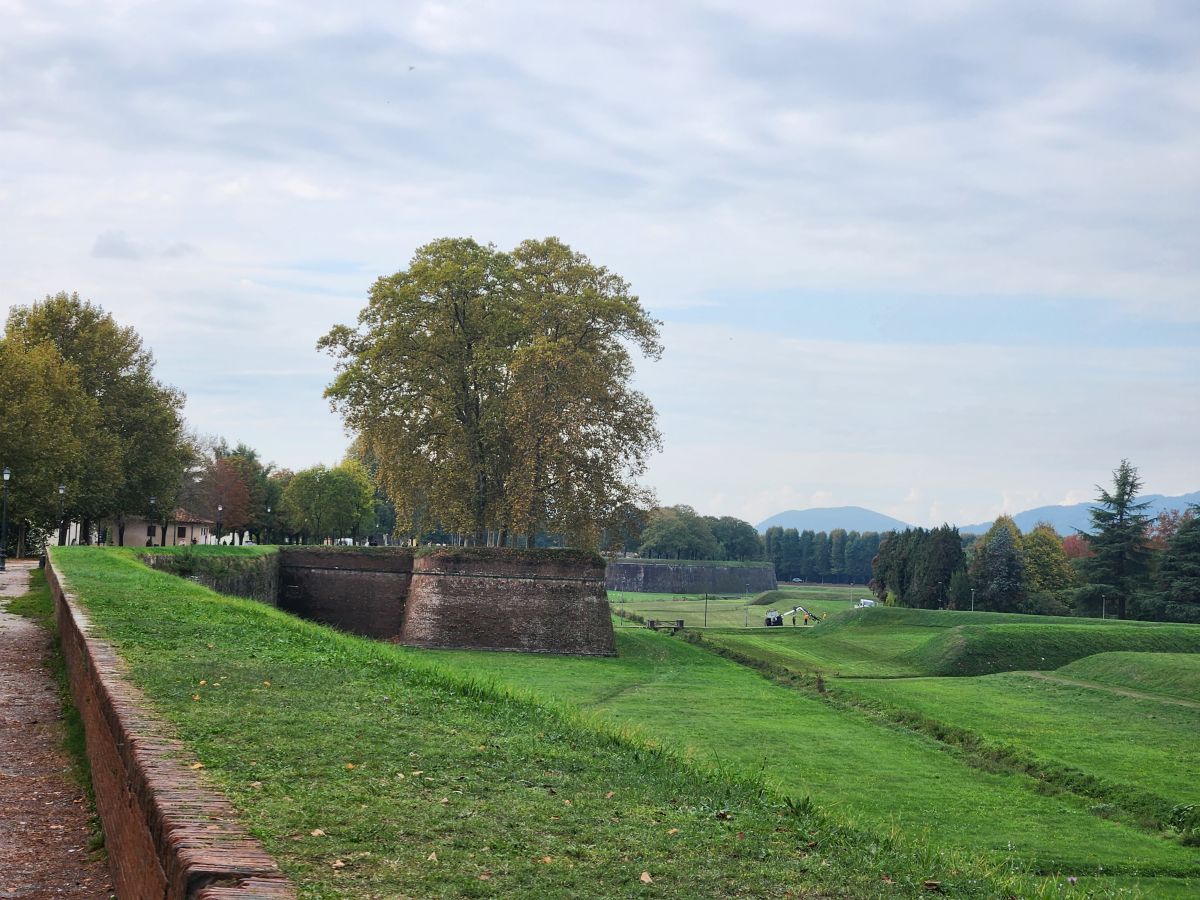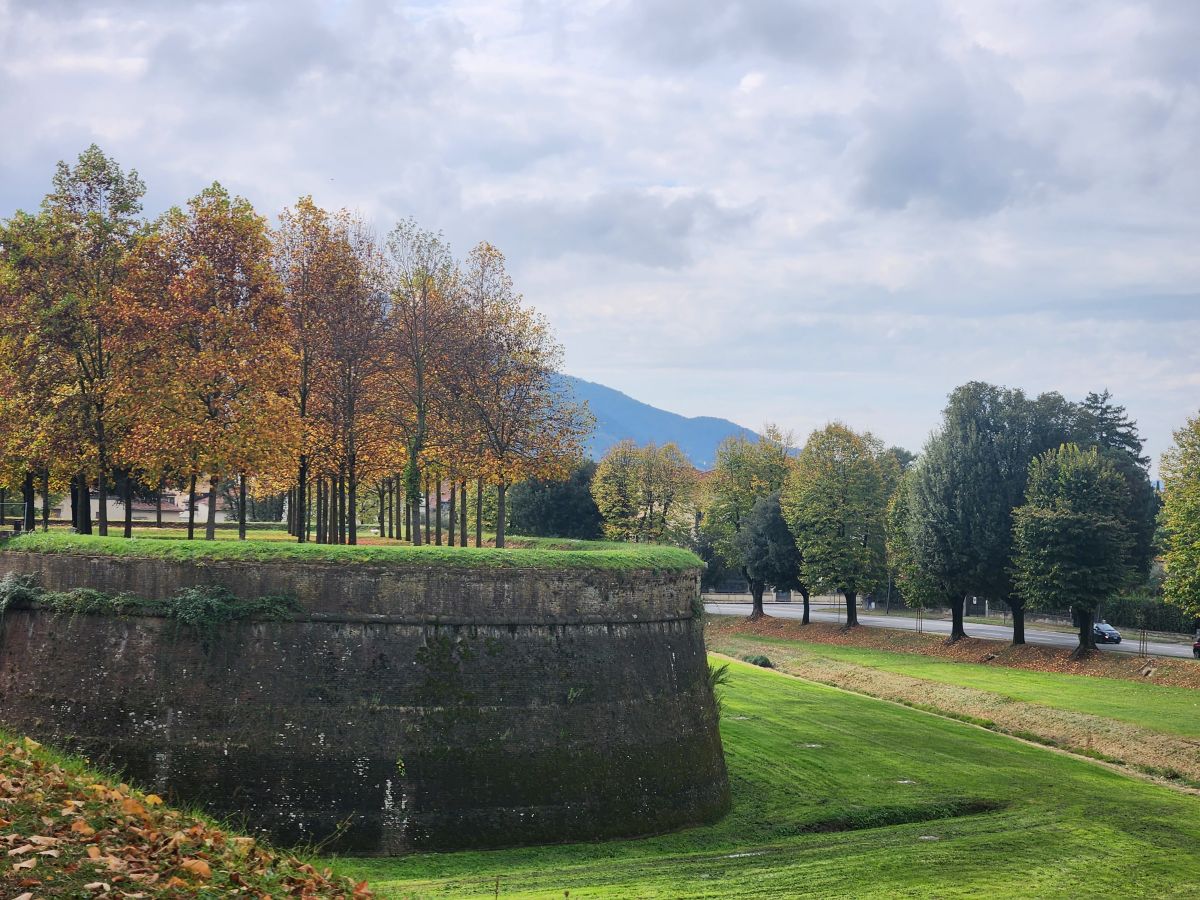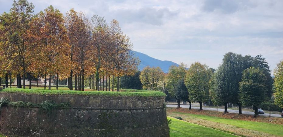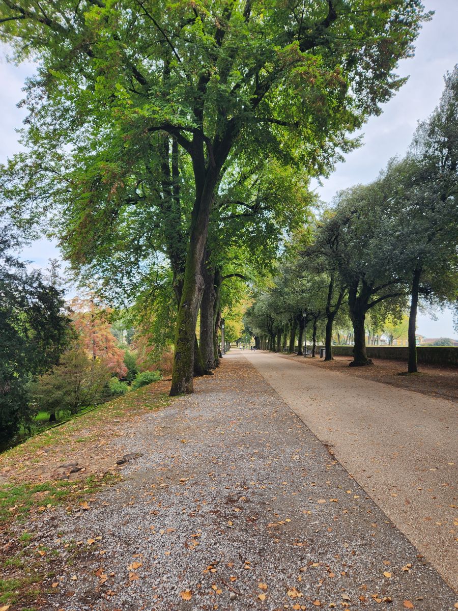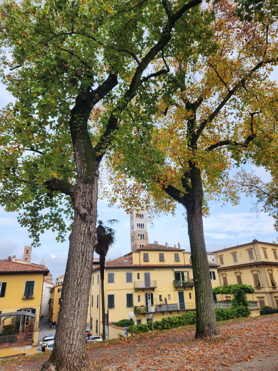 It is a beautiful fall day to be walking the walls. Falling leaves with vibrant colors line the wide walkway atop the walls that circle Lucca. From up here you can see the beautiful architecture within the town, as well as some of the older structures that are more ruins than fixer uppers. And of course, all the fortifications of the old city walls are eye catching and photogenic in the pretty fall colors.