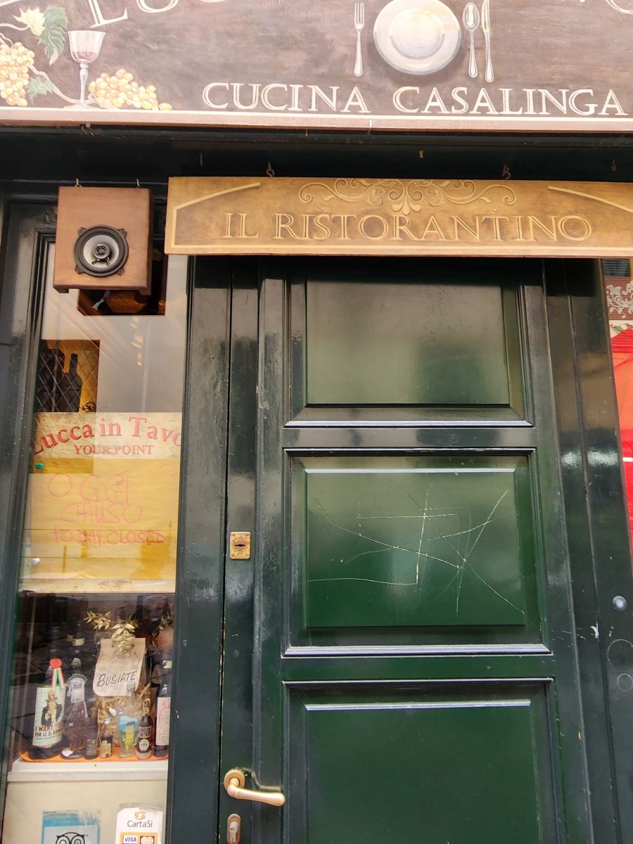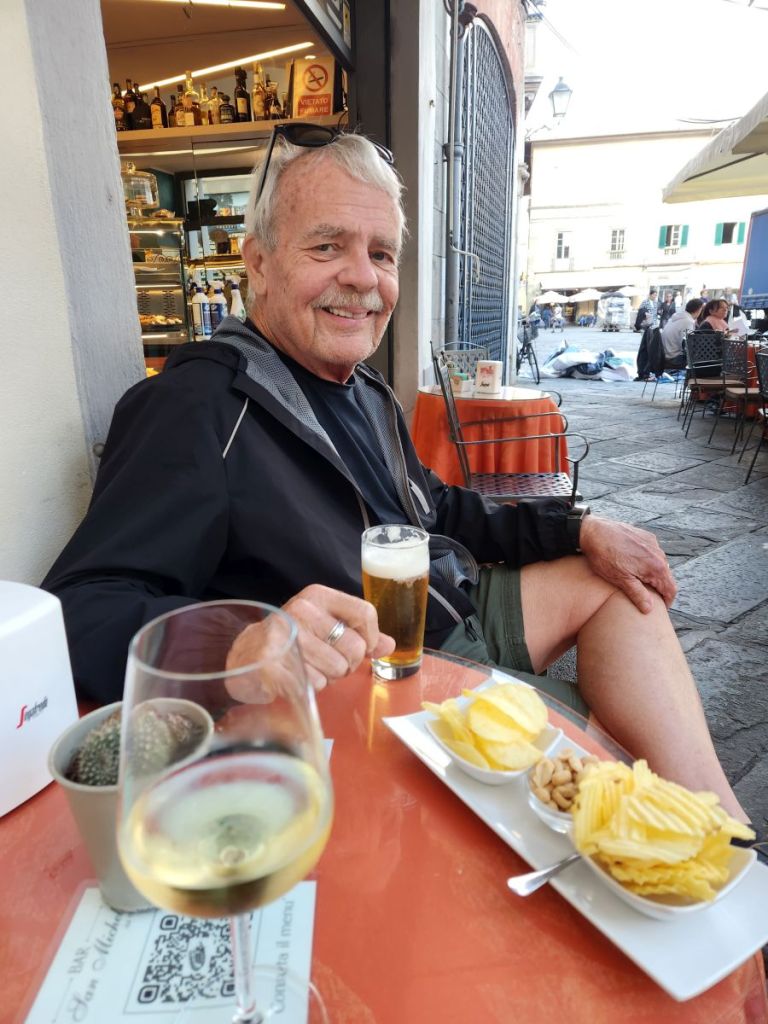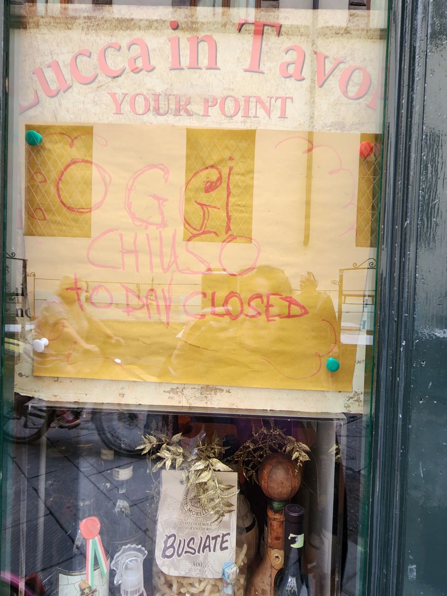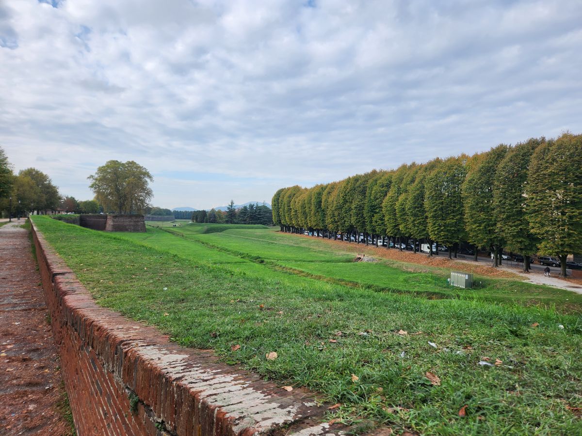 Wandering through Lucca, we stop at a café for cappuccino with all the old ladies who obviously go there every morning for their coffee and pastries (totally local, so fun), then meander around a bit, heading toward the town walls for a morning walk. On the way, we pass by Lucca in Tavola, our favorite restaurant where horrors upon horrors – there is a sign in the window that says they are closed today. No! Timing may be everything, and it has failed us in this respect. Bummer! We’re hoping that maybe the sign is from yesterday and they’ve not taken it down yet – it is early after all. Figuring we’ll check after our walk, we head down the street to the rampway up to the wall walk.