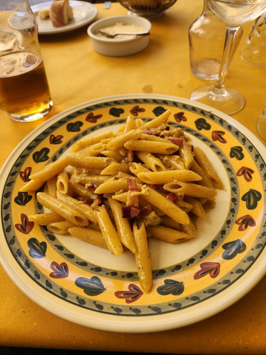 Sitting outside, we enjoy a fantastic lunch of antipasto, pasta carbonara for me and spaghetti a cinghiale for Ed (how can we not have cinghiale when in Italy?). All excellent and inexpensive and while not Tavola, an excellent alternative in our minds!
