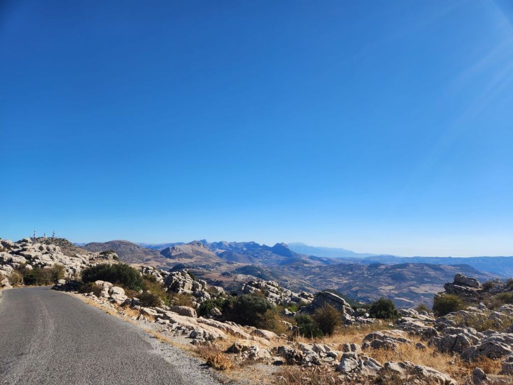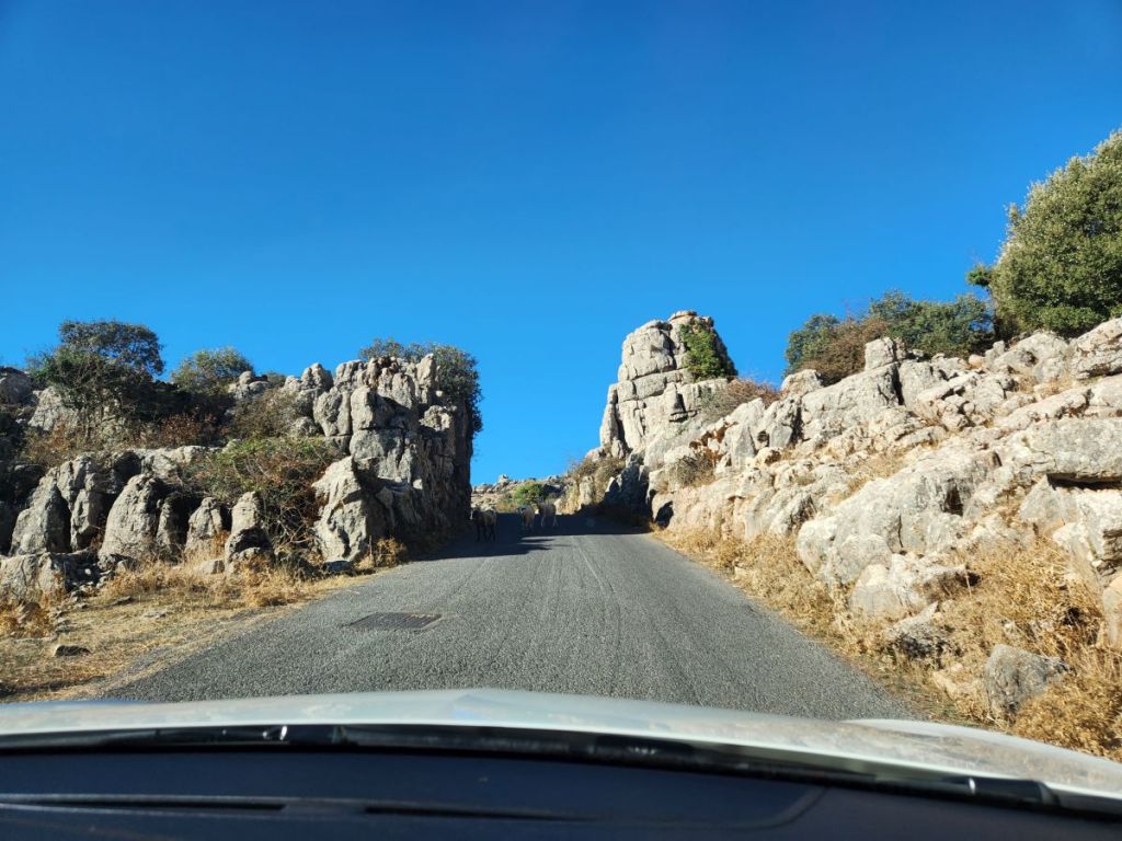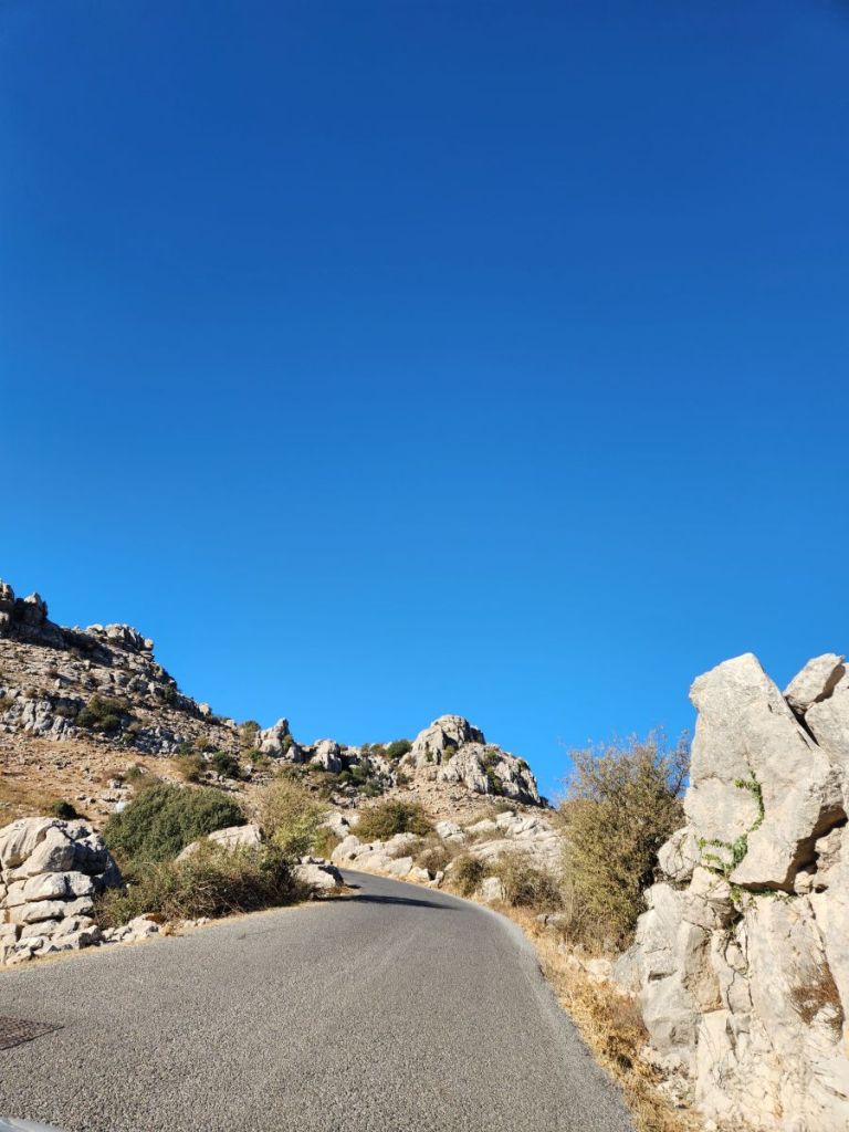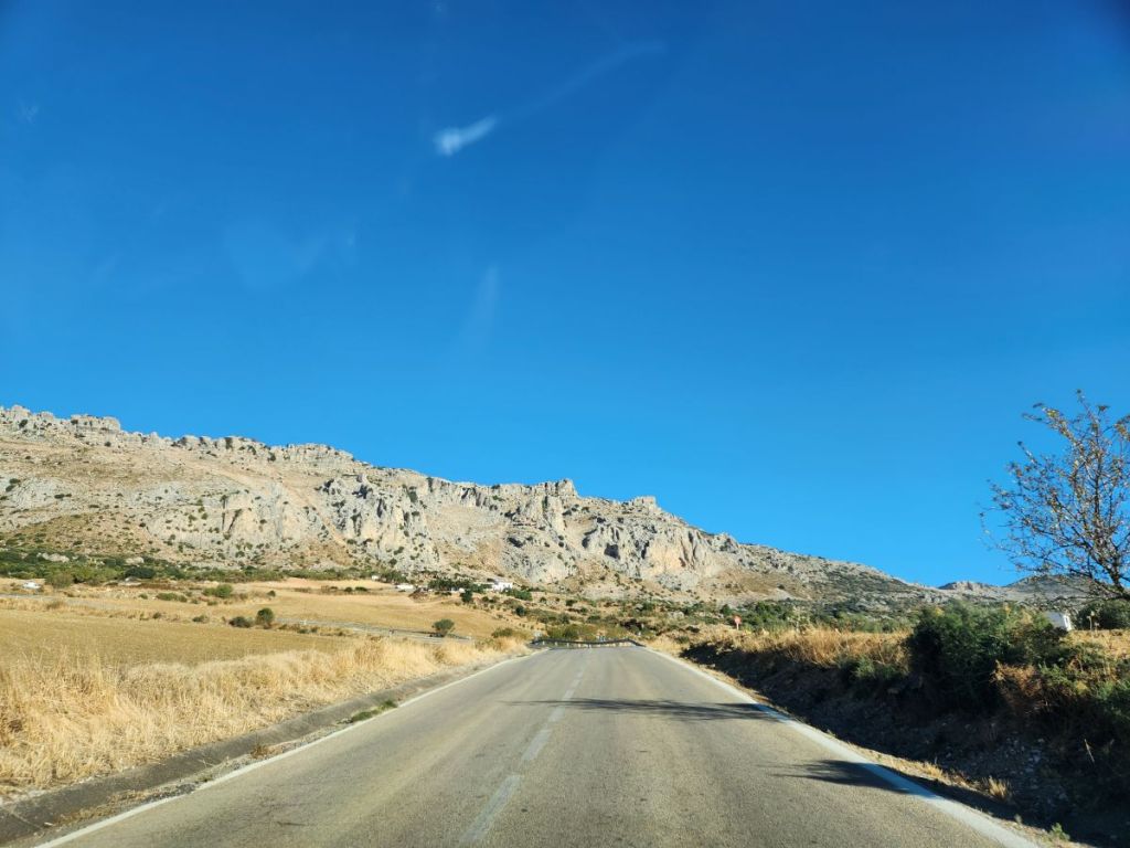And we are off. Quickly making our way through Malaga’s waterfront and onto some little narrow side streets that eventually lead us to the road that will take us up into Antequera. The roads are good, if not a little narrow as they start their steady climb through farmland and scrub, reaching ever higher until we see the craggy karst range ahead of us. The views are spectacular even here.