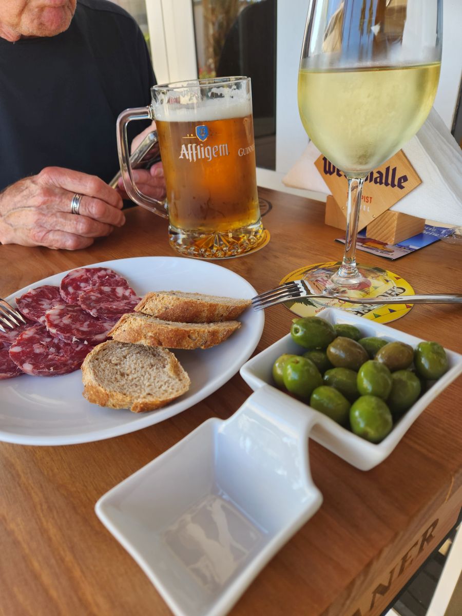 But, as this is our 3rd time here, we sort of know the lay of the land, and knew we could just walk across the street and find something that would suit our needs. And, of course, we did – at Cerveceria Unterturkheim, a wonderful little German beer bar (of all things) – where we had excellent beer and wine as well as some great spicy olives (which I tried to order extra but think they just came with the drinks) and a plate of local sausage (which we did order extra!).