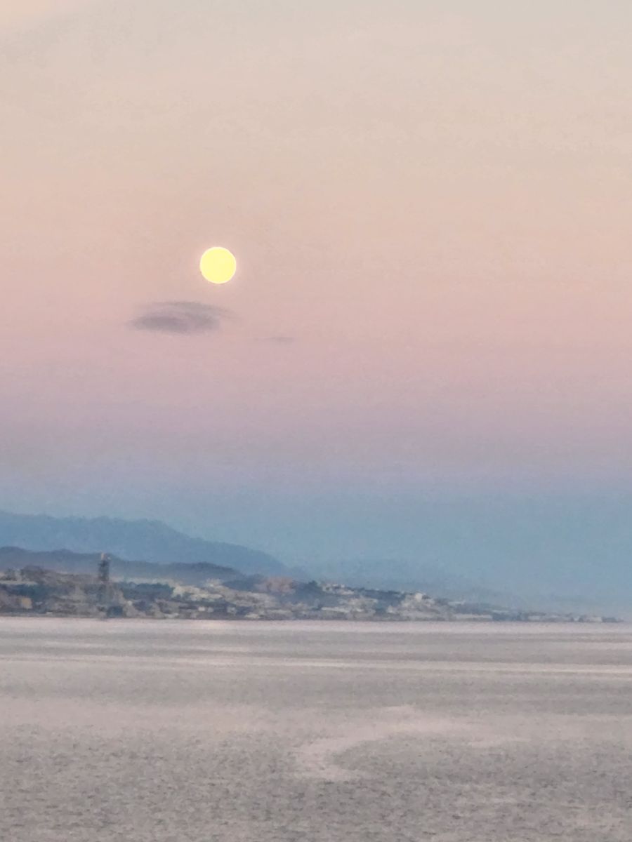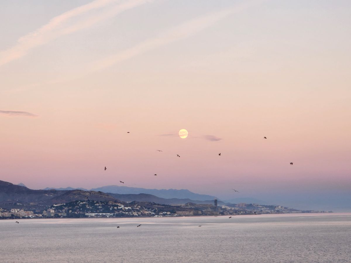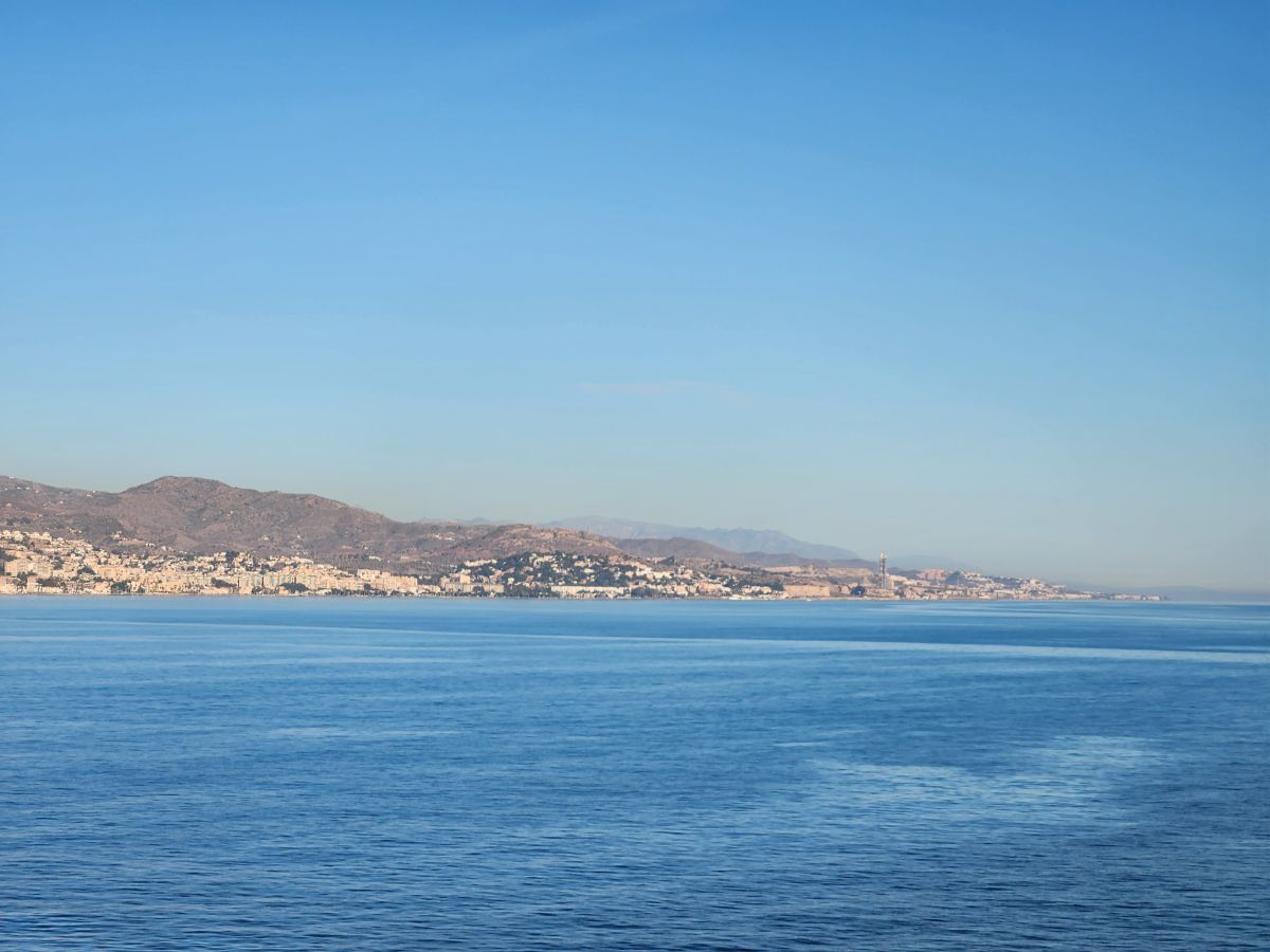 Time to stroll back to the terminal, take the shuttle (fortunately driven by someone other than newbie girl) and hang out the rest of the afternoon aboard, taking some great photos of the coastline from our cabin. And then later, the sunset over the concrete factory way in the distance (where we cycled past on our last visit here in Malaga!).