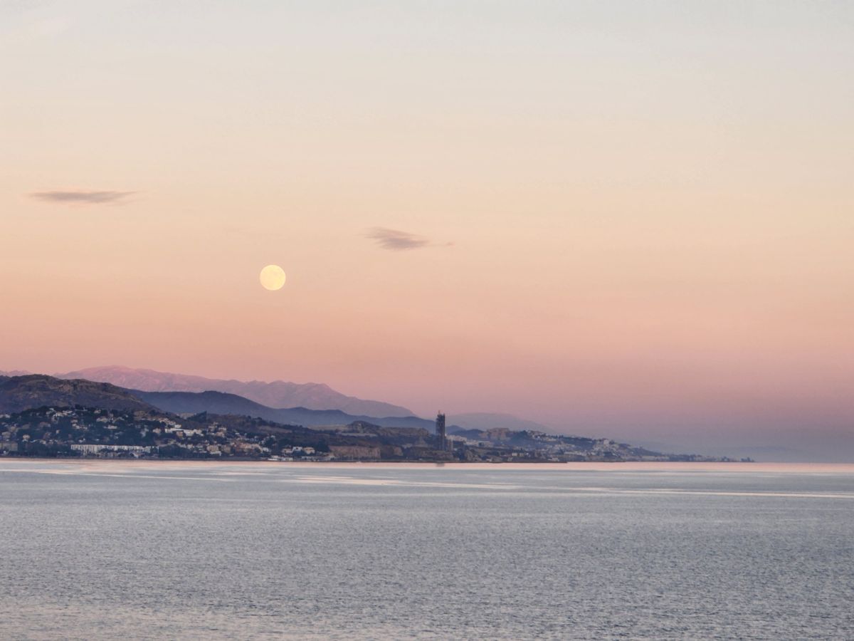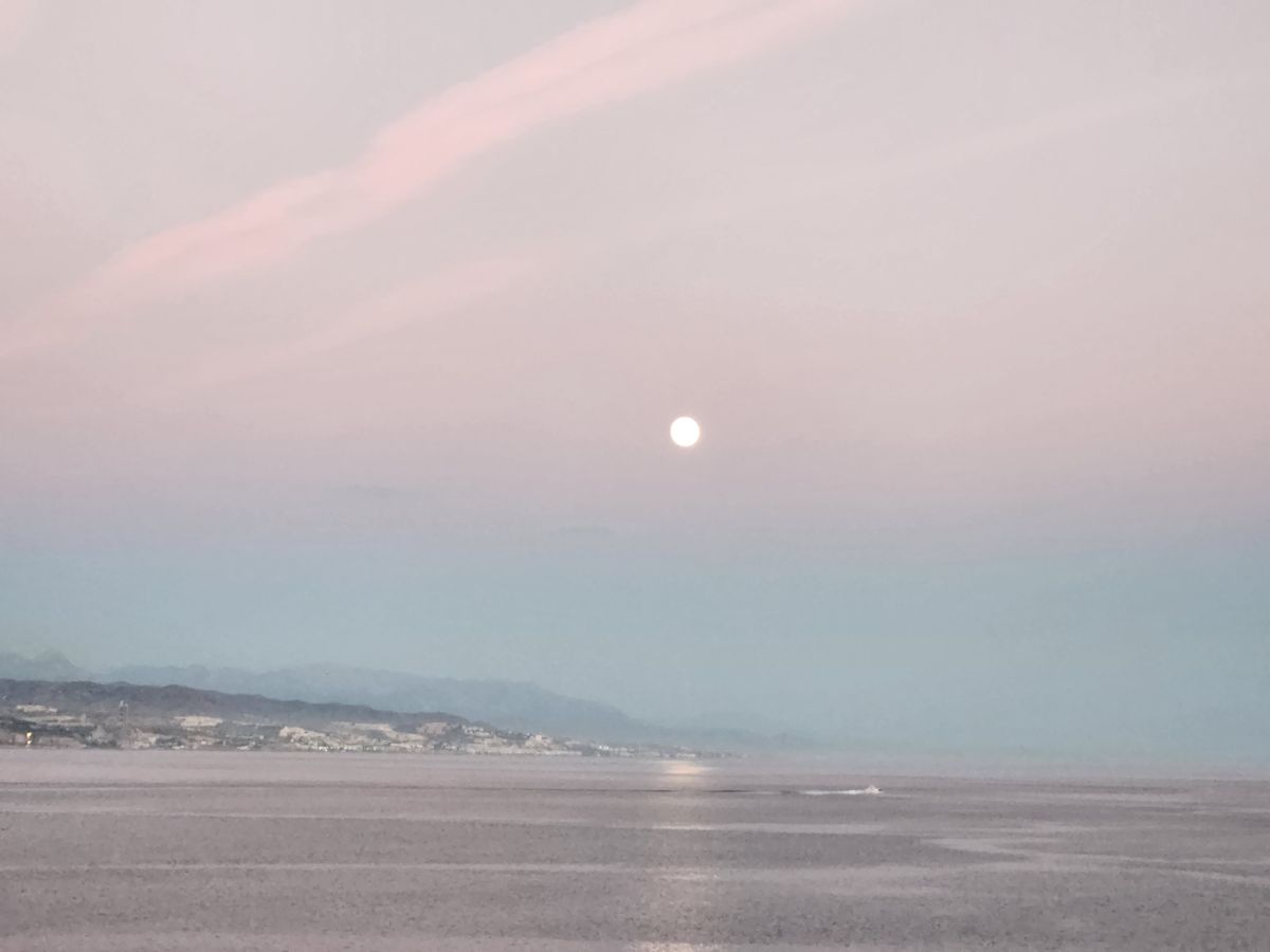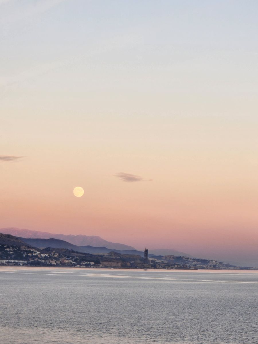Time to stroll back to the terminal, take the shuttle (fortunately driven by someone other than newbie girl) and hang out the rest of the afternoon aboard, taking some great photos of the coastline from our cabin. And then later, the sunset over the concrete factory way in the distance (where we cycled past on our last visit here in Malaga!).