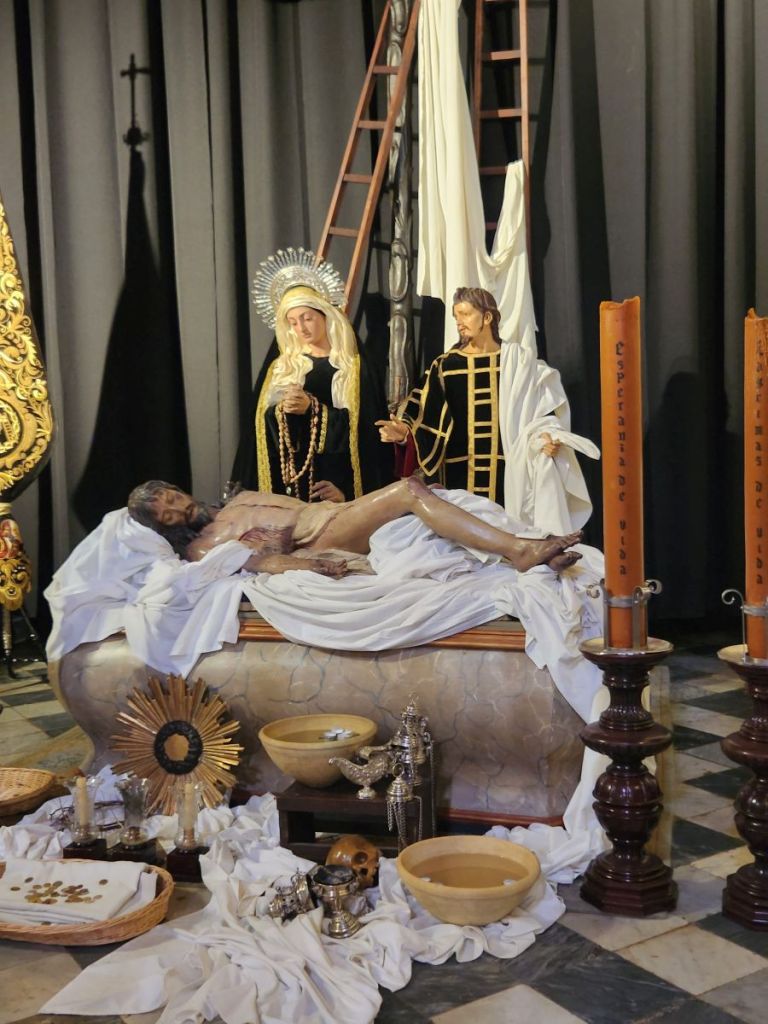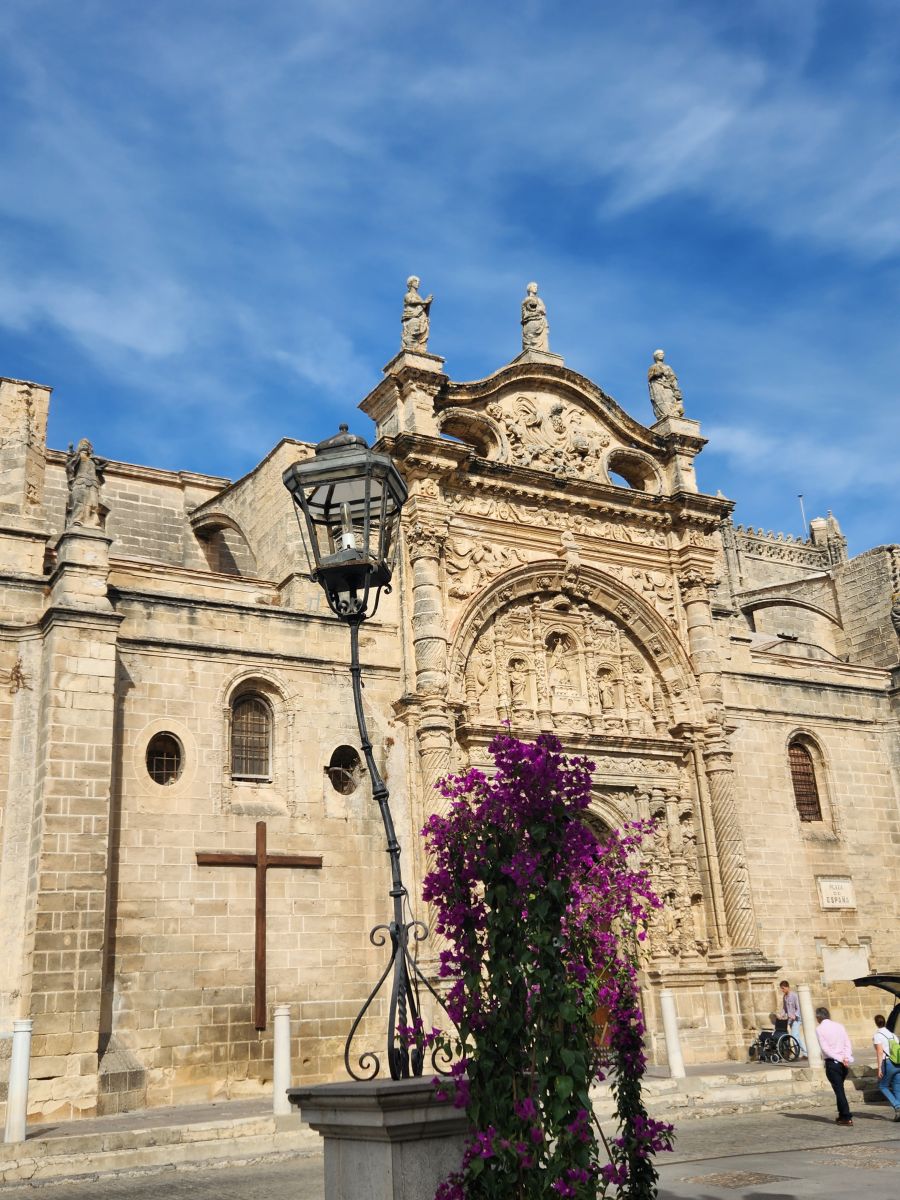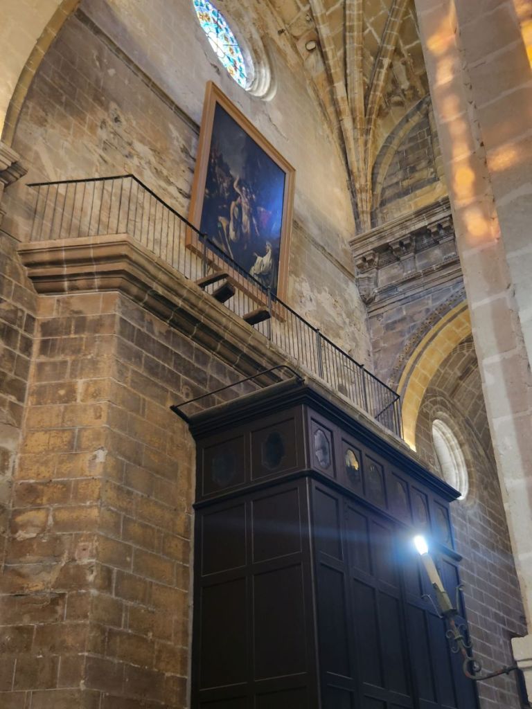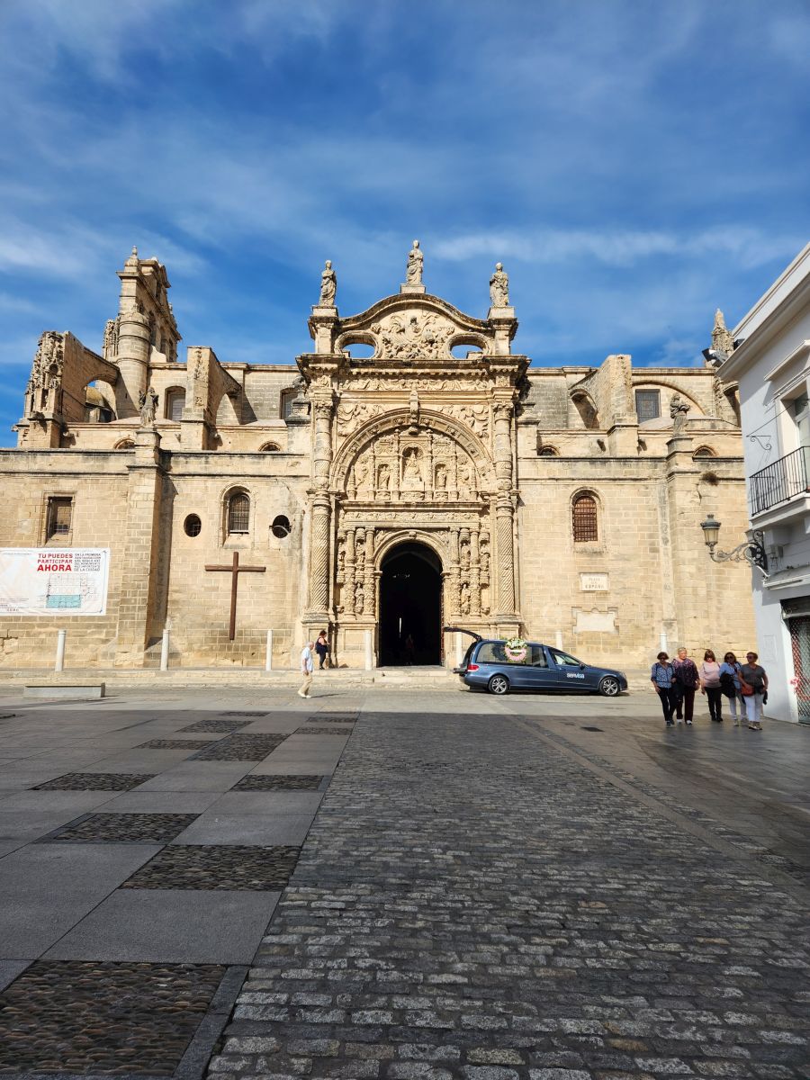 We make it to Santa Maria with only a couple of wrong turns, finally finding the parking garage in the middle of town and successfully stuffing our little Fiat 500 into a space in these miniscule underground garages. Out on the streets, we wander past the Ayuntamiento, a stately building at the edge of our parking garage, and beautiful houses on the narrow one-way cobblestone streets. Our goal is the restaurant we have chosen for lunch, but it is still too early to eat, they aren’t even open (this is Spain of course, it is only 11:30, so no respectable restaurant is even open as of yet) so we continue on to Plaza Espana and the Iglesia Mayor Prioral, a very picturesque plaza and church where there happens to be a funeral going on as we arrive.
