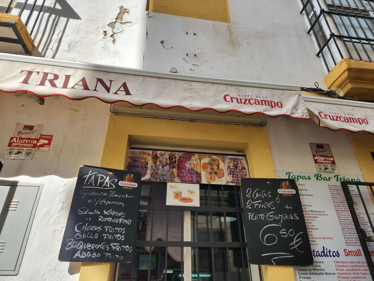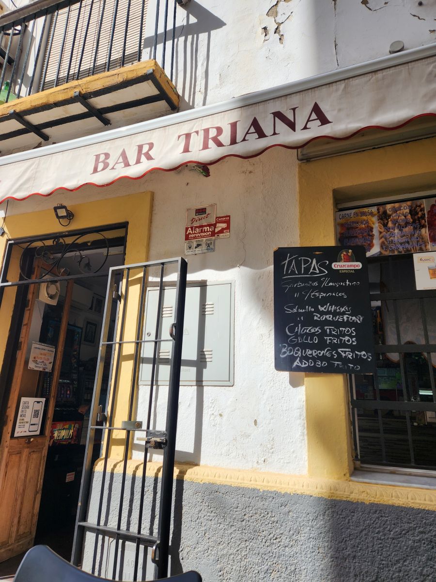 Ok, Plan B. Which we don’t really have, but we did spy a few cafes open on our wanderings to and from the Bull Ring. We settle on Bar Triana, a little café that has people sitting outside (always a good sign). This is truly a tapas place – and truly local – as everyone here knows everyone and they all are chatting amicably with the waitress and each other. Fun.