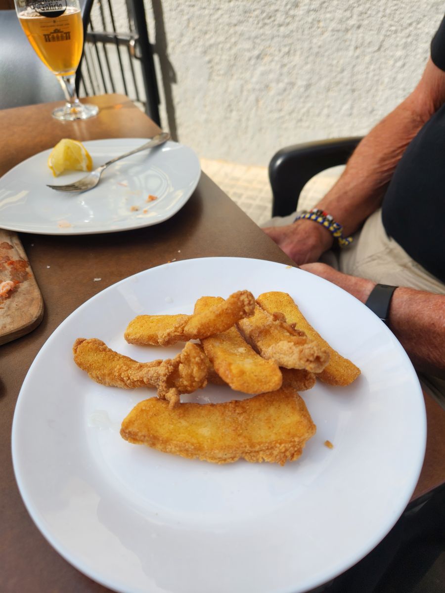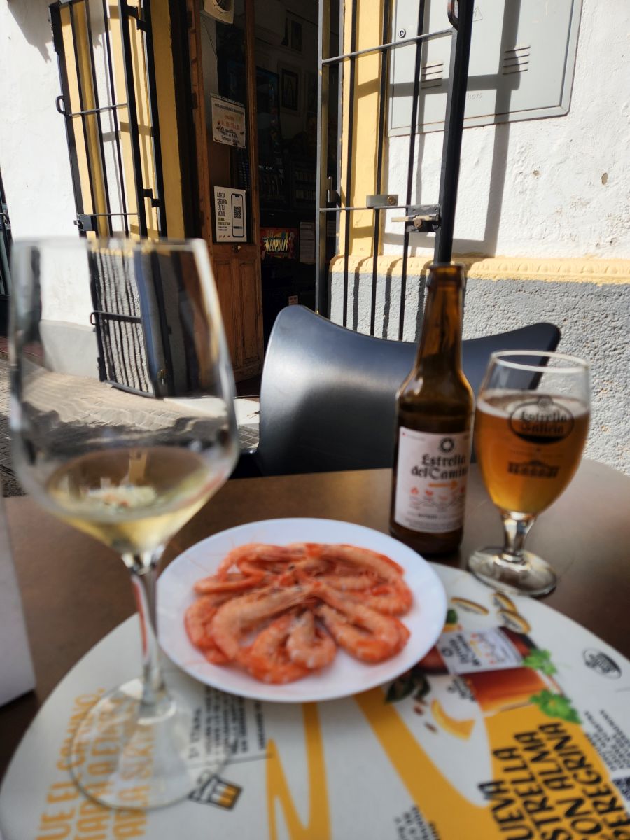 The menu is hanging on the wall, but we ask for a printed one as well so we can really study it without looking too out of place. I spy a sign that says 2 canas or 2 finos y platos gambas for 6.50 Euros. Really? I’m not sure what finos are, but there is a photo on the wall with wine, so, hey, what the heck. 2 glasses of wine and shrimp? Yeah, we’re all in. Ed orders an octopus salad, which turns out to be more a potato salad flavored with octopus bits that is absolutely delicious, as well as chocos fritos (fried cuttlefish). Perfect choice! Oh, and the cost? 15.80 Euro. Really. We’re moving here. Well, no we’re not, but still….come on….
