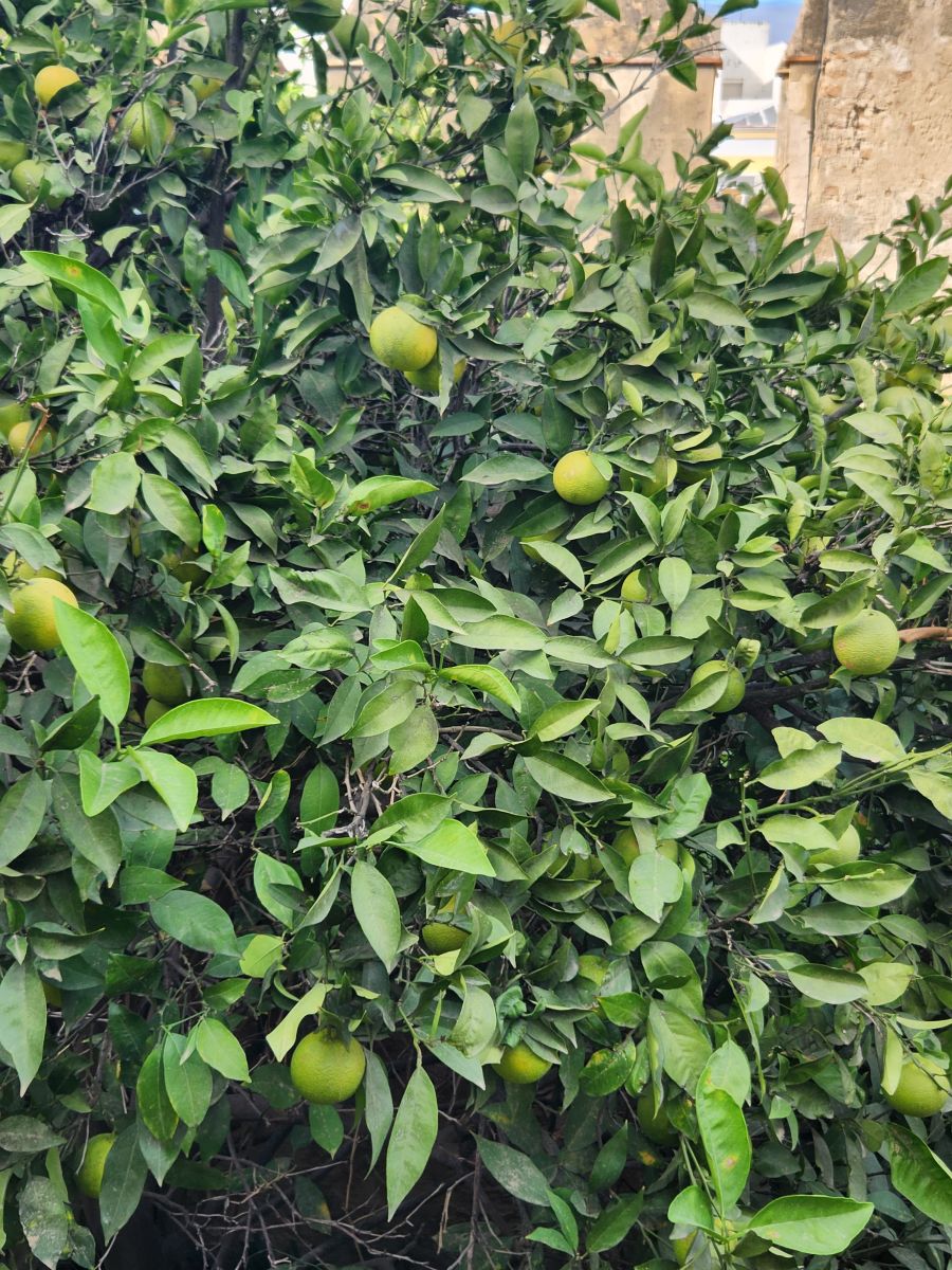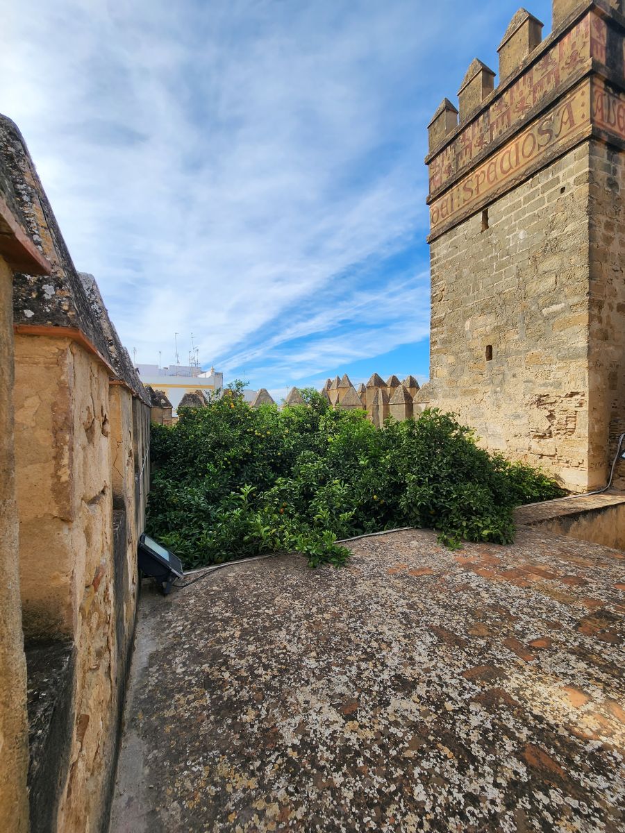 Climbing the steps to the upper walls, we come out in a narrow walled area that opens up to….the orange trees!!! Which are lush and full of oranges above the courtyard. Crazy. Never seen anything like that. I wanted to pick the oranges, but thought that might be frowned upon.