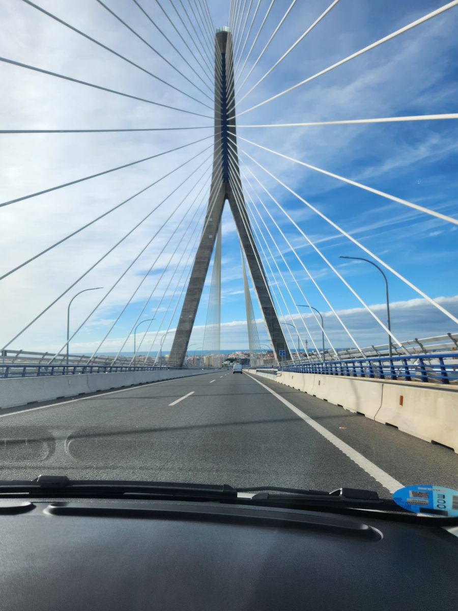 Heading back toward the garage, we stop in the Plaza de Cristobal Colon for a snapshot of the Columbus mosaic, then wind our way back to the garage, extricate our car and drive back to Cadiz over that cool huge suspension bridge.