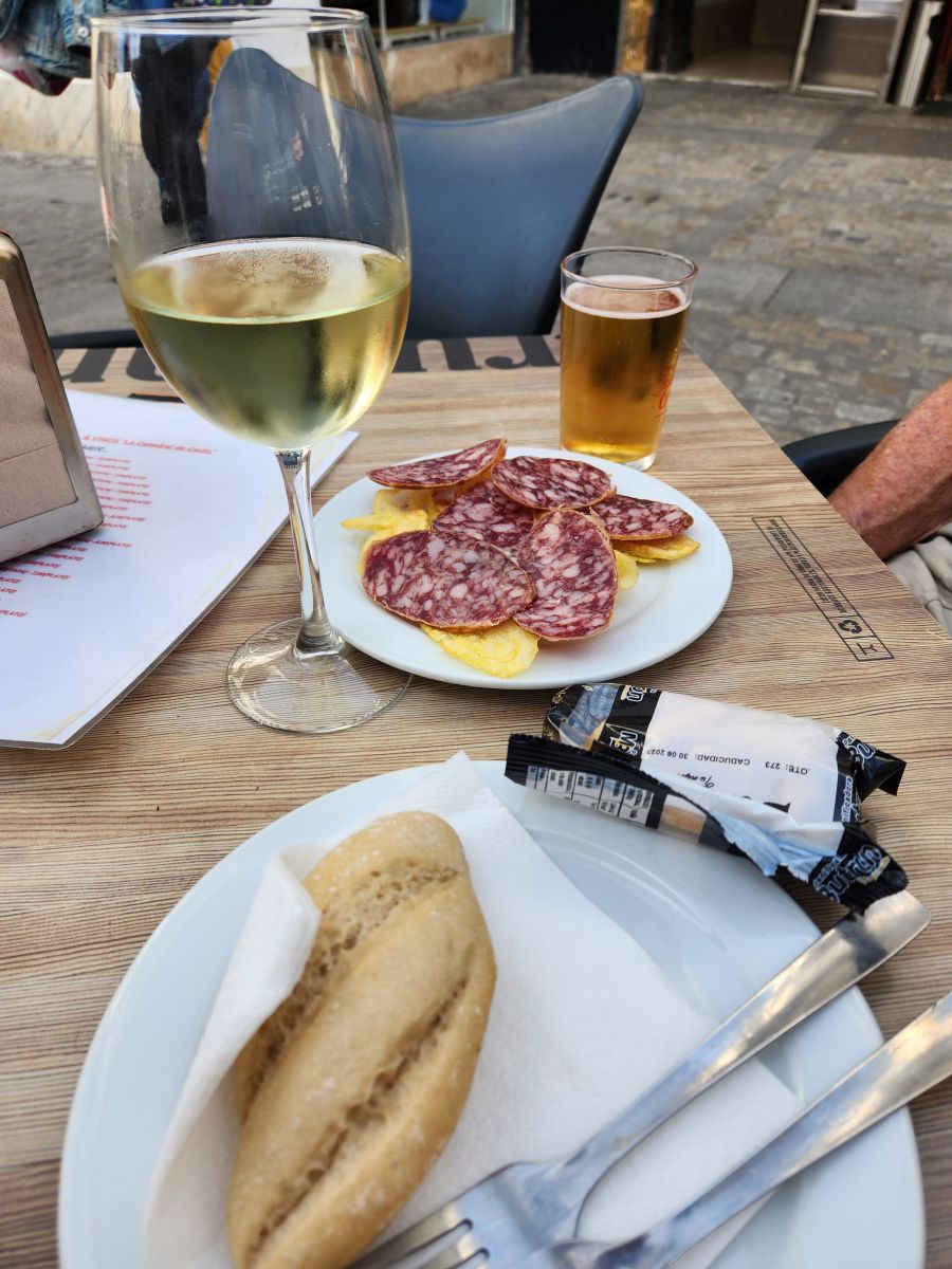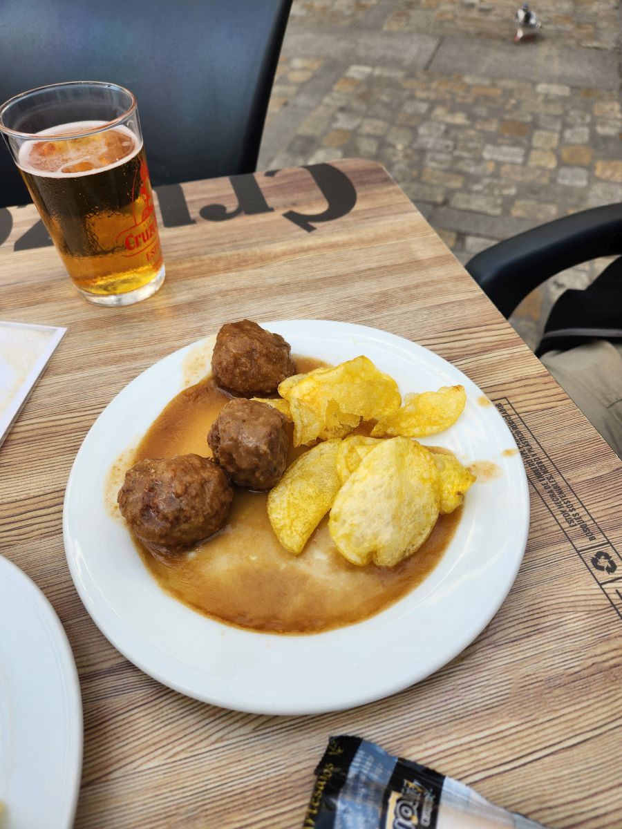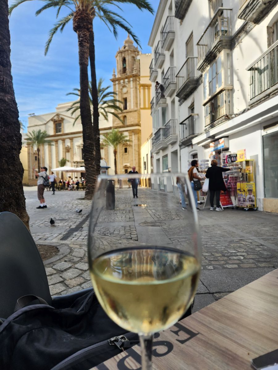 Car successfully returned, keys dropped, we meander through the busy streets (ships!!) of Cadiz, settling into a table at the Cathedral restaurant on the plaza across from the Cathedral de Cadiz. More snacks ensued – albondigos, salami, beer and wine. Our last tapas in Spain. Sigh. It’s been a great time in this country, really can’t wait to return soon!