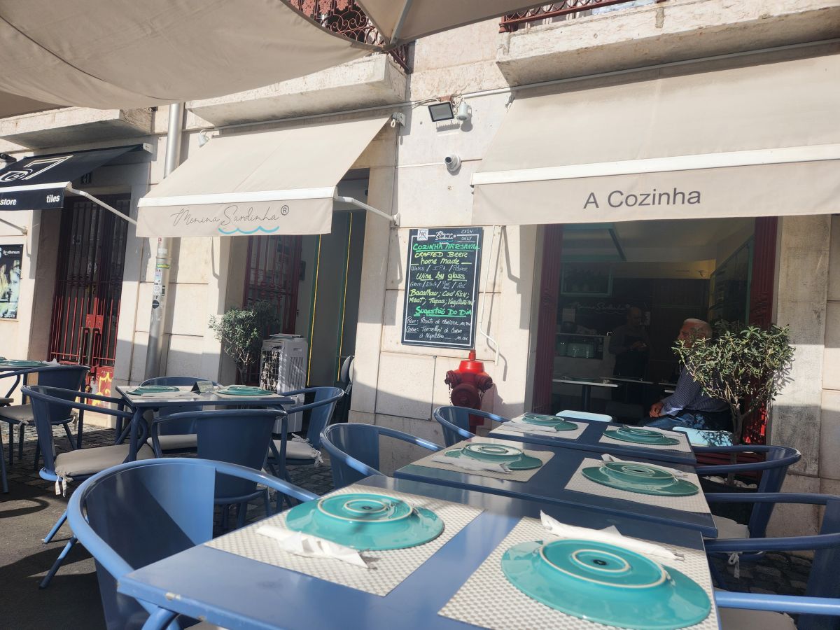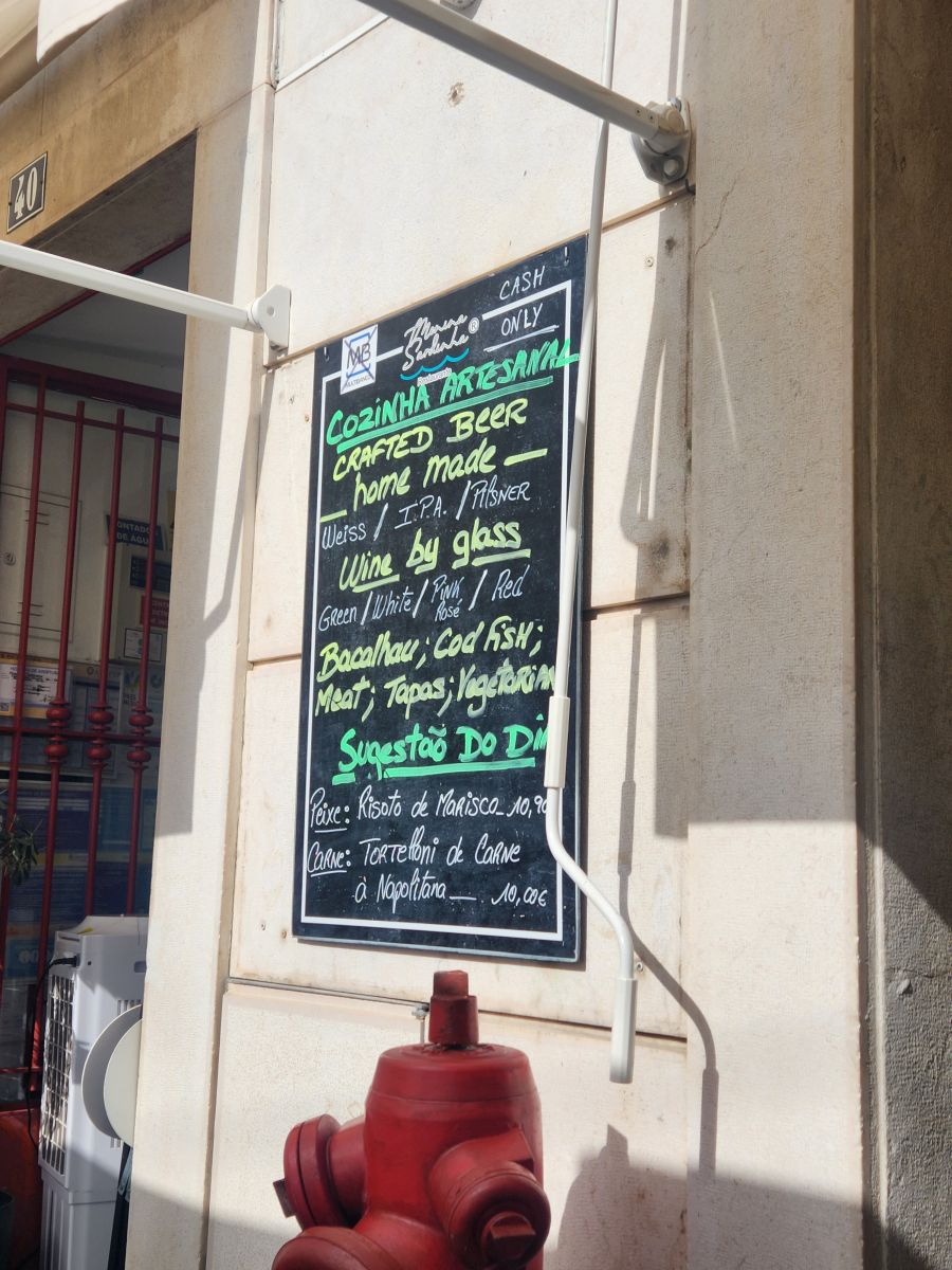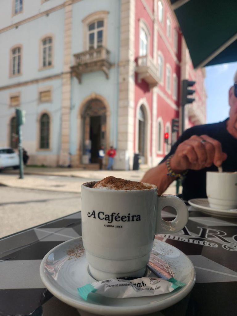 First things first – cappuccino! On the sidewalk right outside the station. Perfect. Then a nice little stroll through town to Menina Sardinho, the lovely turquoise restaurant where the owner sweetly made up cappuccino on our last visit but we never made it back for food. This time they are just about to open, having their service meal, and we can sit outside at a table to wait until they are ready.