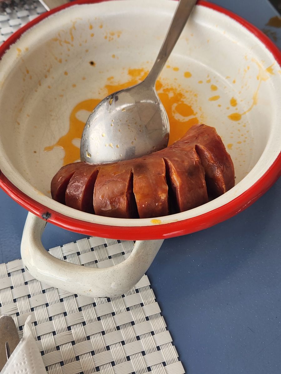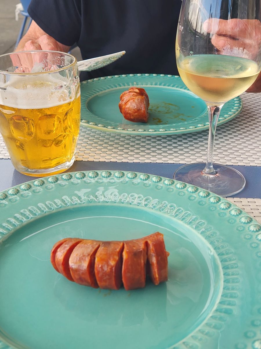 We tell them not to rush and bask in the great weather – alternating between sunshine and super menacing clouds, but clouds that keep the temperatures nice and cool. Perusing the menu, we were going to go with seafood and maybe try the sardines (horrors) but ended up with the flaming chourico (which we love) and the special pasta of the day, tortelloni de carne a Napolitana, which the owner says is excellent today. Ok, we’re game. A fabulous glass of wine, an artisan crafted beer brewed right on the premises and we are happy little campers. We even get a video of the flaming chourizo, lit afire right at tableside. Fabulous.