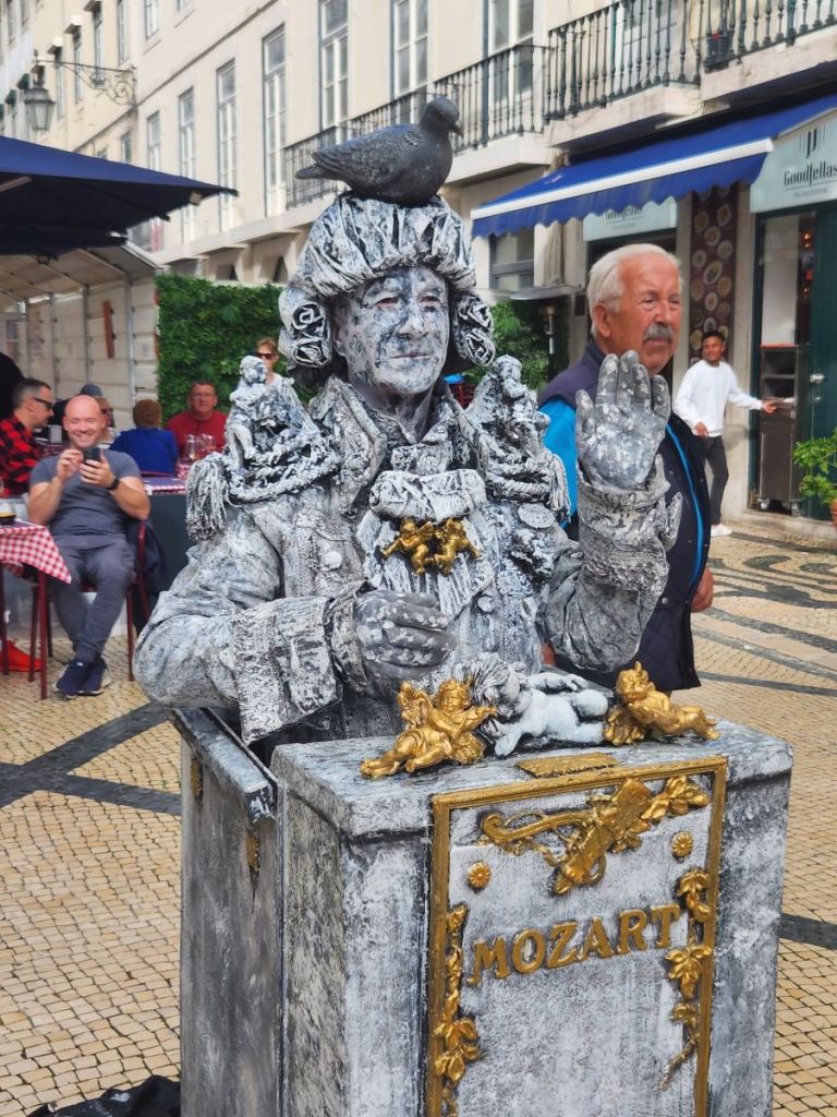 Lunched up, we head to the main pedestrian street to revisit the Pasteis de Nata shop for more tarts for our new “guys” here aboard. Why not? None of them are going to be able to go anywhere from the BAD port. Mission accomplished, we turn around, encountering one of the best statue buskers we’ve seen in a long time. He looked just like a statue – the picture doesn’t do justice to him because you’d swear he was carved from stone.