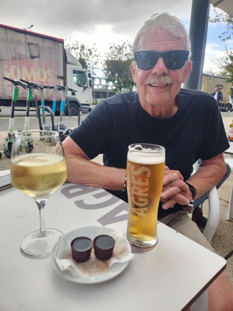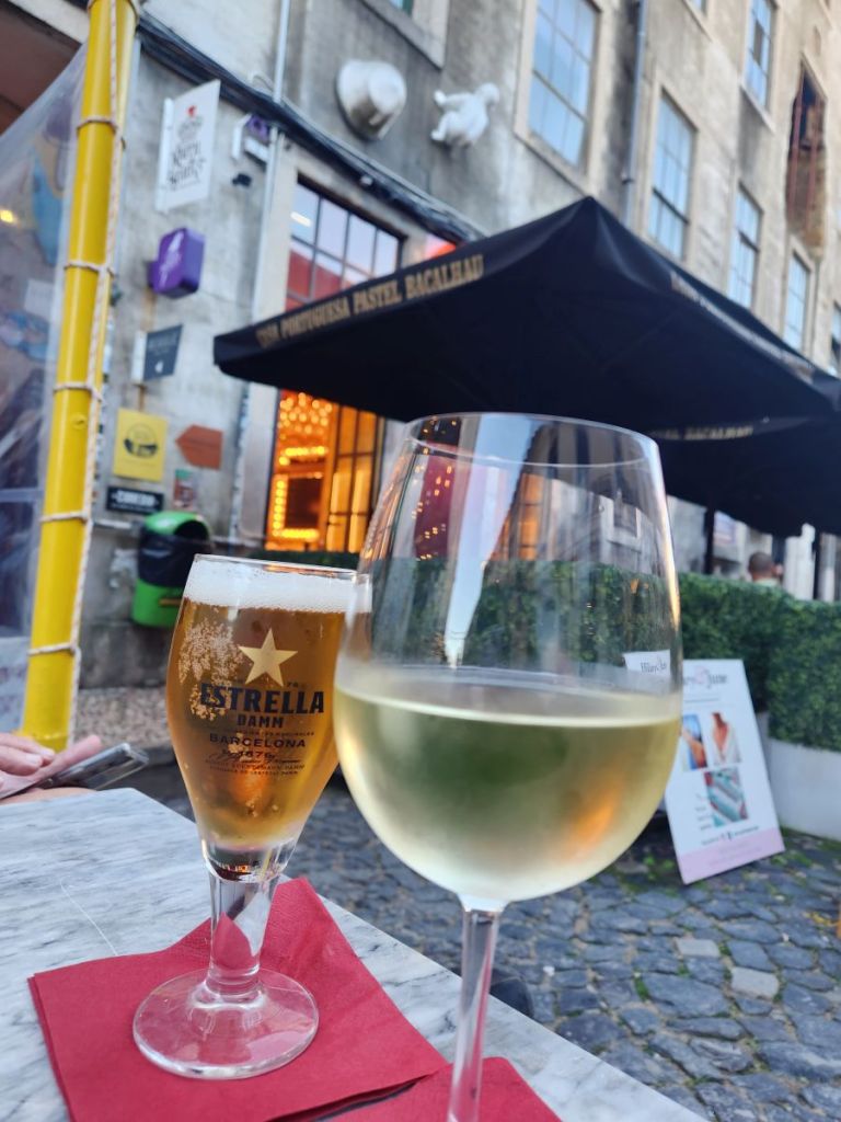 Then onto the Rua do Arsenal and then Avenue 24 de Julho for our long walk back to the ship. Of course we had to stop at Ginja de Obidos, which is now called Ginja de Ribiera – the same name as the restaurant next door. Hmmmmm….we’re thinking they must have been bought out, but the ginja tastes the same (even though it is a different brand now) and the price for the shots is the same, so ginza shots in chocolate cups, beer and wine it is. The only difference is they have run out of Pasteis de Nata. Oh well. We have 2 extra for us in our bag which we can eat later or tomorrow.