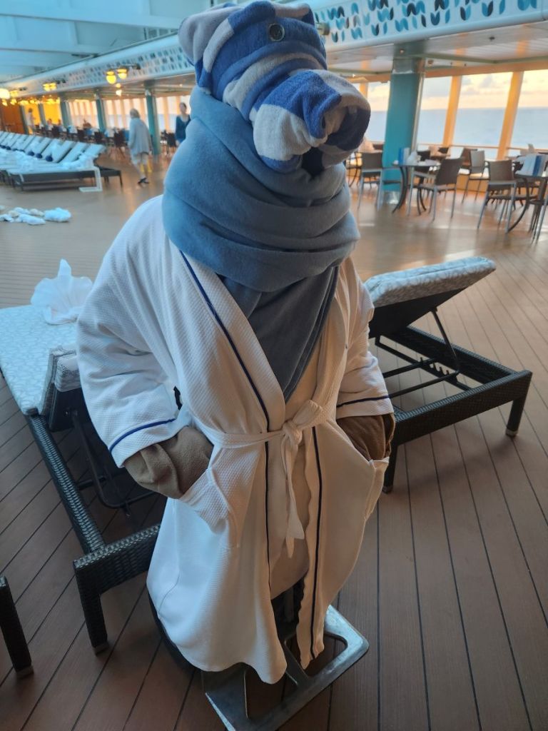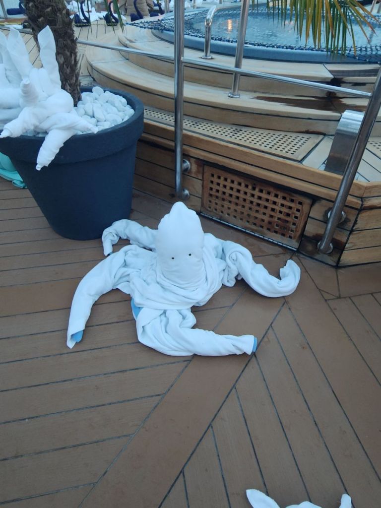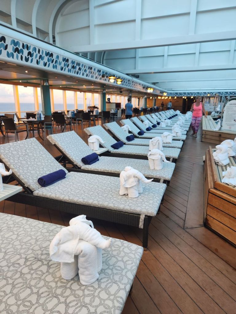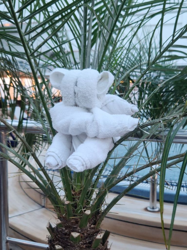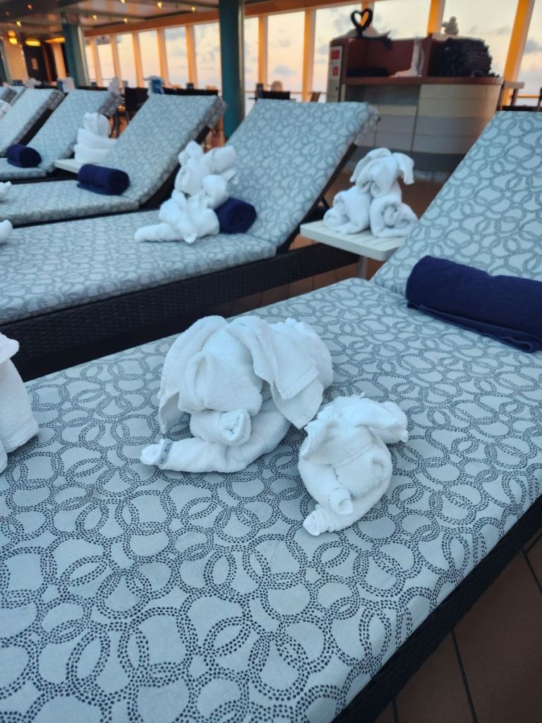 The housekeeping staff worked overtime to populate the Atrium pool with towel animals! (Actually, they got up 2 hours early this day to complete their task.) Hundreds, if not 1,000s, towel animals on every surface imaginable. Hate that they do that, but it was magical, we have to admit.