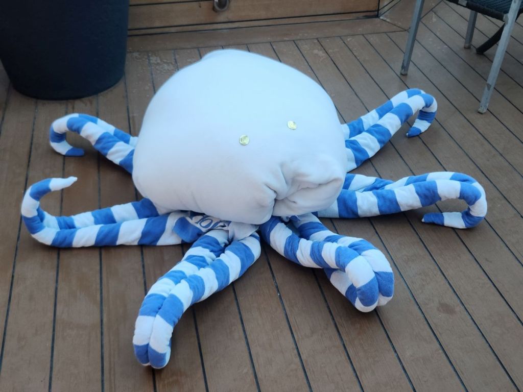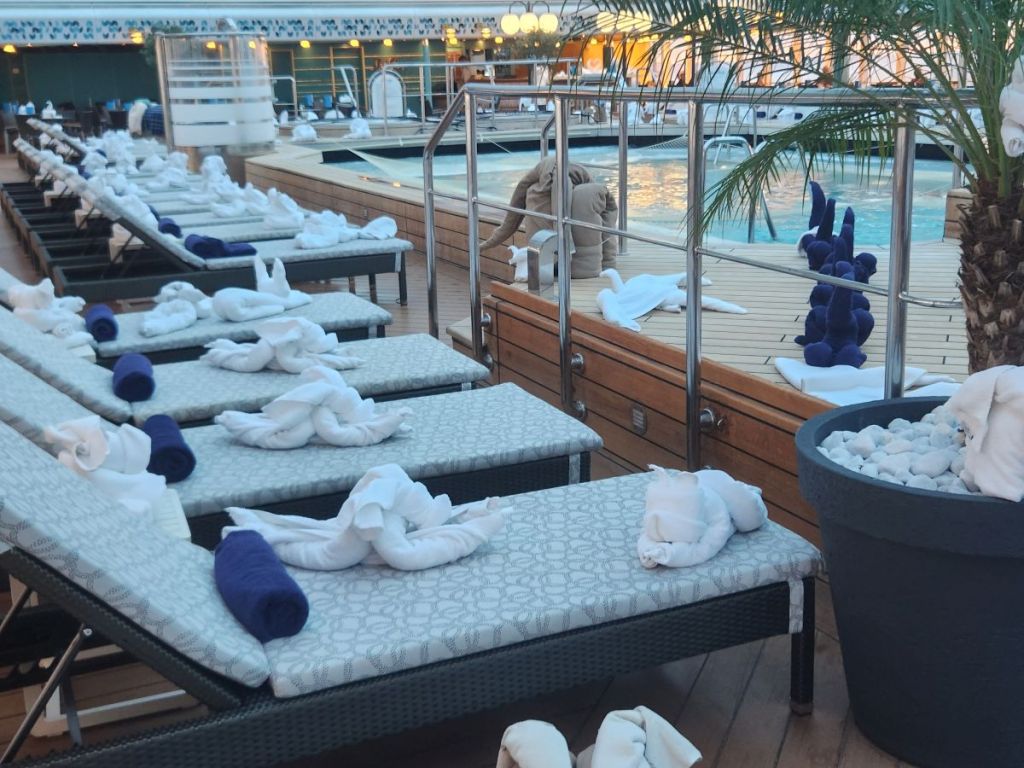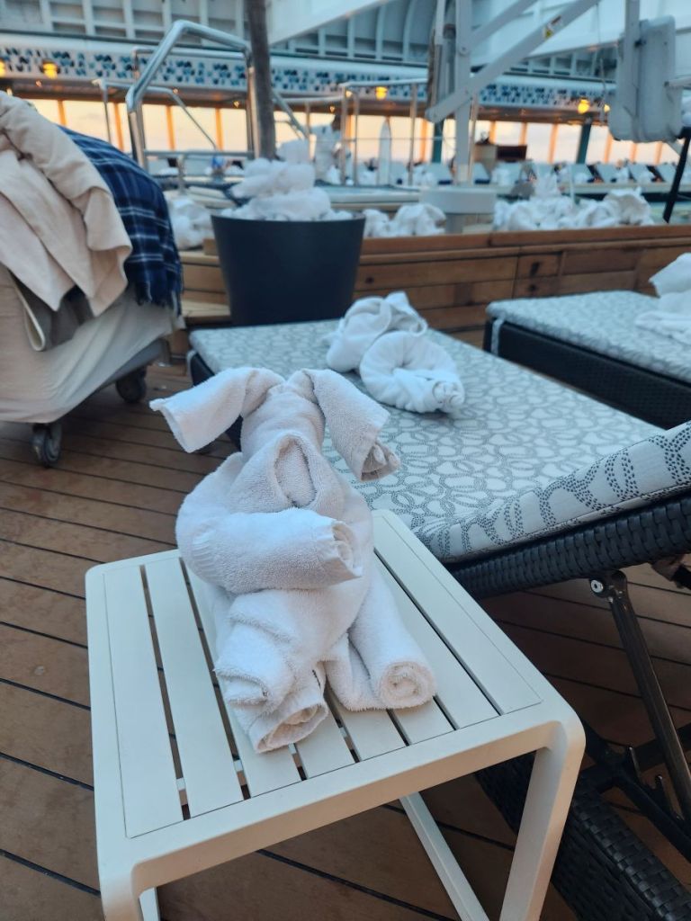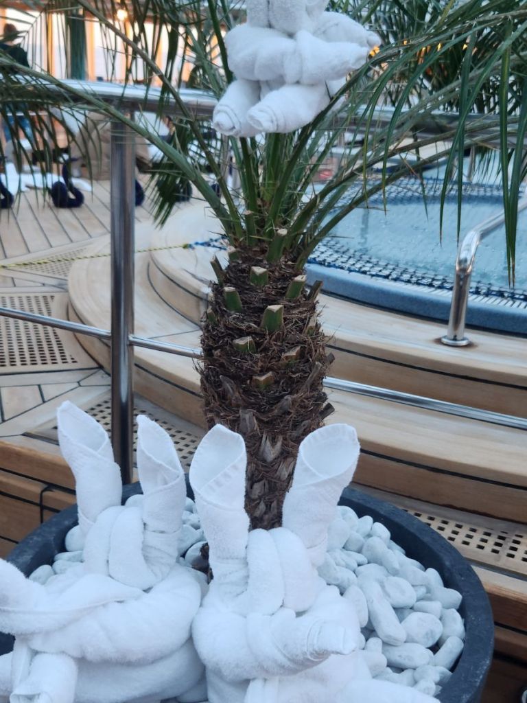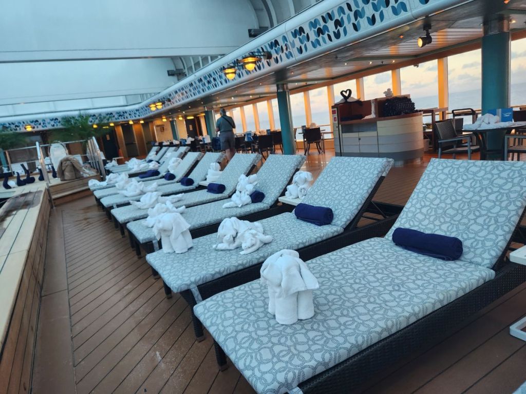 The housekeeping staff worked overtime to populate the Atrium pool with towel animals! (Actually, they got up 2 hours early this day to complete their task.) Hundreds, if not 1,000s, towel animals on every surface imaginable. Hate that they do that, but it was magical, we have to admit.