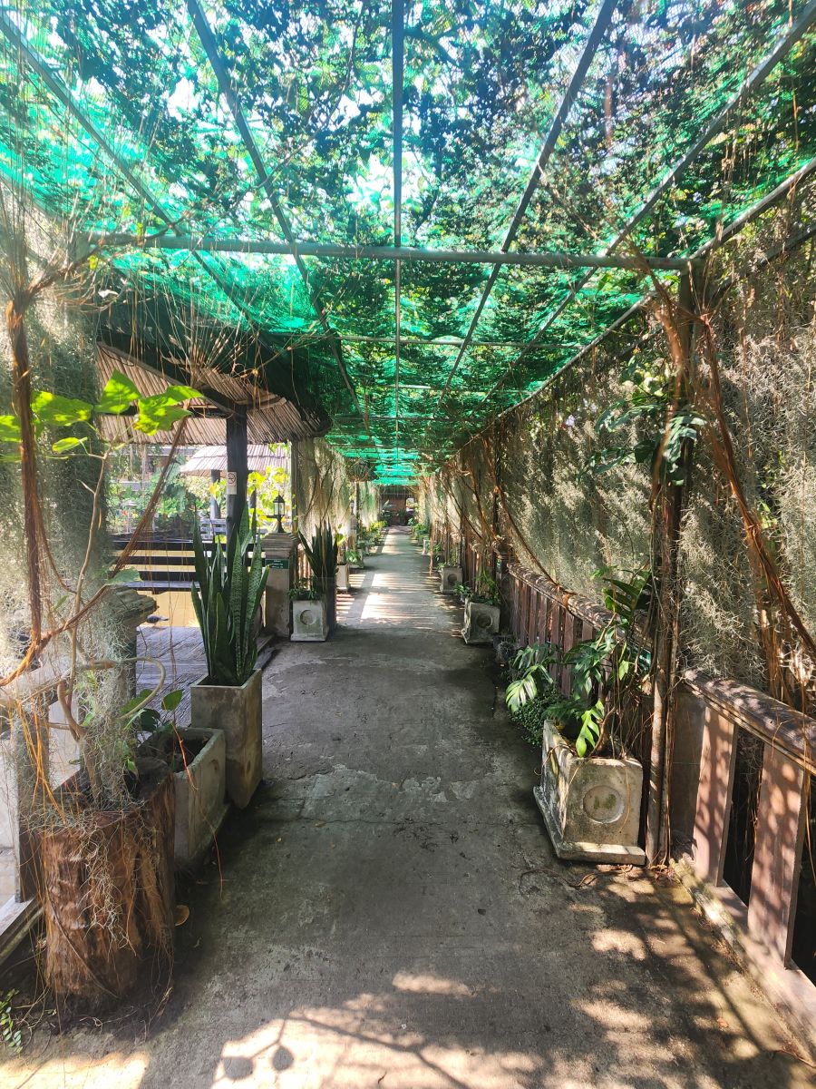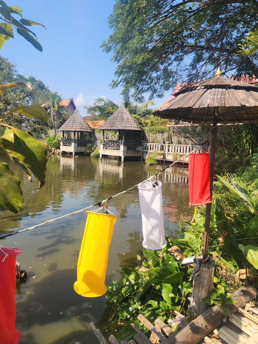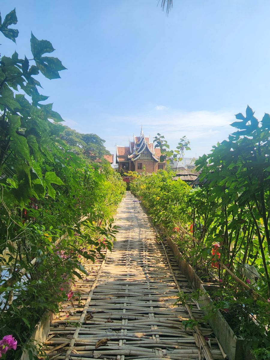 Continuing along the trellised walk, we circle the pond, walking through a lovely garden area with these adorable gold buddha statues lining the walk. Then we make our way onto this bamboo walkway which moves and dips with your weight as you cross between the fish pond on the left and the lily pond on your right. Amazing, but a little bit frightening the way that bamboo walkway moves!