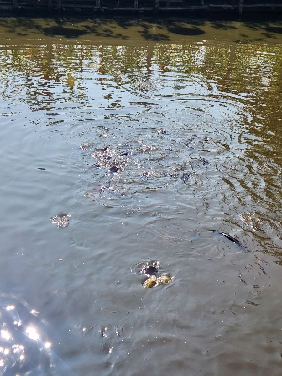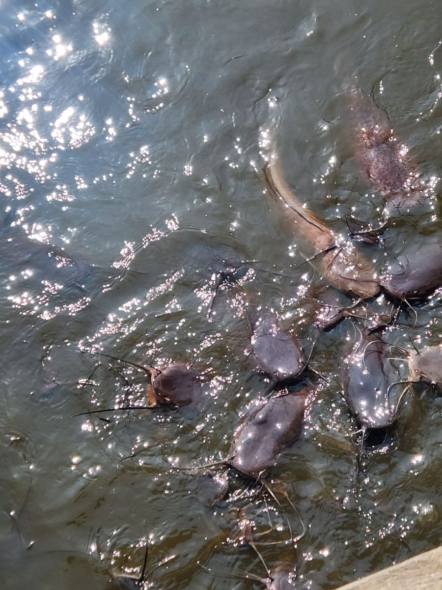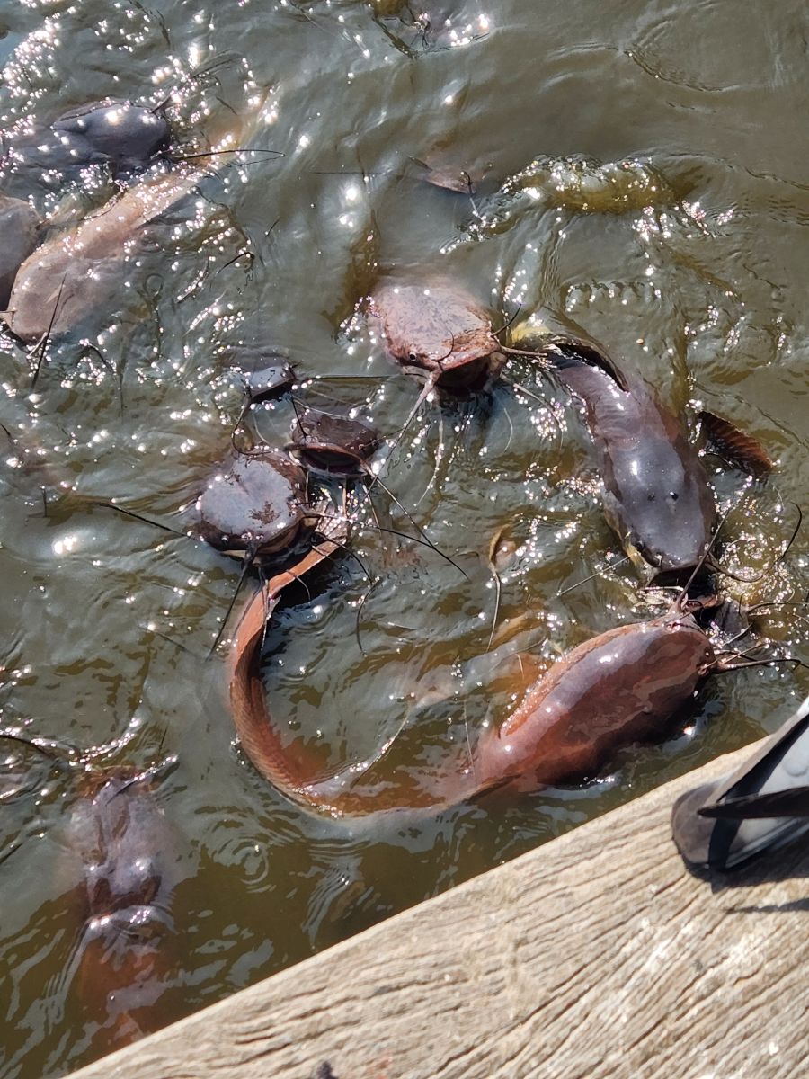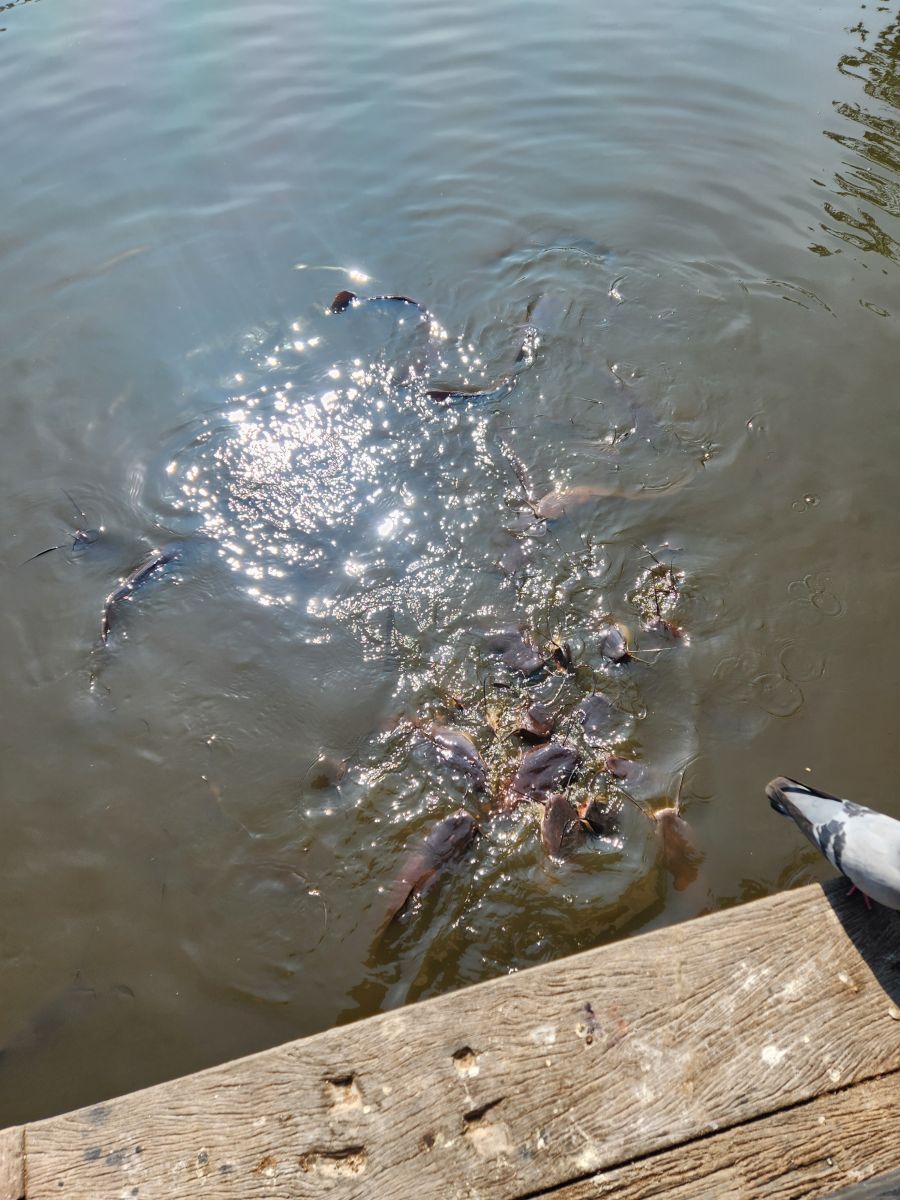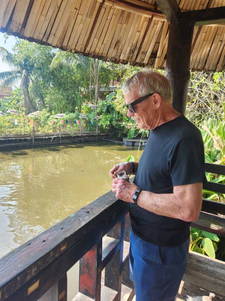 Continuing through the grounds, we find the walkway to the “swamp.” A lovely and cool covered trellis that leads to viewing platforms over what turns out to be a fully stocked pond. It’s lovely and serene, with peaceful Thai music in the background, and best yet, we can buy fish food for 20 baht! Yes. Our afternoon entertainment has begun. These fish are monstrous, as you will see in the many videos we have taken. Feeding the fish. Feeding more fish. Stomping our feet to get the pigeons away. Feeding the fish still. It is too much fun!