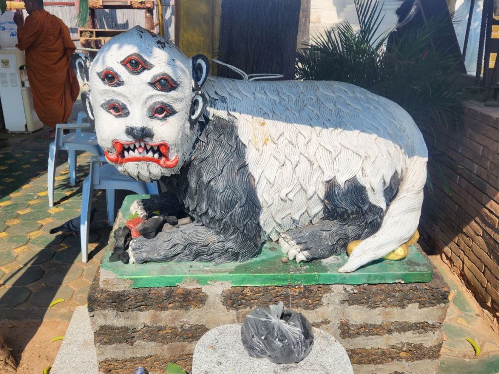 On the way out of the Wat, we notice this creepy and bizarre 5 eyed bear-like statue that is eating coal and then pooping out gold. What? Really? There is a whole huge long explanation, all in Thai of course, that when translated makes no sense whatsoever! Most of what we can glean is that there was a man who had mistresses and he loved one mistress more than his wife. They had a son together, but he was cursed or something and the legend was he would die when he was 20. The father had to bury him outside a cave and leave a “tattooed” animal, which he did. Then the “Mang” with 4 ears and 5 eyes appeared. It was muddled before, but not it is even more confusing as the villagers realize this is the boy that has come back to life as a monster? Confusing. And the eating coals? And pooping gold? Don’t know, only that the Mang wouldn’t eat anything at all until they built a fire and it ate the coals. In the morning when the Monks and villagers came back, there was a pile of gold. Hey, I don’t make this stuff up, I just report the translations!