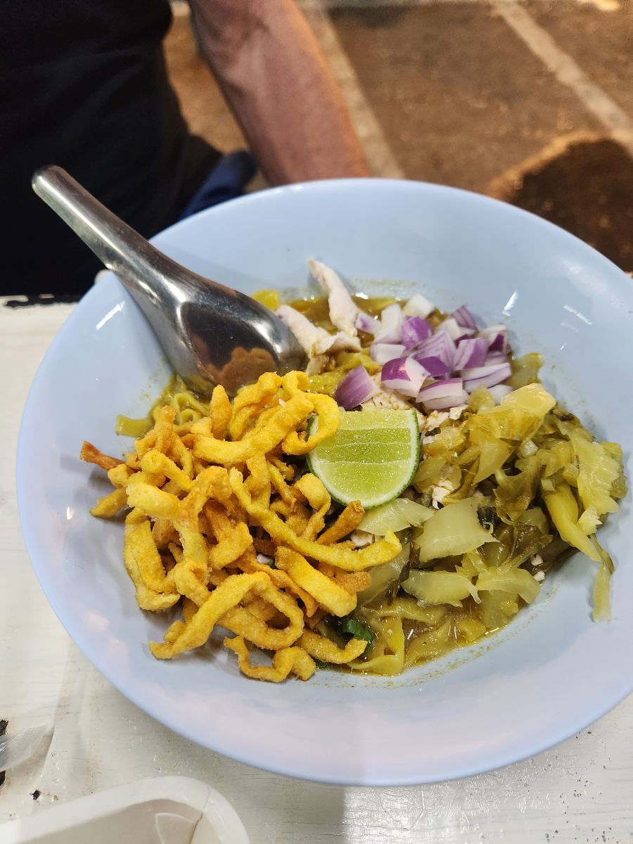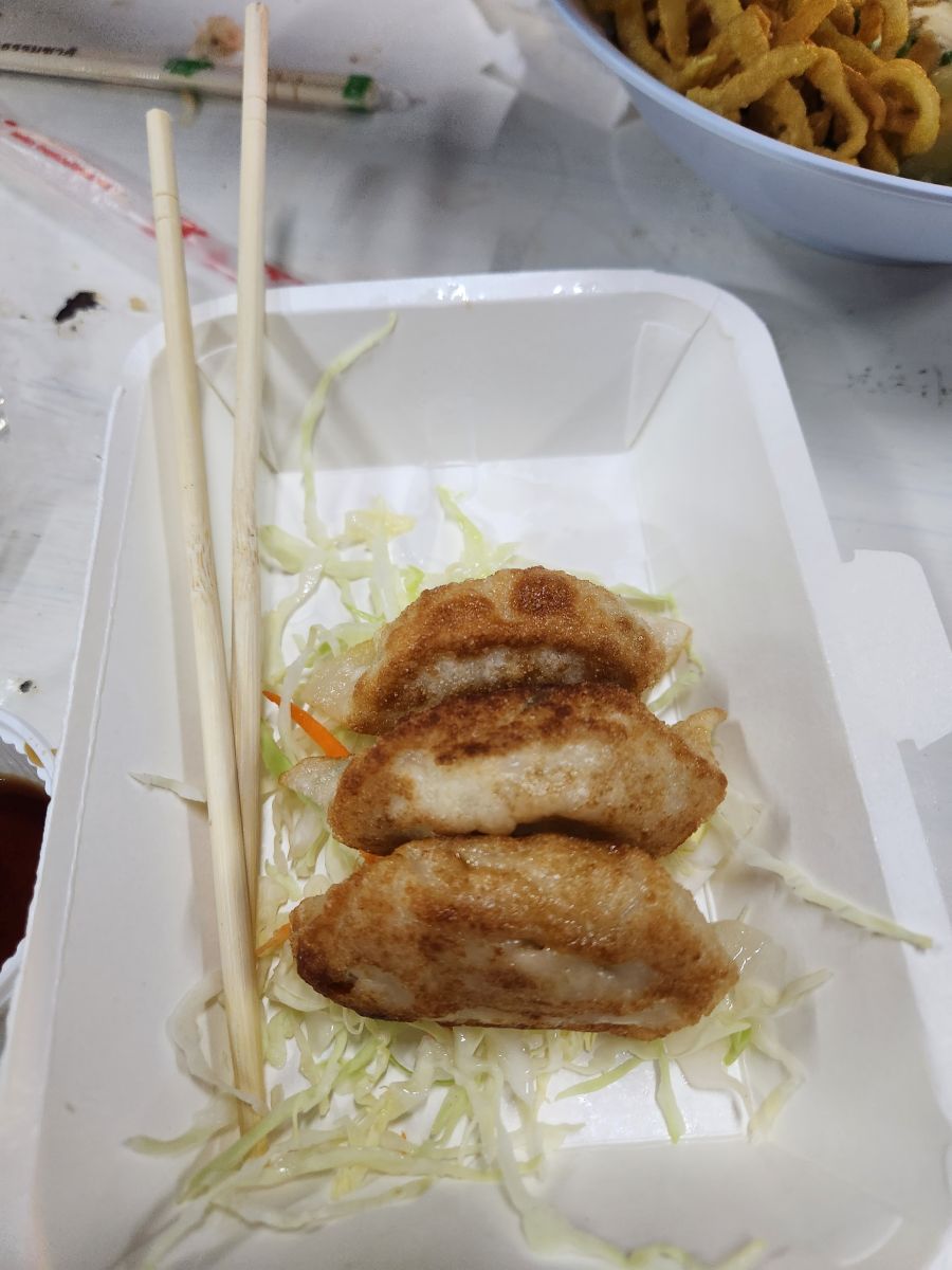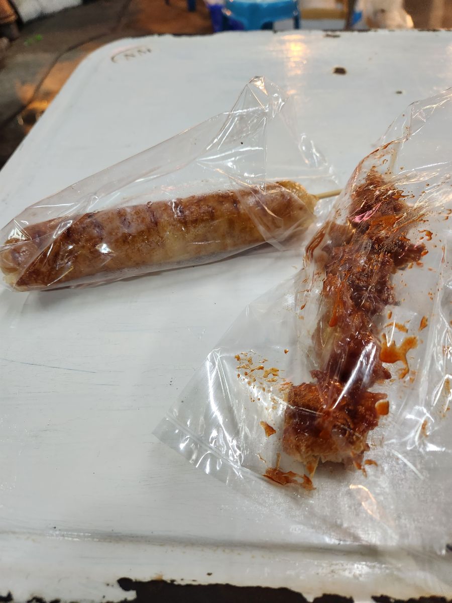 Later that evening, for dinner, we walked down to the Food Market at Chiang Mai Gate. Totally fun with tons of vendors. We settled on pork Gyoza, Fried chicken skewers with Korean BBQ sauce, a Chiang Mai sausage (not spicy version) and Khao Soi for Ed (who is in his glory with Khoa Soi). All was excellent, except that sausage, which was mostly rice and just not that great. But everything else was stellar and of course cheap as the dickens!