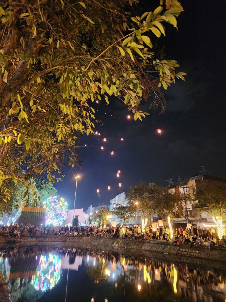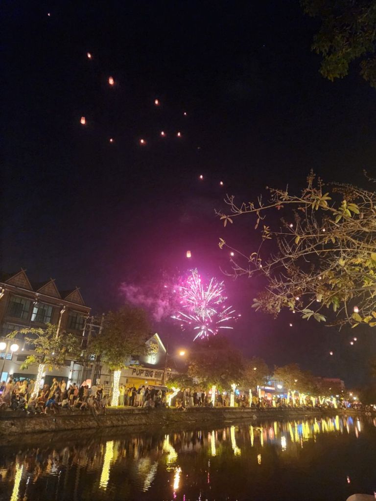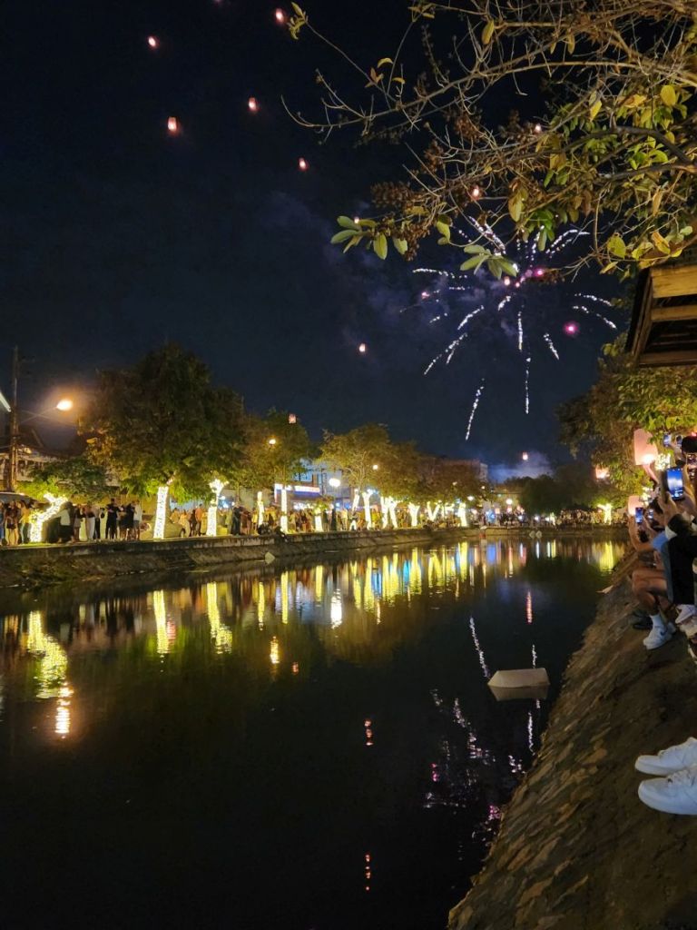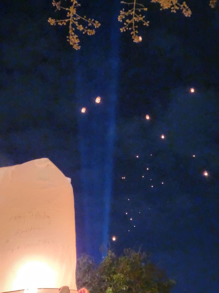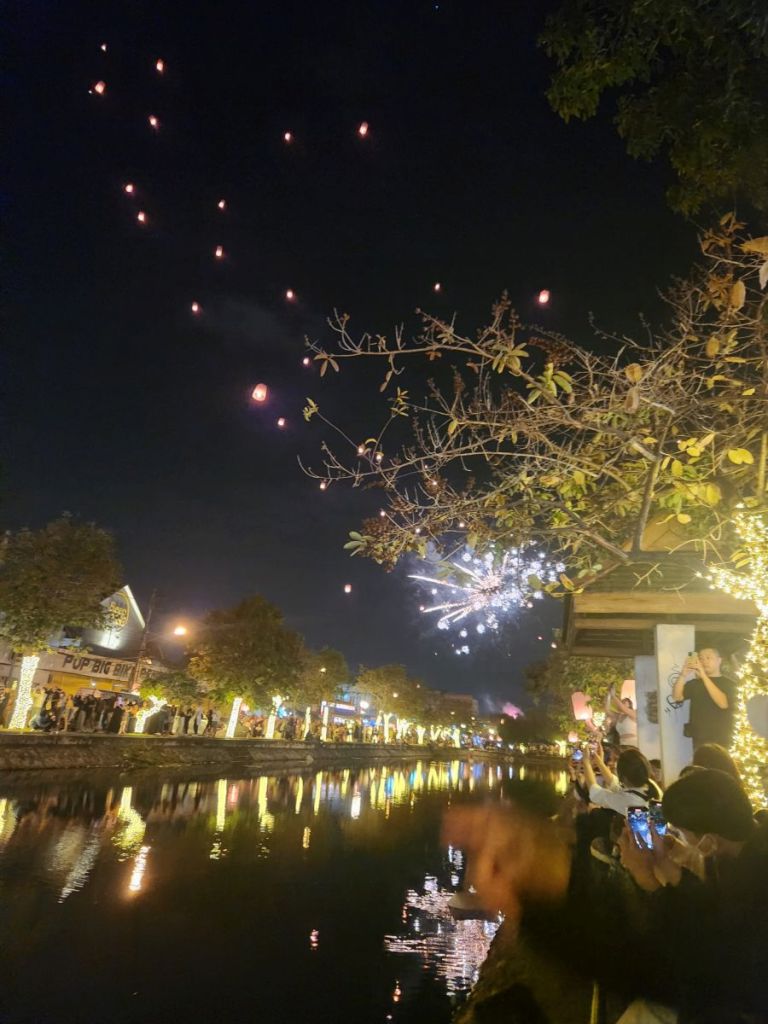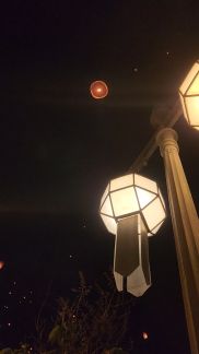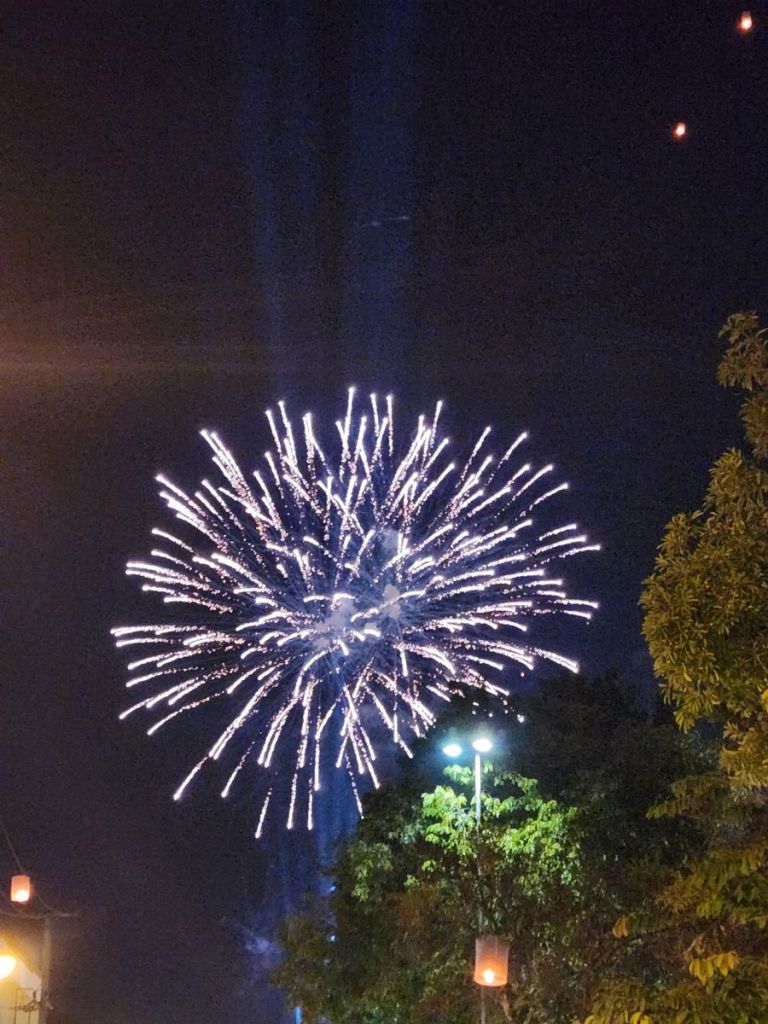 We make it to the moat easily enough – and it is absolutely beautiful. The trees are all lit up in white lights. The Ferris wheel at the end of the moat glows cheerily – and all around us are lanterns in various stages of lift off. It is such a wonderful, magical feeling. WARNING: Here begins far too many pictures of the moat, the lights, the lanterns and the fireworks. Just saying – forewarned is forearmed and all that.