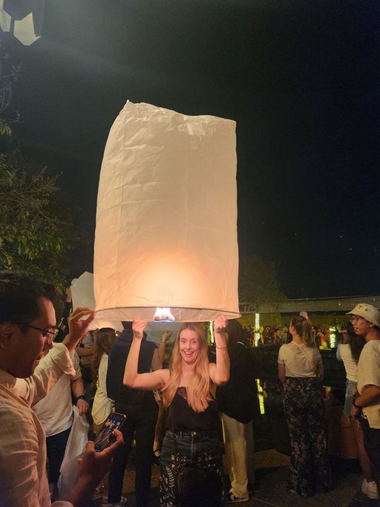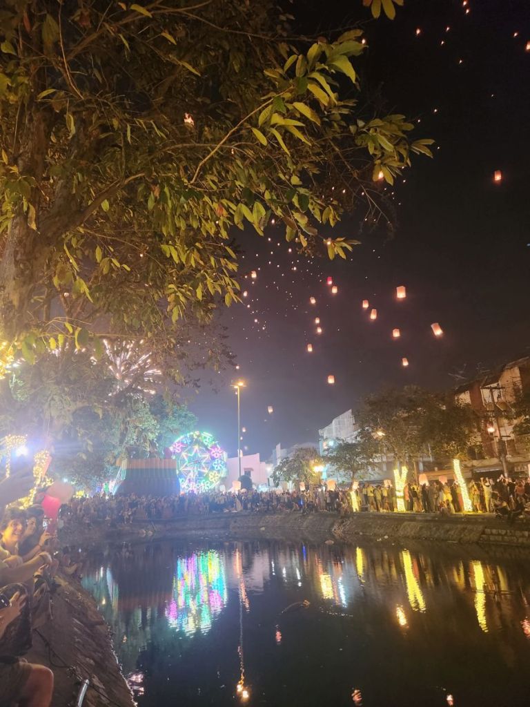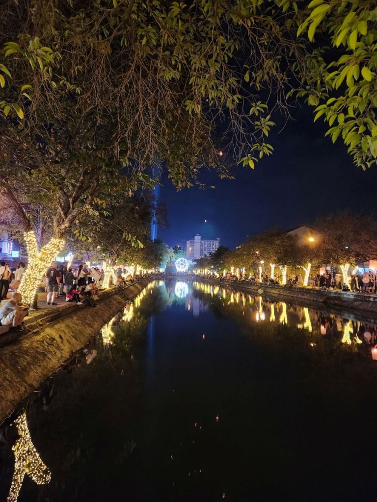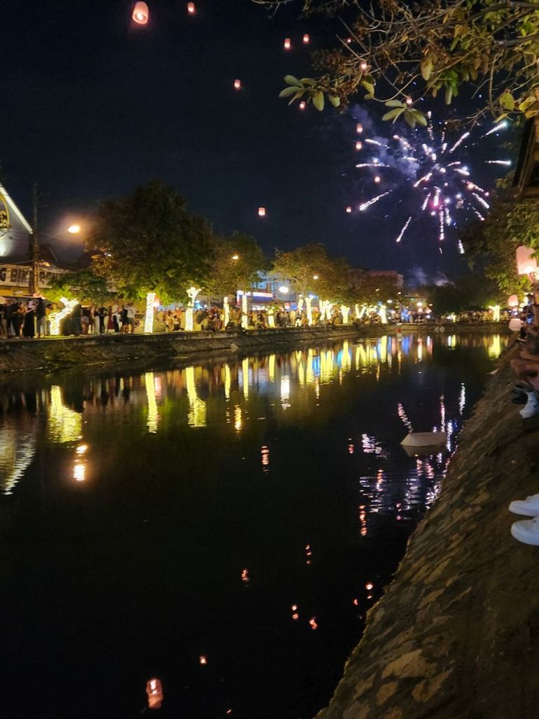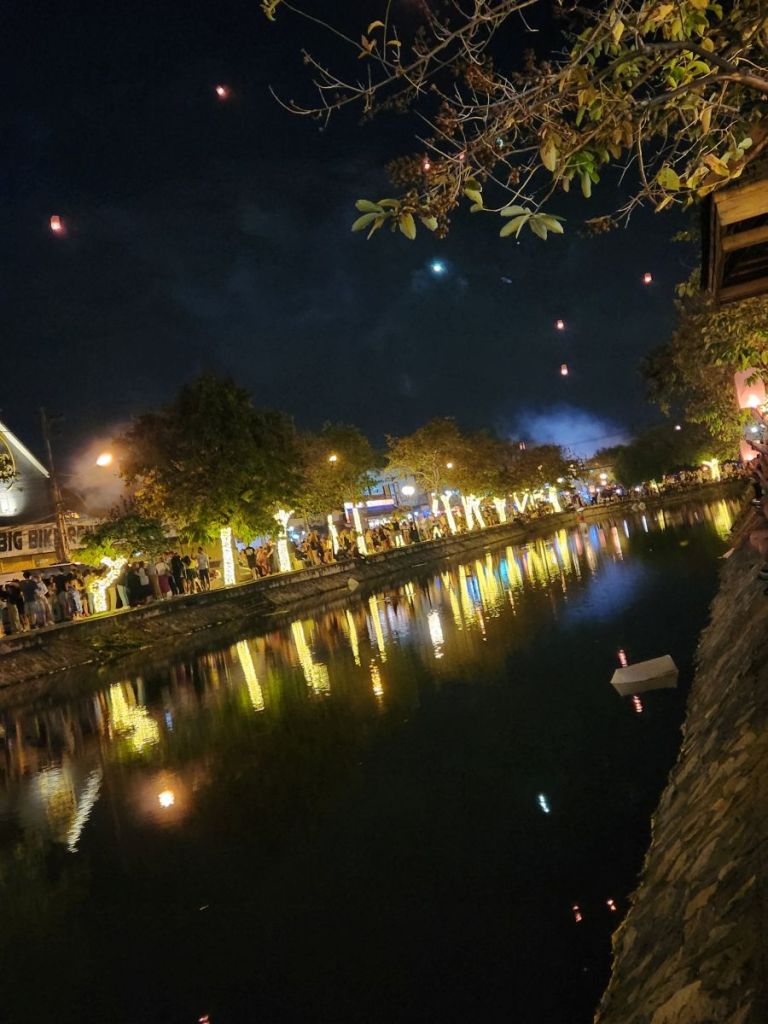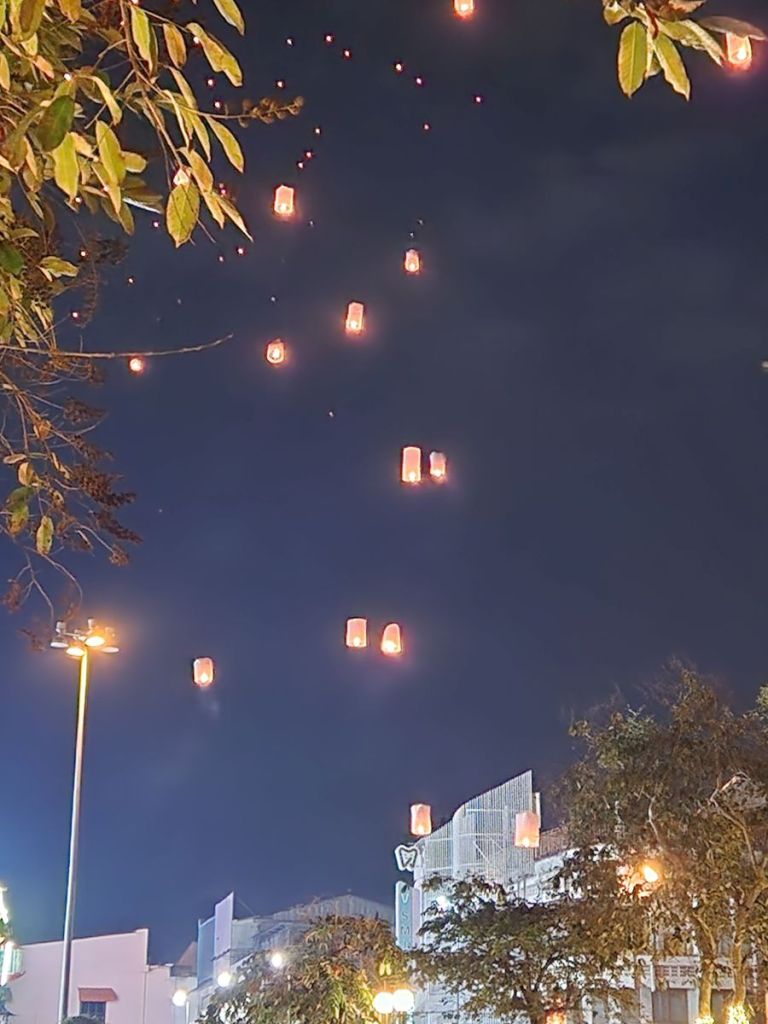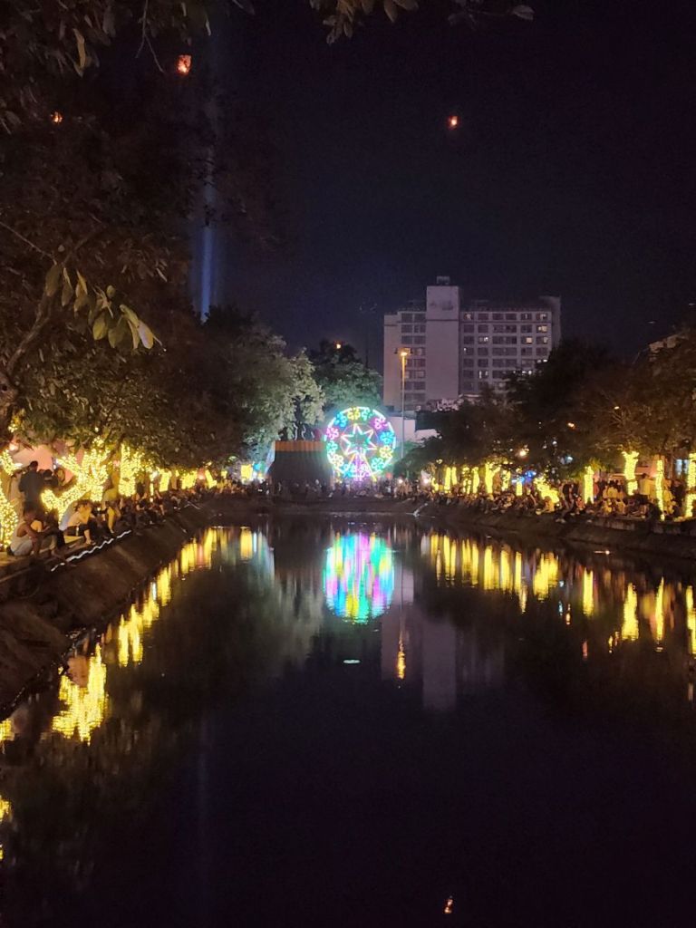 We make it to the moat easily enough – and it is absolutely beautiful. The trees are all lit up in white lights. The Ferris wheel at the end of the moat glows cheerily – and all around us are lanterns in various stages of lift off. It is such a wonderful, magical feeling. WARNING: Here begins far too many pictures of the moat, the lights, the lanterns and the fireworks. Just saying – forewarned is forearmed and all that.
