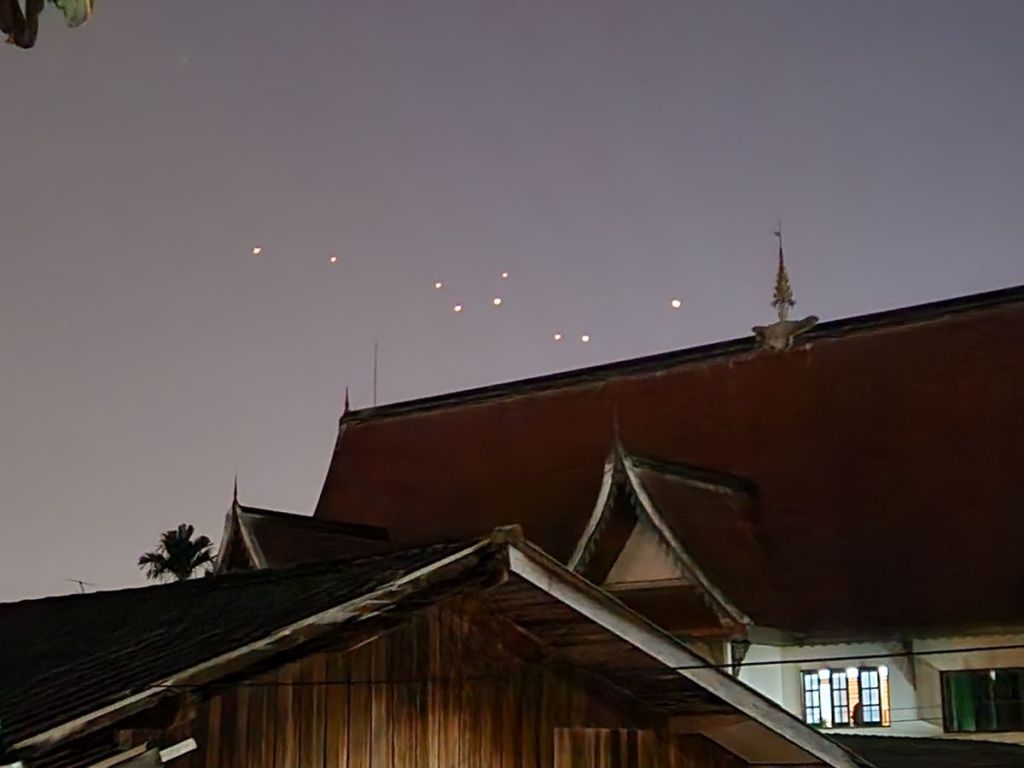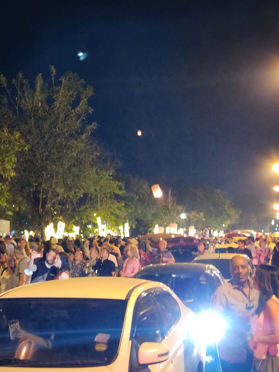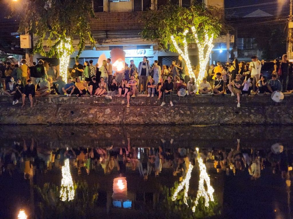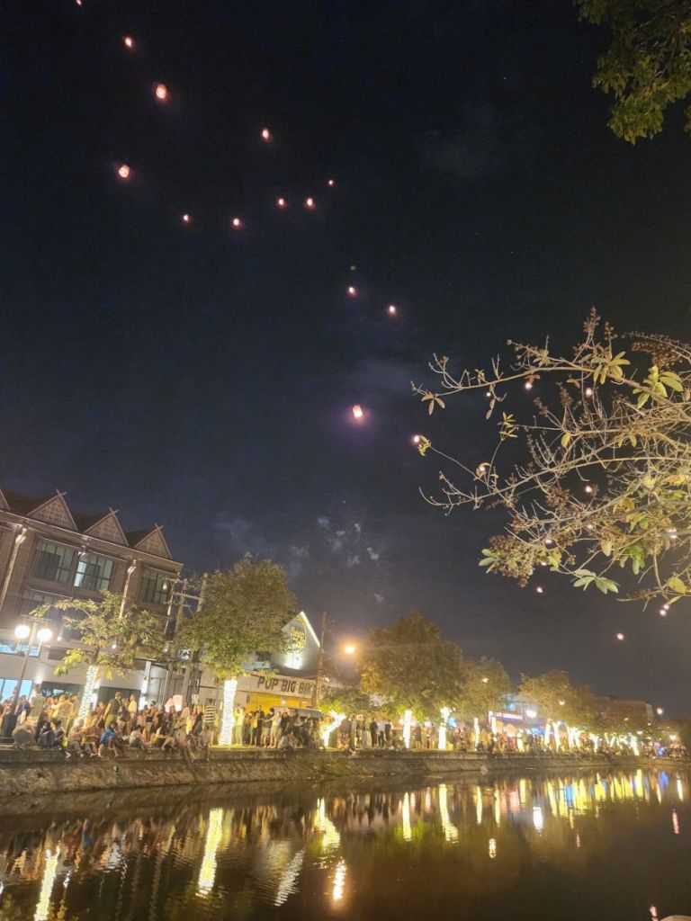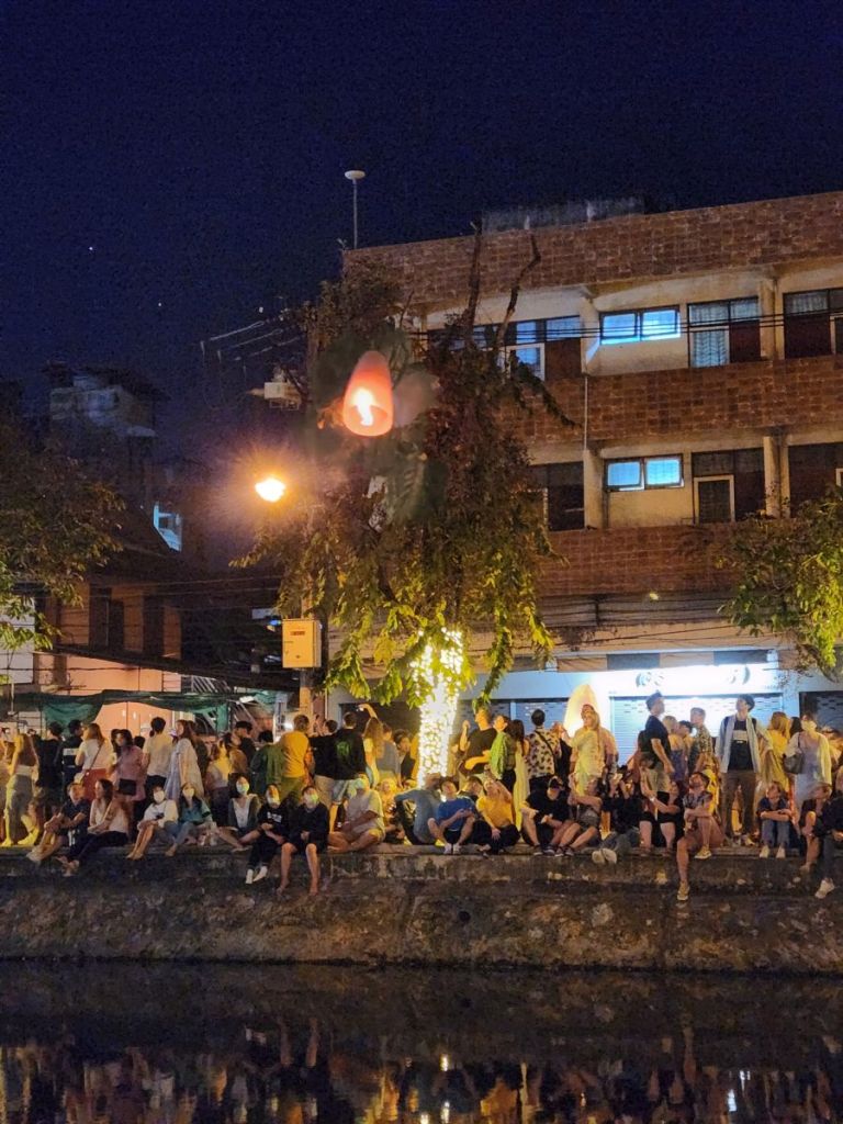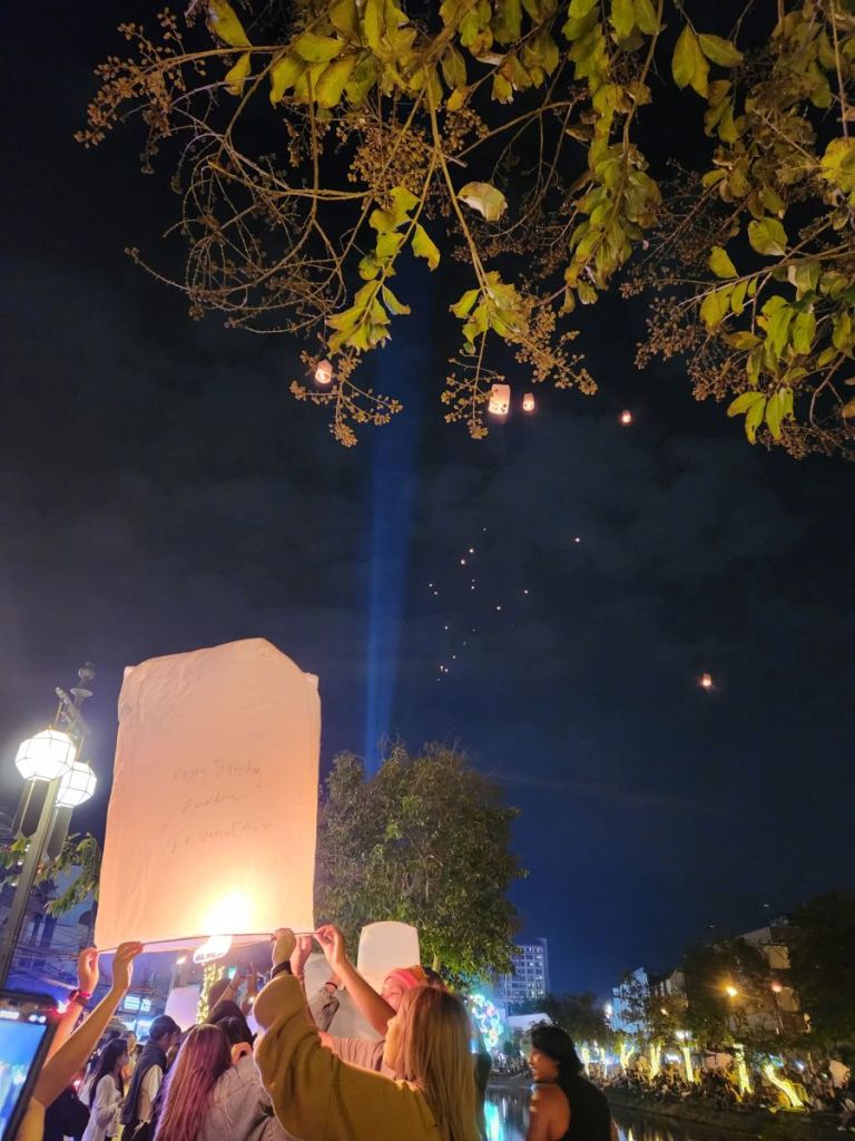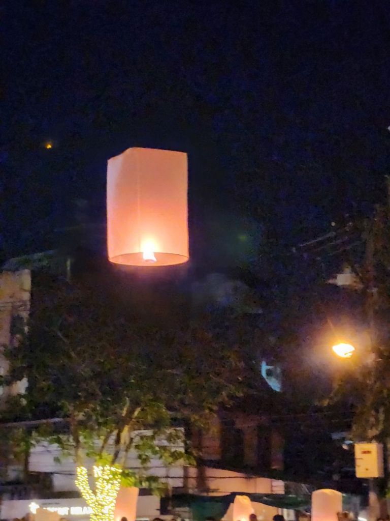 It is an easy walk from the house to the Gate – really only about 10 minutes. Surprisingly the streets aren’t all that crowded at 10:45 when we leave. On the way we watch people buying lanterns from street vendors for only 100 baht ($3 USD). We couldn’t believe they were that cheap! We thought about buying one, but had read where it was really tough to light it and to be prepared to exhaust your lighter. Needless to say, we don’t have lighters handy anymore and we weren’t going to go on a hunt for one at this late hour. Executive decision made: We’ll just watch. Sometimes it is better to be a fly on the wall than a participant in the thick of things!