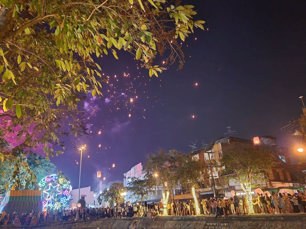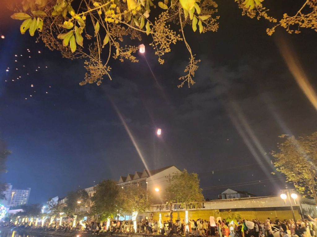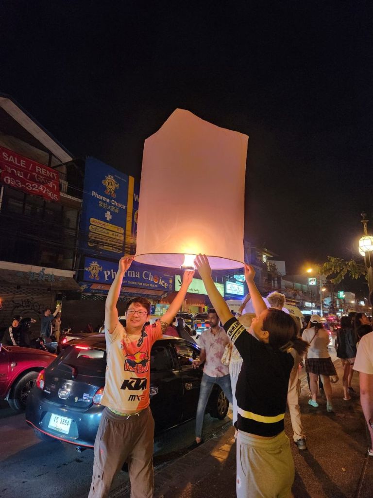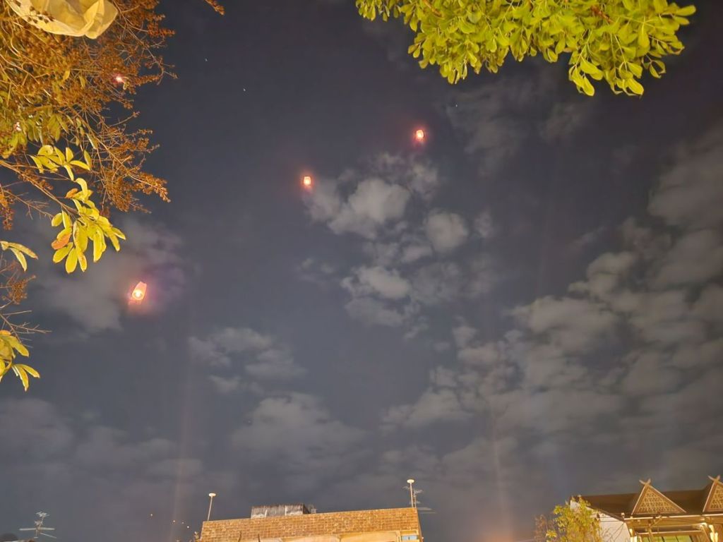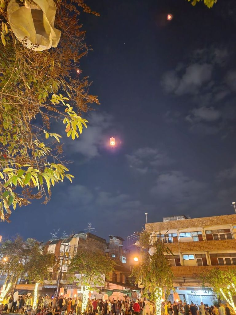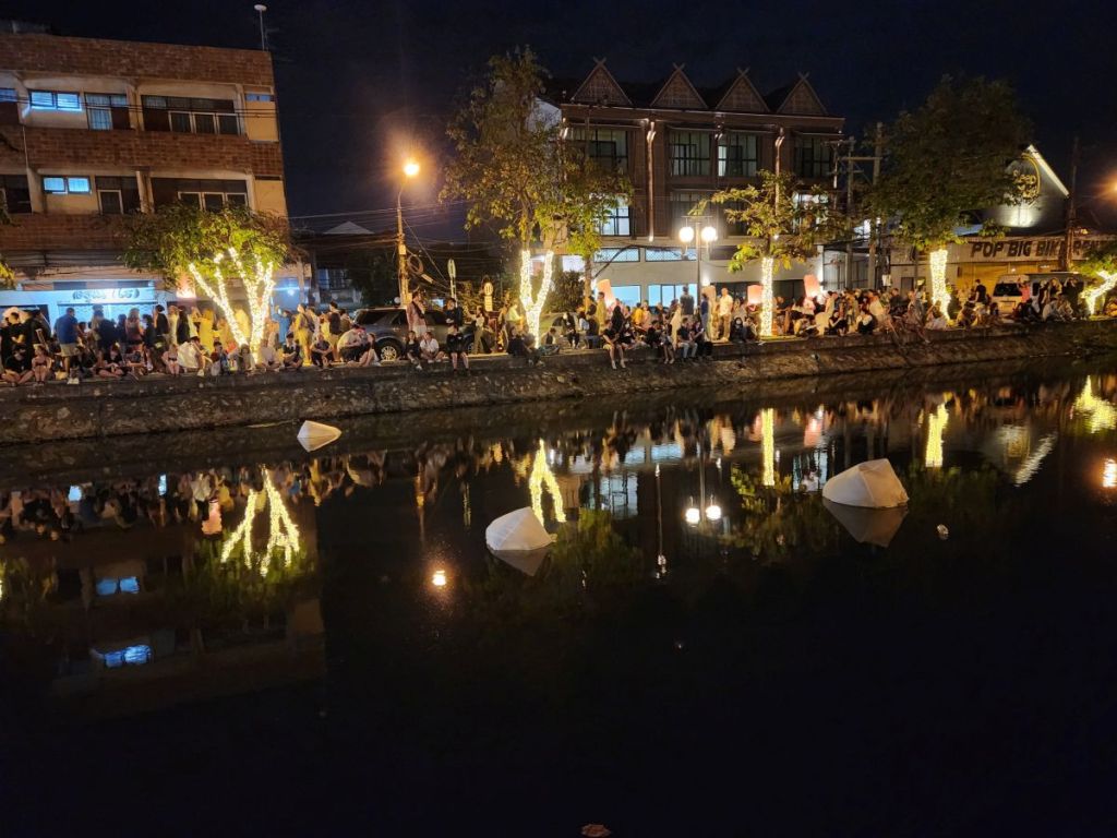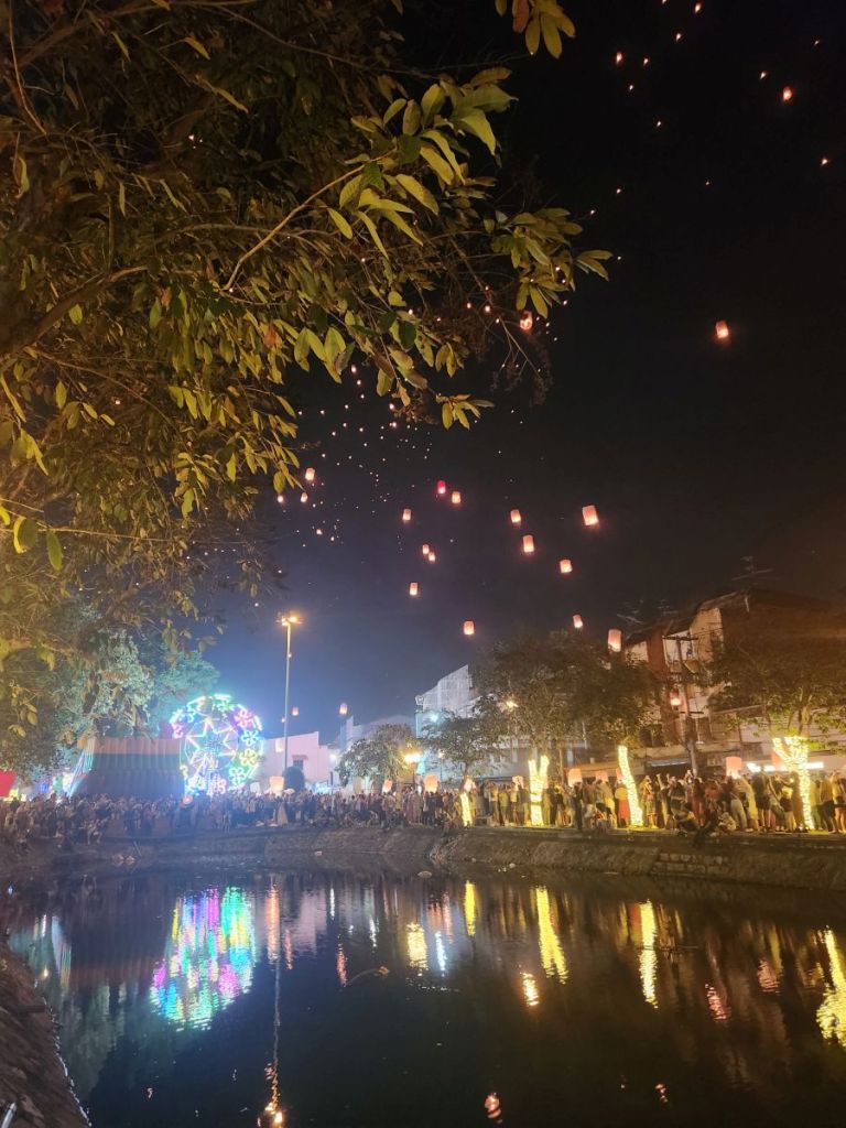 It is an easy walk from the house to the Gate – really only about 10 minutes. Surprisingly the streets aren’t all that crowded at 10:45 when we leave. On the way we watch people buying lanterns from street vendors for only 100 baht ($3 USD). We couldn’t believe they were that cheap! We thought about buying one, but had read where it was really tough to light it and to be prepared to exhaust your lighter. Needless to say, we don’t have lighters handy anymore and we weren’t going to go on a hunt for one at this late hour. Executive decision made: We’ll just watch. Sometimes it is better to be a fly on the wall than a participant in the thick of things!