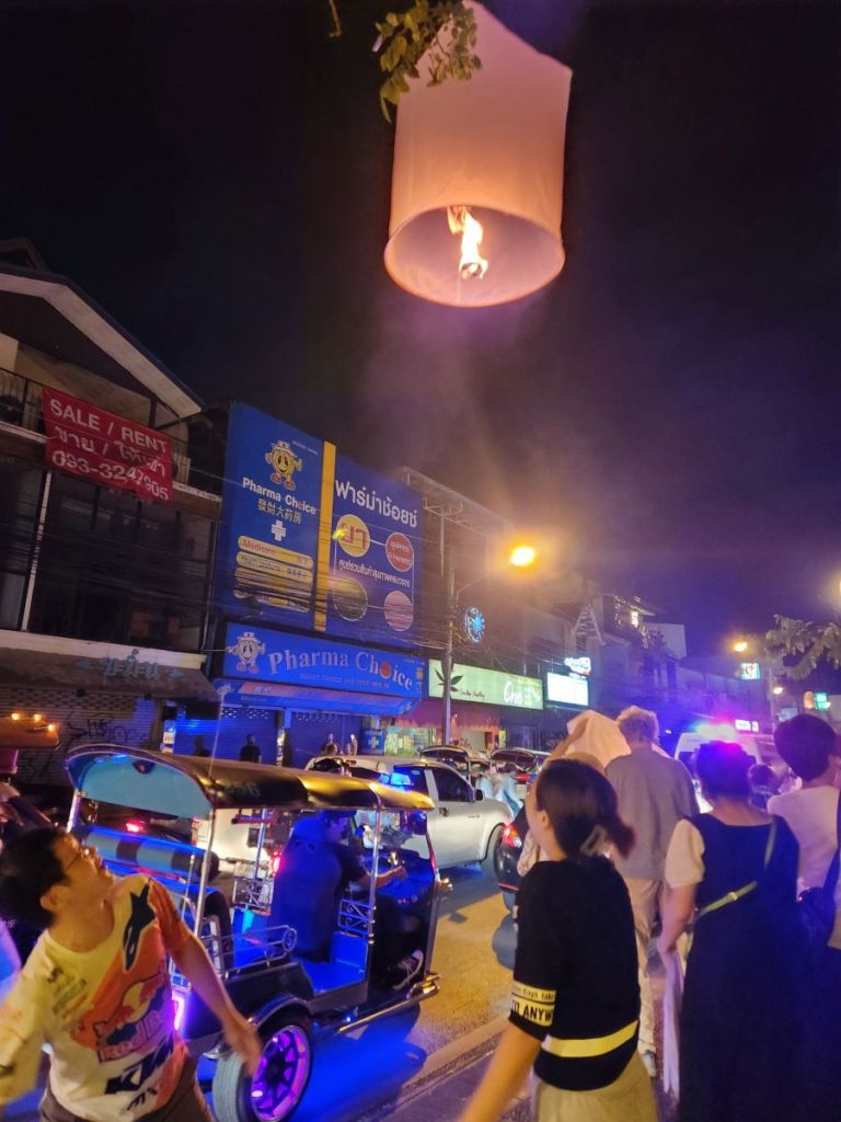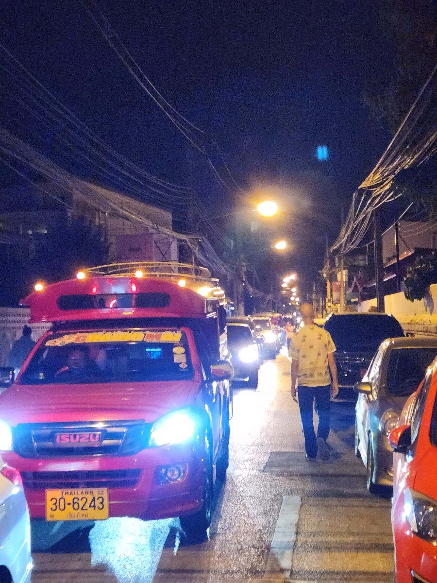 Fireworks over, we disperse out into the gridlocked traffic (ok, why are these people out here in their cars? This isn’t a spur of the moment event, they had to have known there would be a standstill here – even though it is a major thoroughfare? It defies logic. And before you say it, no, they aren’t thereto watch the fireworks. They are all trying to get somewhere – there are taxis and tuk tuks and song teaws and scooters and…..well, everything!).