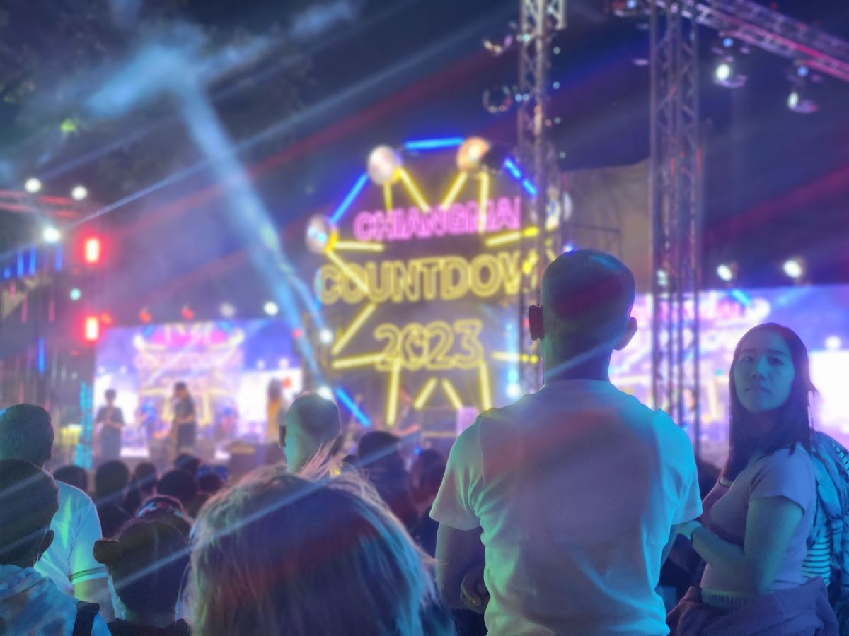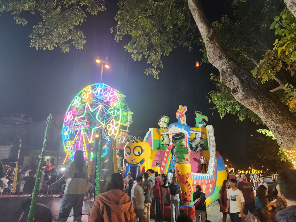 Arriving at the stage area, we decide not to wade into the crowd but hang out on the peripheral watching an listening to a surprisingly good rapper and band. There is a whole carnival here behind the state, Ferris wheel, bouncy houses, rides, the whole gamut. Quite the festive atmosphere for a New Year’s celebration.
