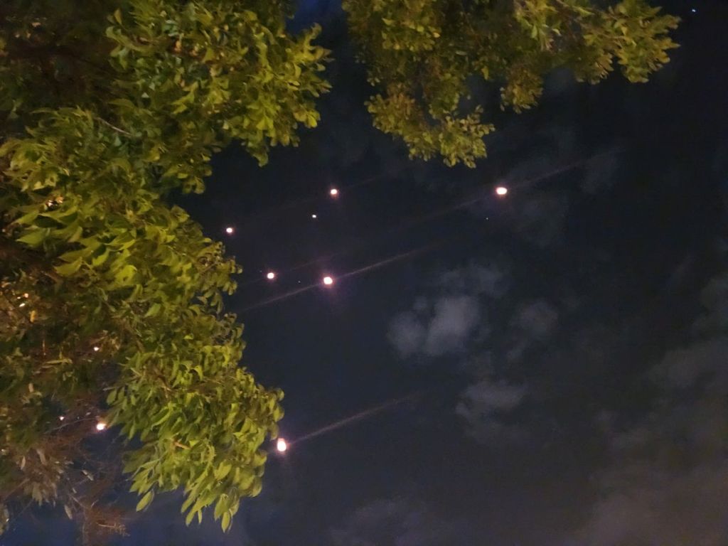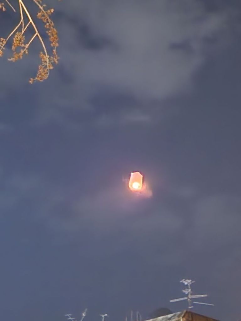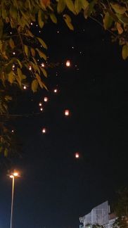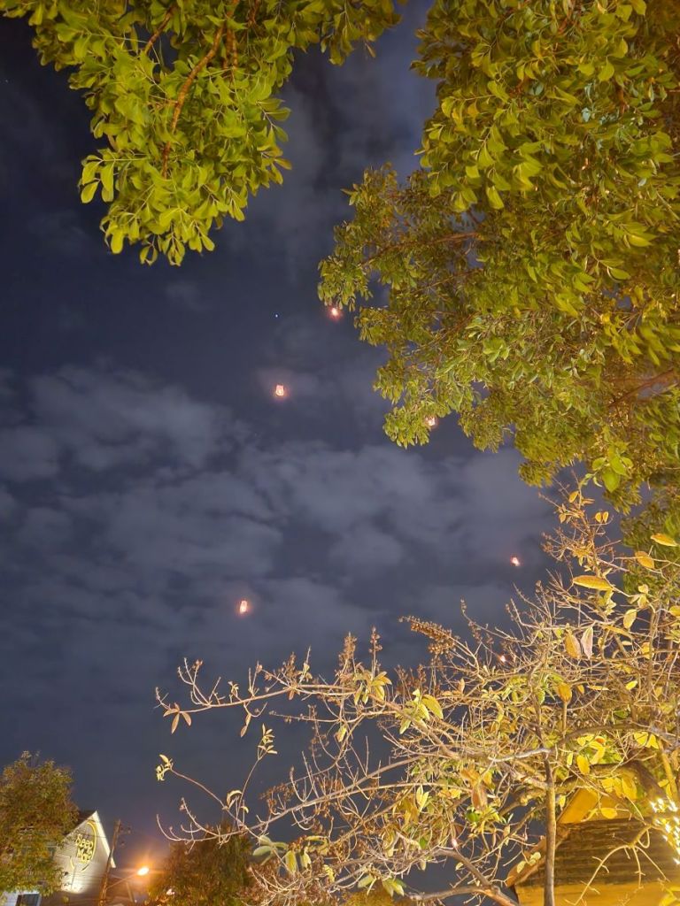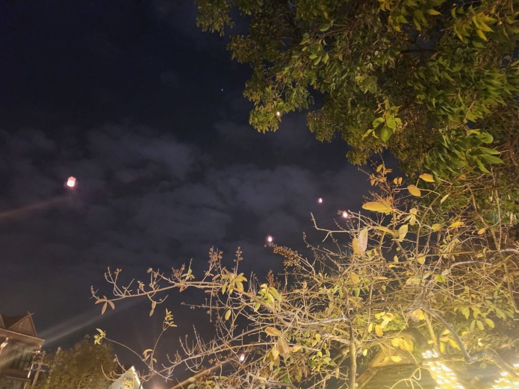As we watch, there are inevitable failures. Burned out lanterns floating in the moat. Lanterns on fire disintegrating in the air. And the frequent lantern stuck in a tree. Physics is not really a focus here tonight.