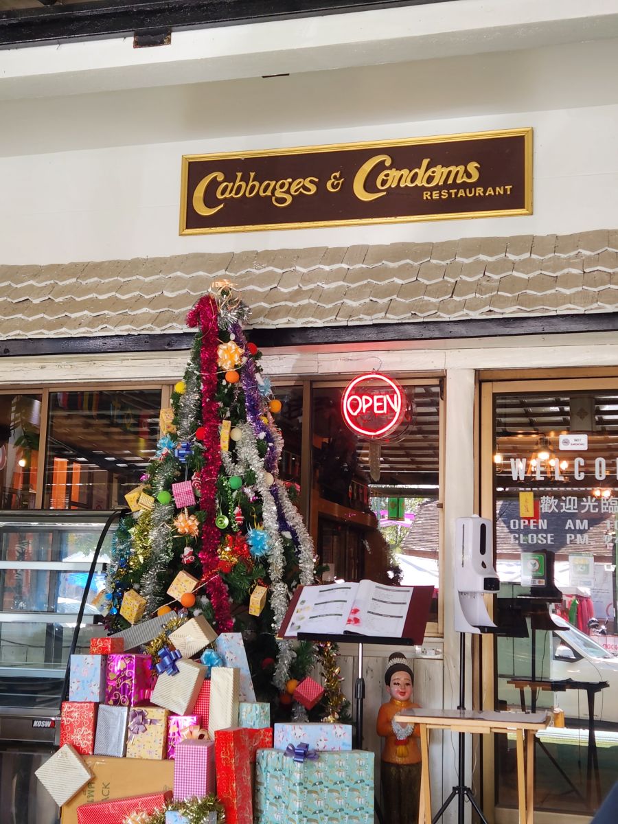 Checking out of the hotel, we are able to leave our bags at reception as planned, but instead of going exploring we decide to head straight to the bus terminal to see if we can get an earlier bus back to Chiang Mai. Unfortunately, the early bus is sold out, so we have 5 hours to fill. Ok. Lunch. We opt for Cabbages and Condoms, a relatively famous (or infamous) restaurant because of the name. This is actually what is called a “Public-benefit” restaurant, part of the Population and Community Development Association (PDA), used to promote family planning and HIV/Aids. The PDA works to promote community-based family planning and at one point had 16,000 village volunteers throughout the country. The name is a play on the success they have had in bringing family planning services to the community – they say their focus has made condoms as easy to get as cabbages. There you go!
