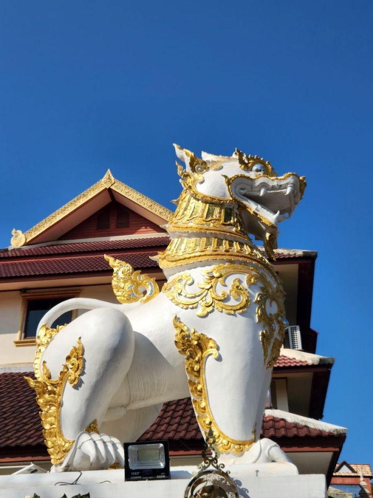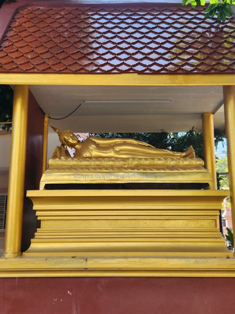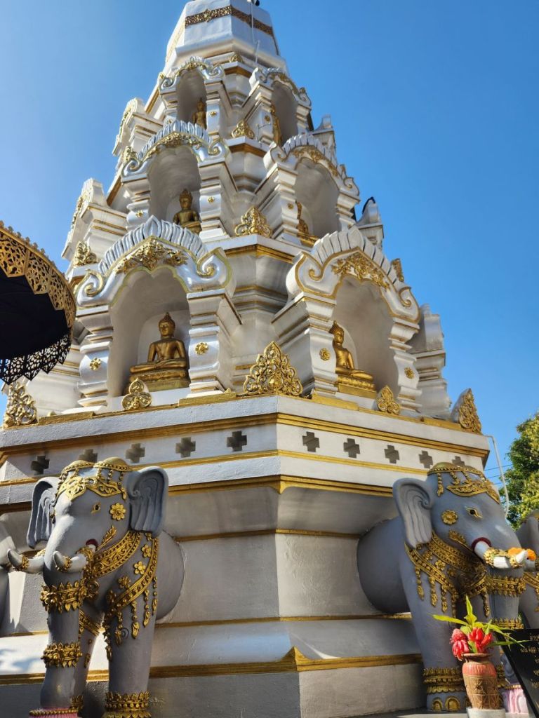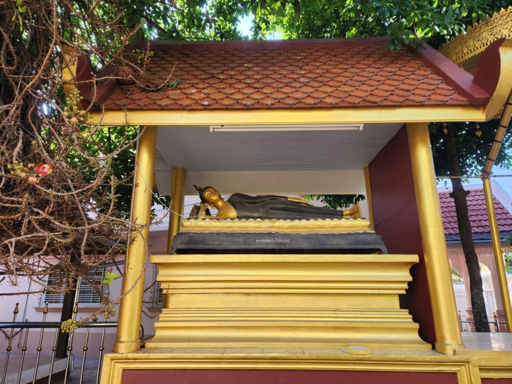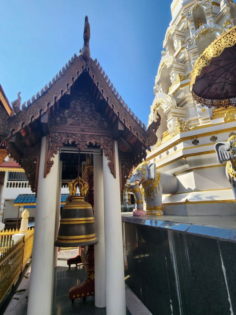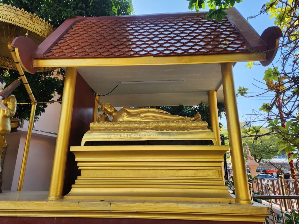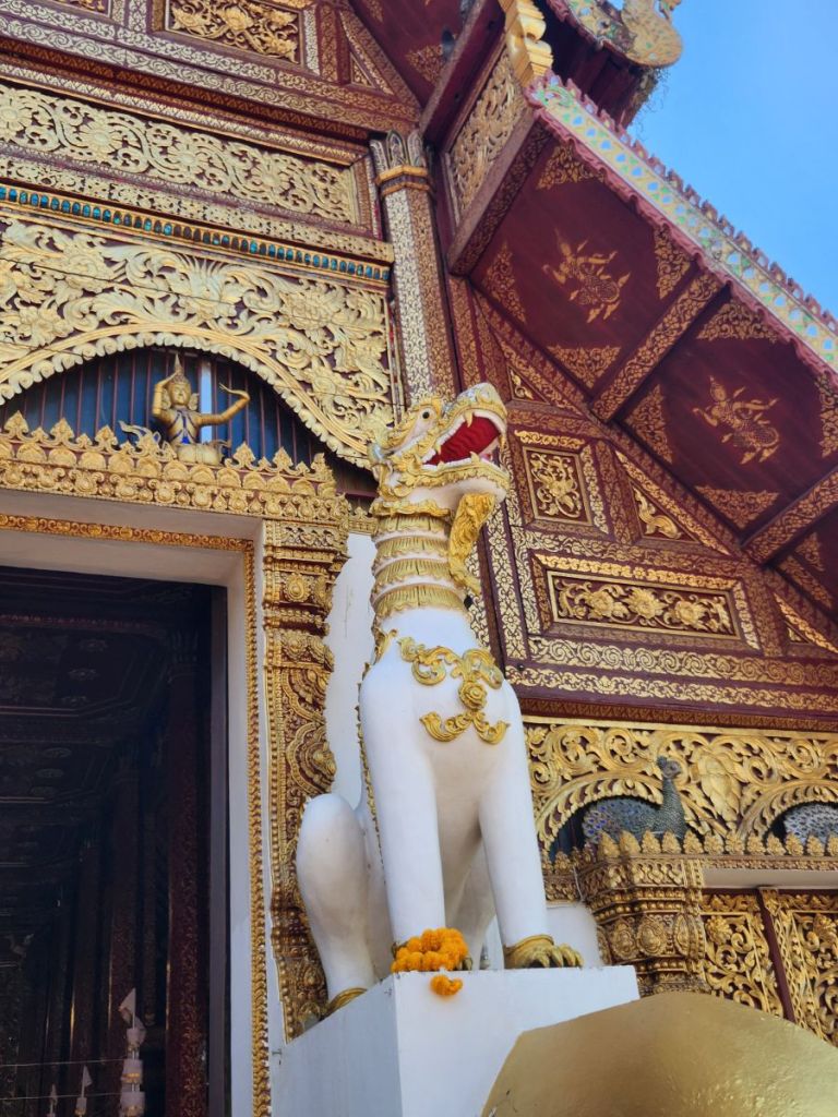 Next up on the crawl is Wat Pra Singha, sort of hidden down an industrial/retail road. You have to really look for it to find it. Situated as it is in a sort of commercial area, the courtyard area is rather bland, all white carved statues, and cement. But once inside the Wiharn, the gold and Buddha images and wall murals are stunning. Plus there is some sort of a display going on in the center of the Wiharn – lots of relics and Buddha images and different things we’ve no idea about. There were some people there, sitting on the side taking photos and videos and looking like this was a huge deal – but there wasn’t any explanation that we could see. So we just enjoyed walking around, clueless, but nonetheless admiring the beautiful craftmanship. And at the back of the complex there were series of sleeping Buddhas that were quite lovely.
