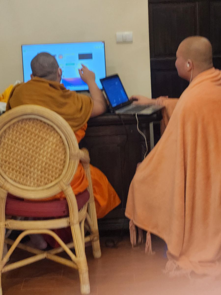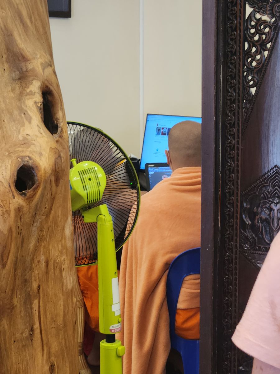 Downstairs in one of the buildings, we surreptitiously take pictures of the Monks on the computer. They are looking at some video, tiktok or Instagram or searching images or something. we’ve no idea. I know. we’re bad! But we just find the monks so fascinating, and their use of technology always just piques our interest! You’ve got to admit, it is a huge juxtaposition to see the monks sitting there in their saffron robes sufingthe web.