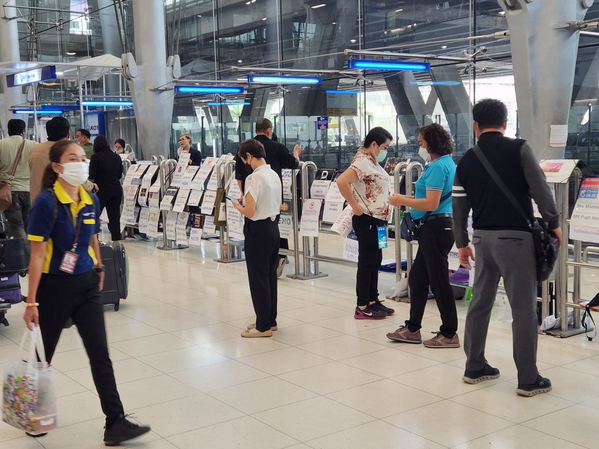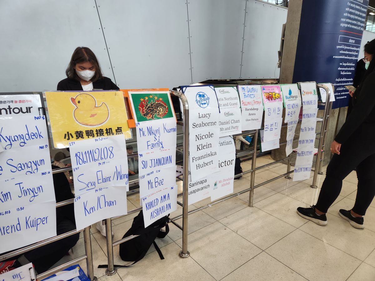 As usual, we are always amazed that we get food and beverage on a 40 minute flight! It is crazy that all these Asian and European (but mostly Asian) airlines can do this but American airlines can’t. Sad, really. Ok – rant done. Arriving in BKK, we grab our bags then head out into the arrivals area to find our pre-booked taxi. OMG! First of all, it is a zoo out here. Tons and tons and tons of people milling about, some drivers with signs, some deplaning passengers, some family. An assault to the senses. But then, there is the pre-booked taxi area. We have never, ever seen anything like this! Yards and yards of paper signs held up by tape on railings that run along both sides of the arrival hall. There must have been hundreds of names on those signs. You have to walk up and down each display to find your name, then one of the helpful attendants grabs your name off the railing and calls your driver. Incredible!