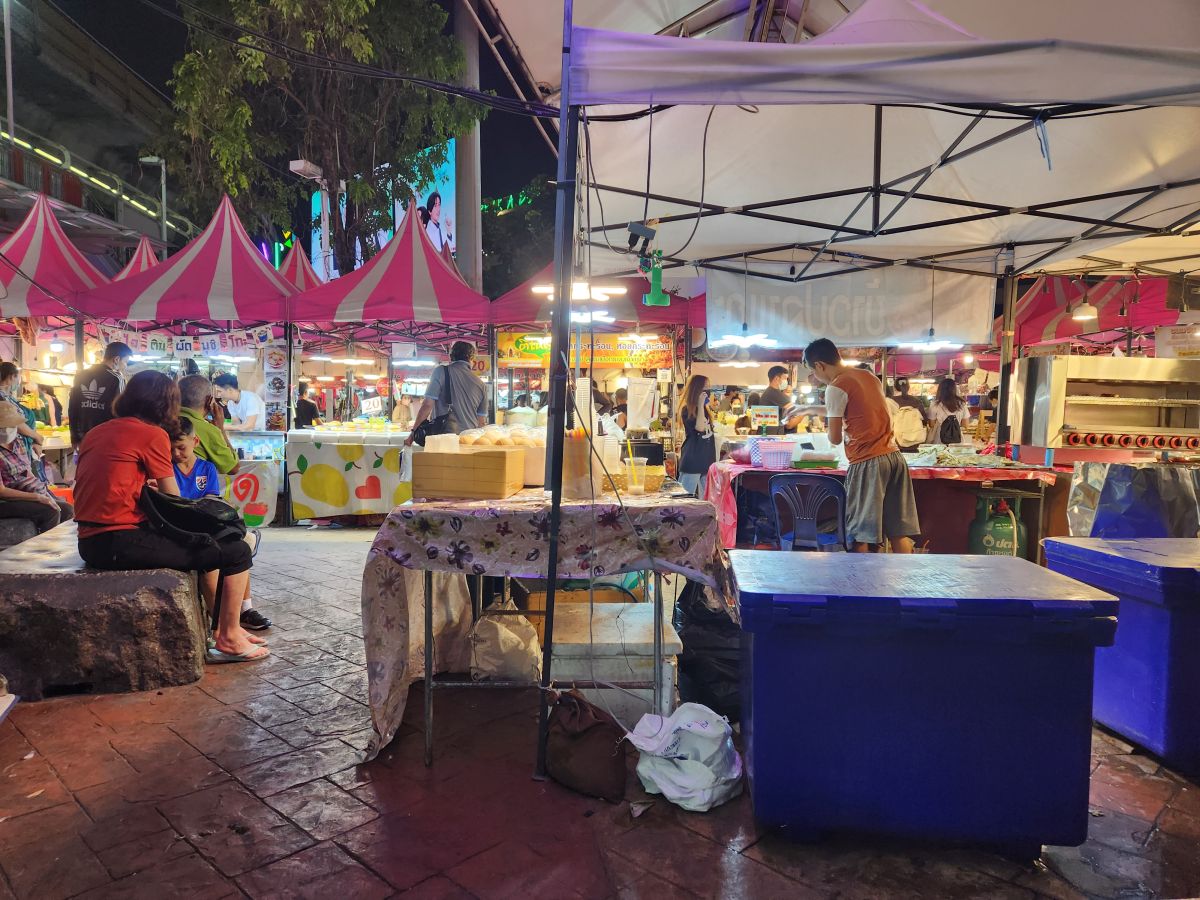 Bags stowed, travel gear put away, we hit the mean streets to explore our new home neighborhood. First thing, we mark all the 7-11 locations – beer a priority – and we also go in search of the grocery store for snacks and wine if necessary. An easy walk down Racthawithi Road, passing Santiphap park where you know we’ll walk one day, and onto the area around the Victory Monument circle. The transportation hub is here, monorail, taxis, songthaews, everything you’d ever need. There are also little shops and a huge street food market. Yes! Dinner is handled!