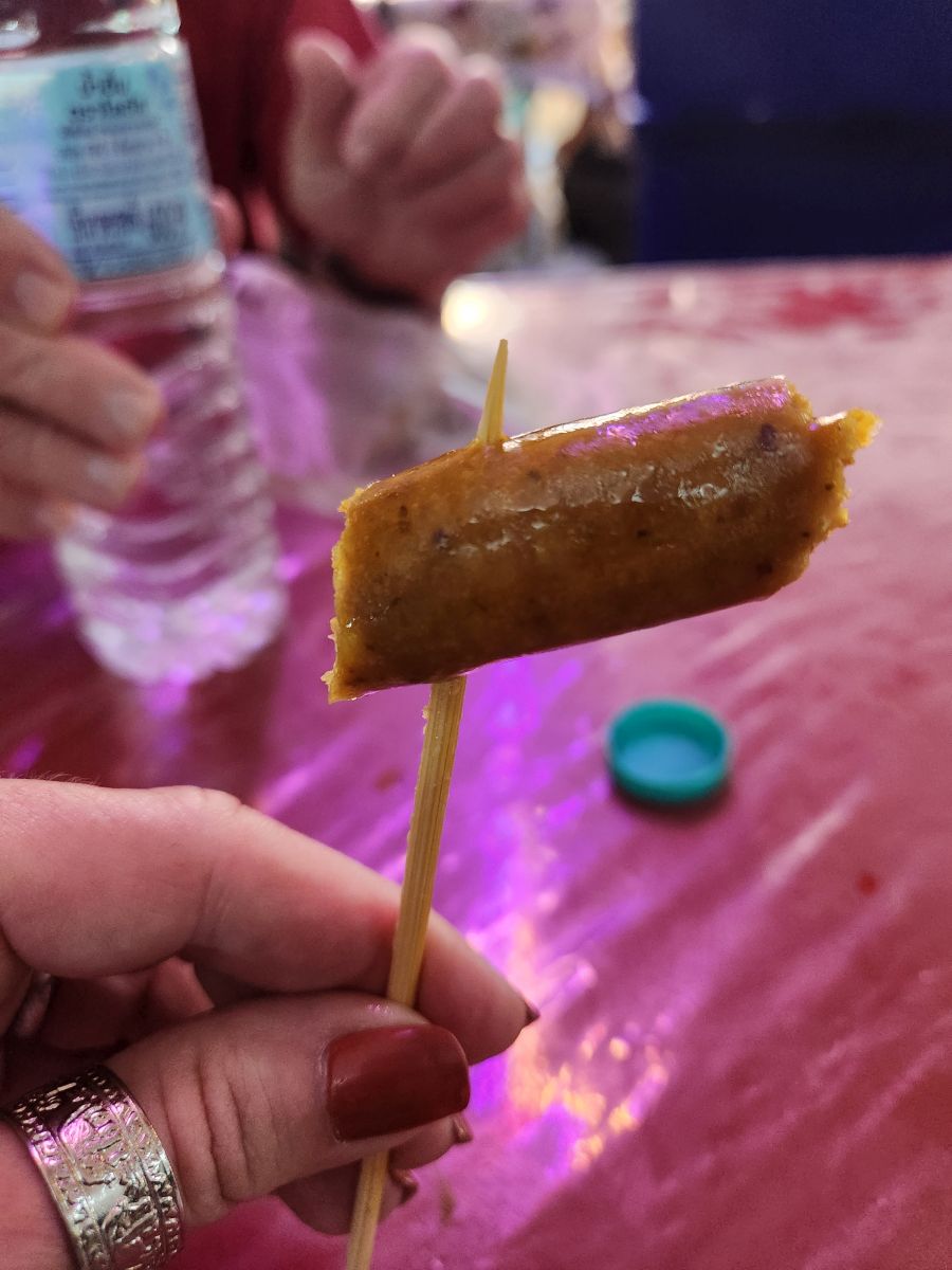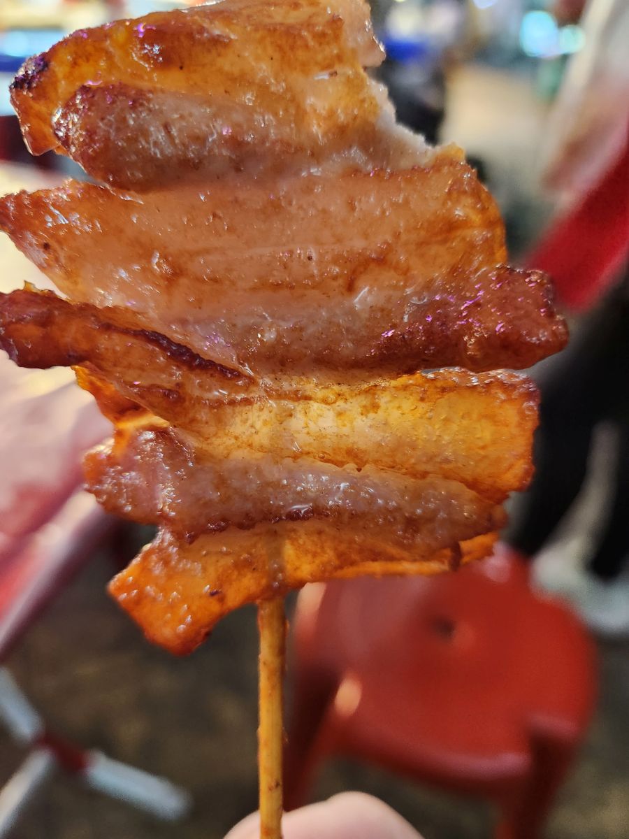 Later, at the appropriate dinner time, we are back out on the streets heading for the street market. Lucking out, we find a table and rotate wandering the different stalls. There are lots of different offerings here, because of course we are now in the South where the food is different from Northern Thailand. It is fun to see all the different food here, but it also makes for tough decisions. We end up with Chicken satay and sausages, plus these little Japanese Takoyaki balls which we chose because they have some with octopus in the middle! Also Chicken ones and Ham ones – we’ve never had these and they are yummy – and something to remember when we go to Japan in a few months! We finish out our feast with fried pork belly (sort of actually bacon, but thick bacon) which I get to grab right off the hot grill after with a bunch of local Thai’s who were trying to pick out skewers from a big tray and of course, knew what they were doing! The lady at the grill actually took pity on me and handed me a bag full of piping hot skewers.