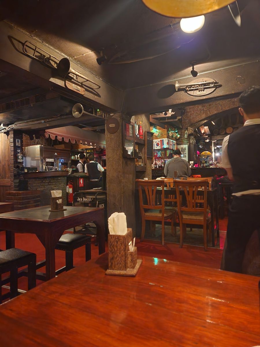 Excellent first meal in Bangkok. Afterward we wander over to the Saxophone Pub, which we had spied earlier, for a drink and hopefully some music. The pub has a great atmosphere, all dark wood and low lighting, but apparently doesn’t get going until later in the evening, plus, no wine by the glass, only by the bottle.