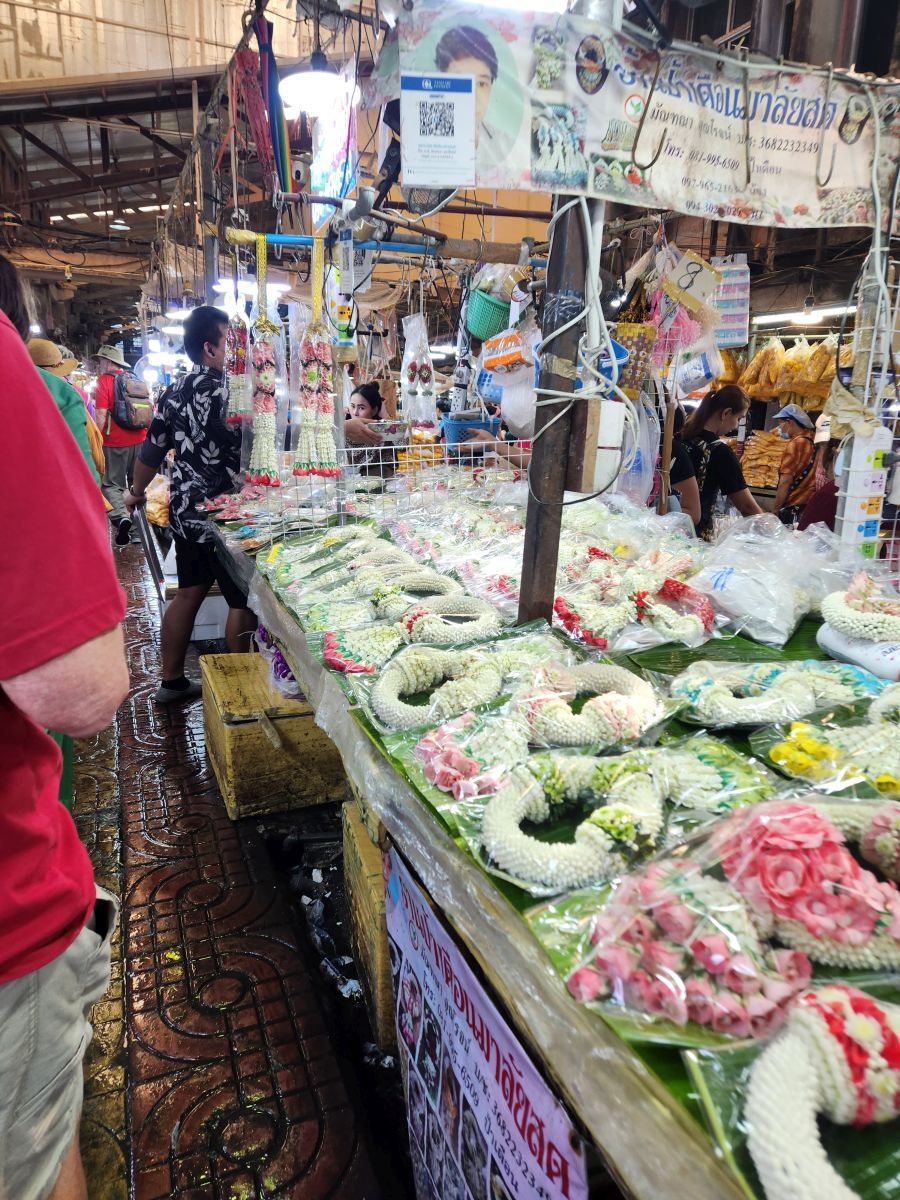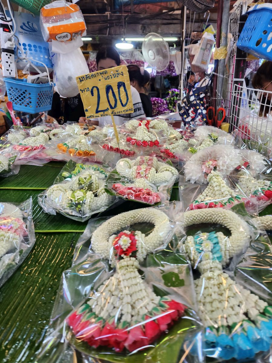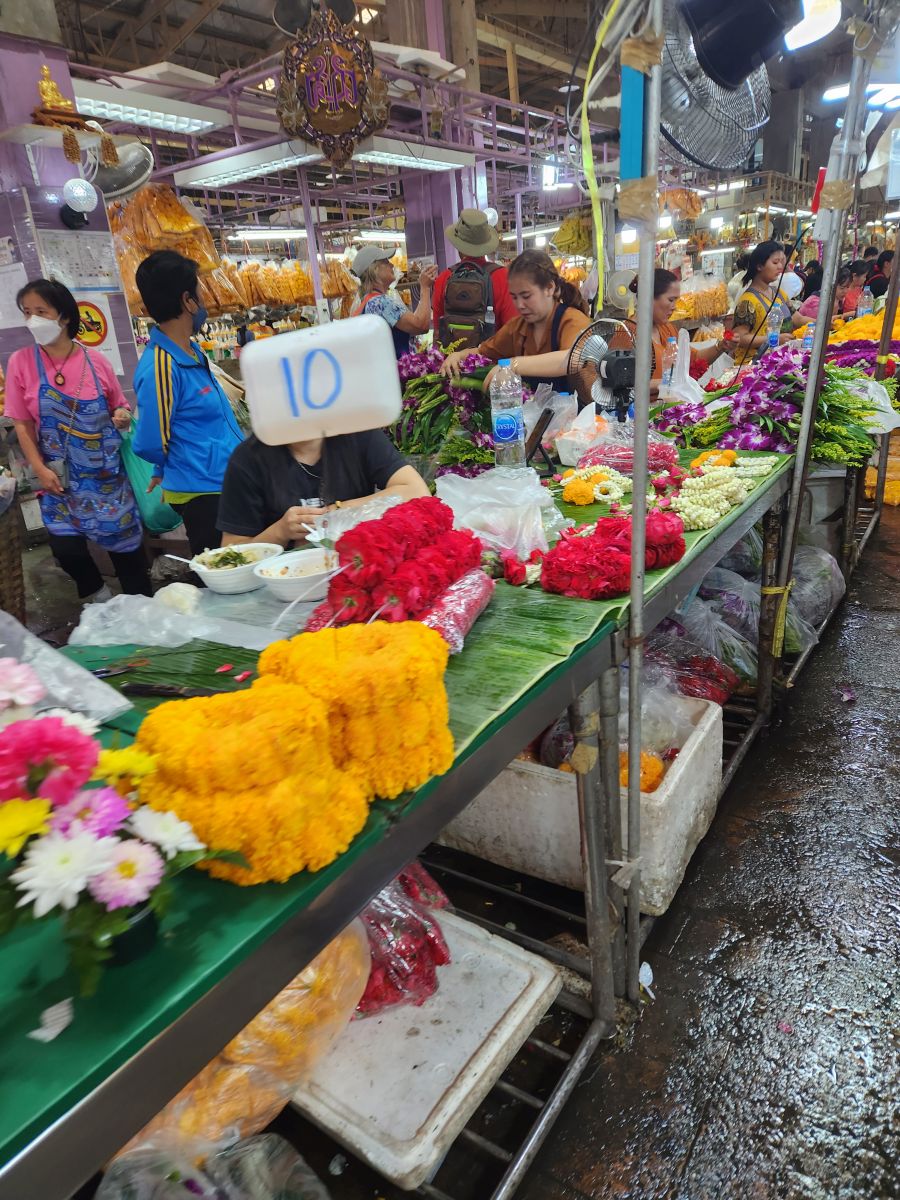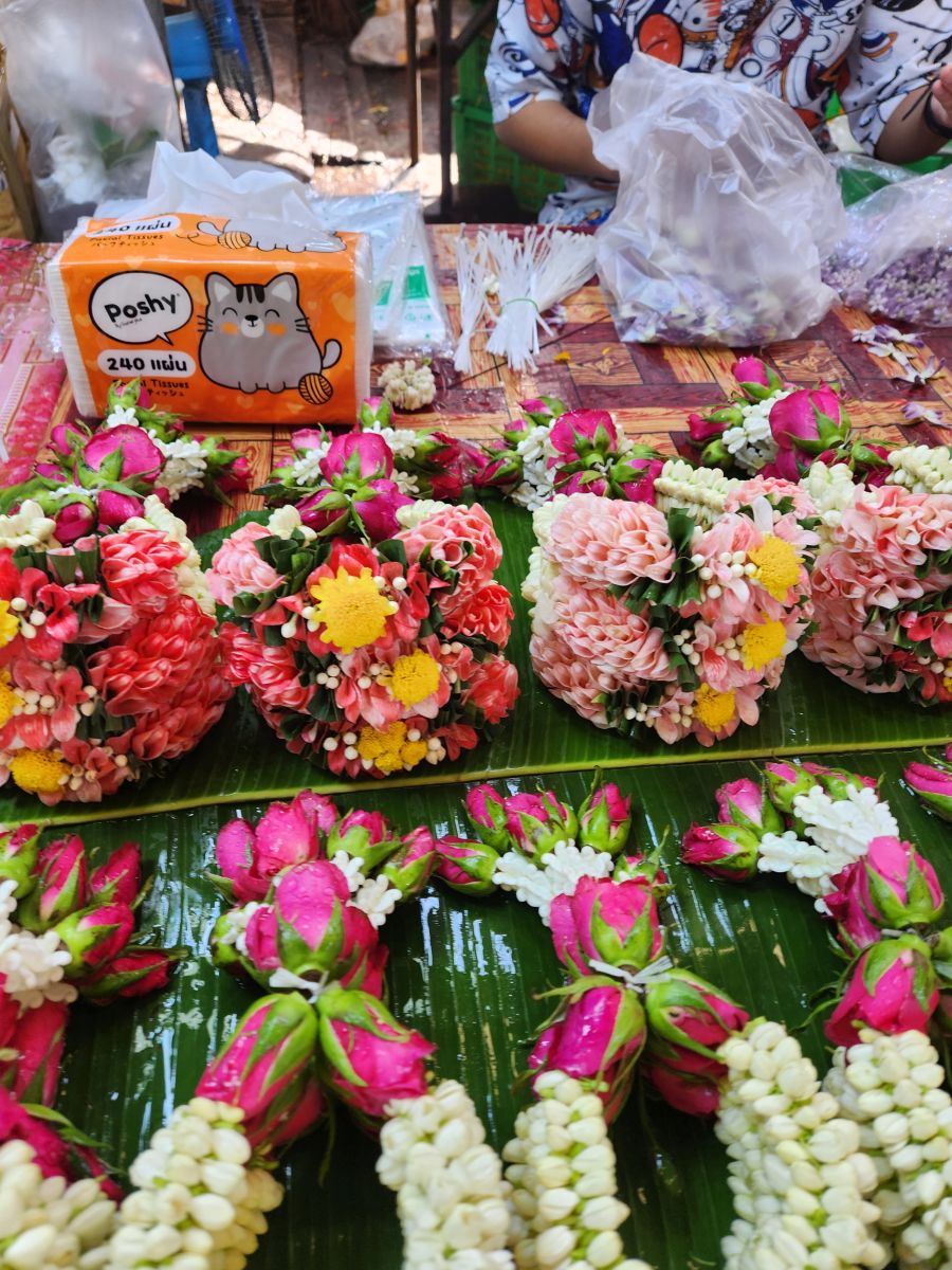 We start off the day with a quick drive around parts of Bangkok, and a stop at the oldest market in Bangkok, Pak Khlong Talat, the local flower market. Udom explains this is the locals market, not many tourists come here and he wanted to show us an important part of Thai lifestyle, the flowers for offerings at Wats, for celebrations, for personal home temples. The place is huge and we get some time to just wander around – which is amazing. We can’t get over the sheer volume of flowers and different arrangements being made here.