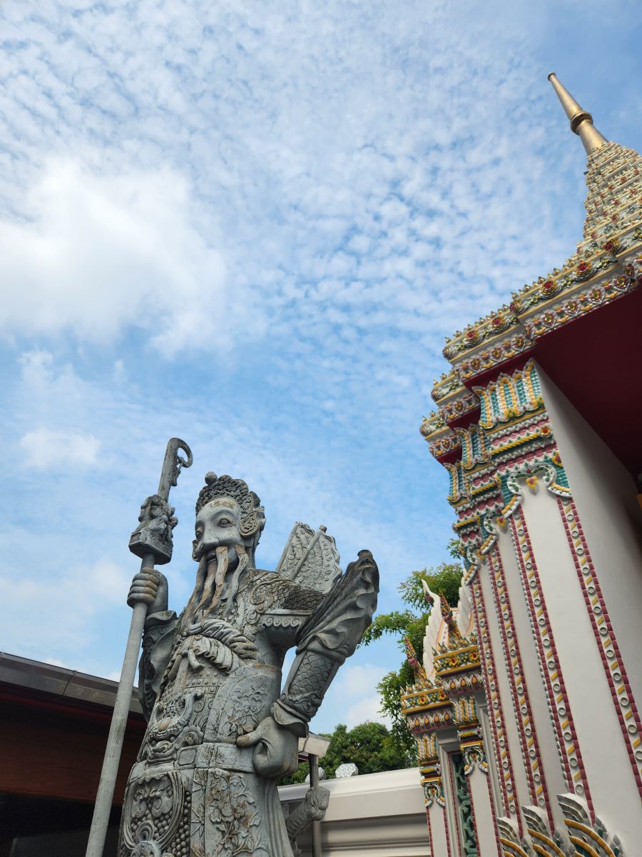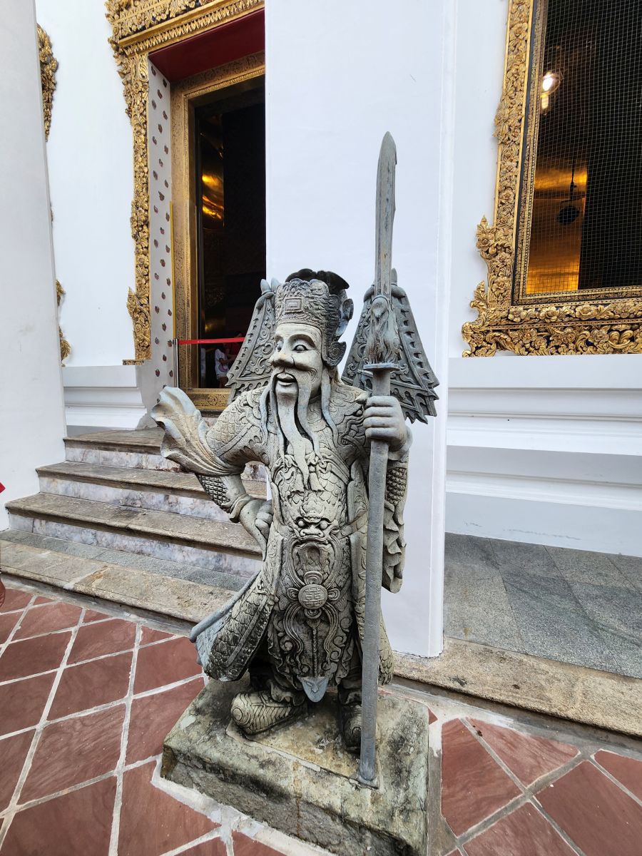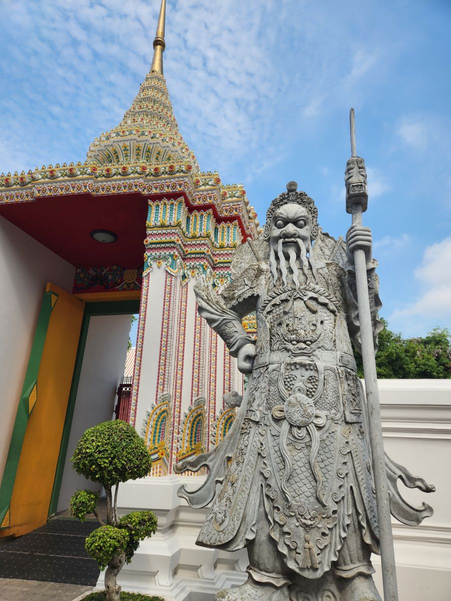 Udom takes us around the exterior courtyard, explaining the different warrior statues and meanings of the flowers and different offerings. We finally now understand the incense that worshippers use at temples: 3 different incense sticks; one for what you want to do in life, the second for you to actually do that in life and the third for you to continue to do it. Aha!