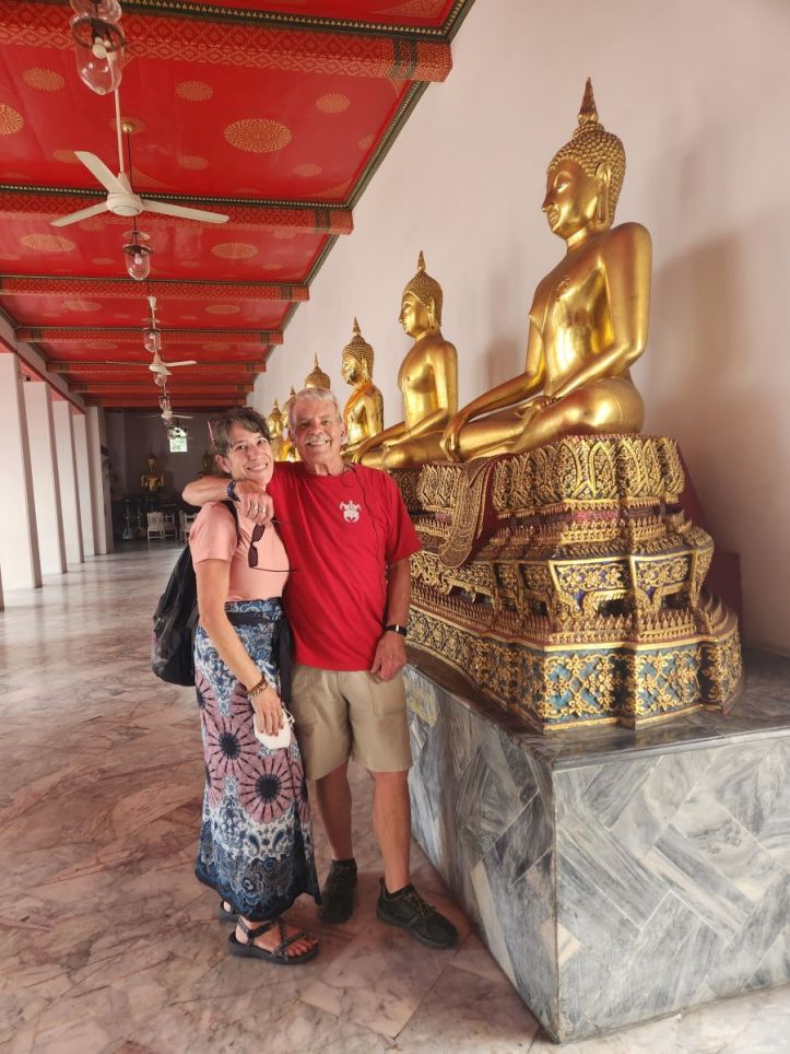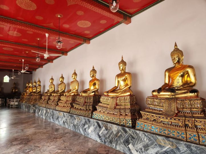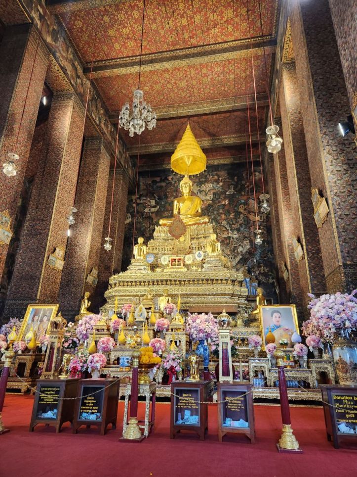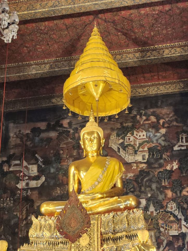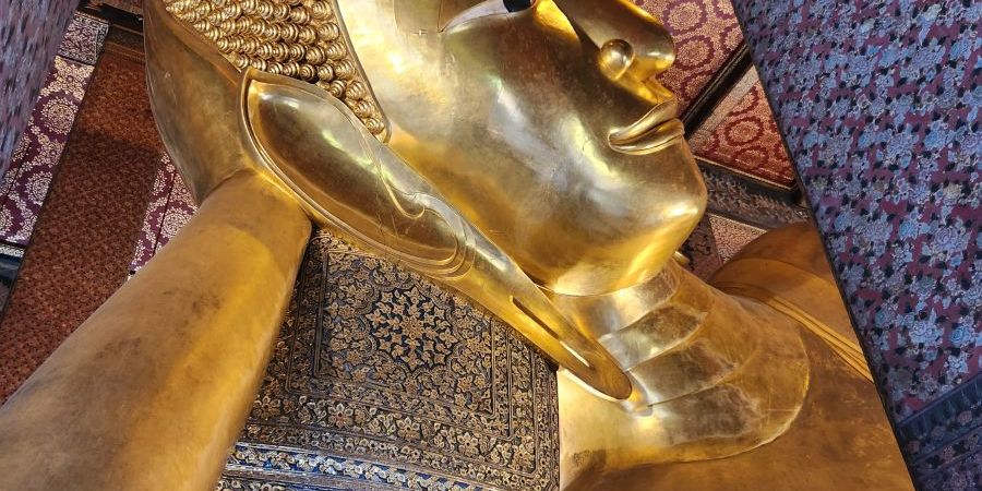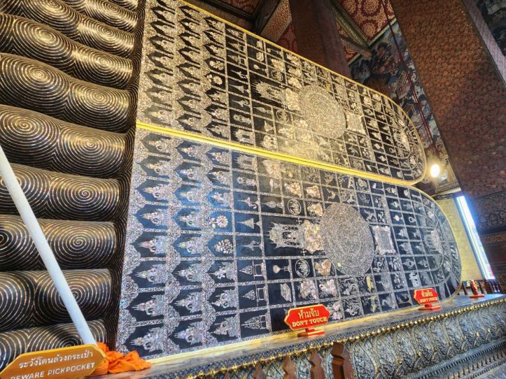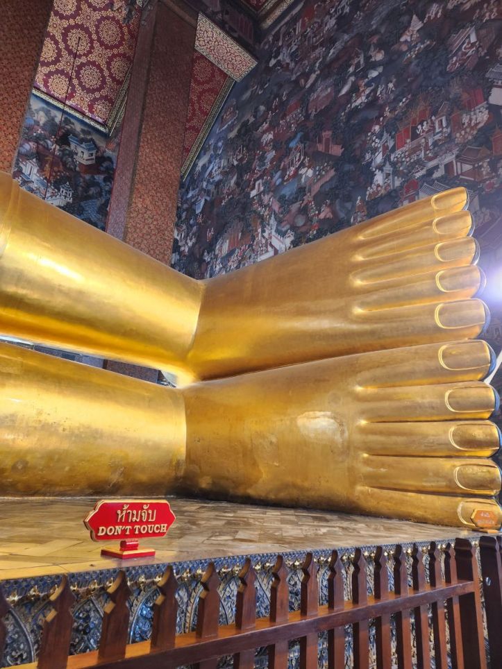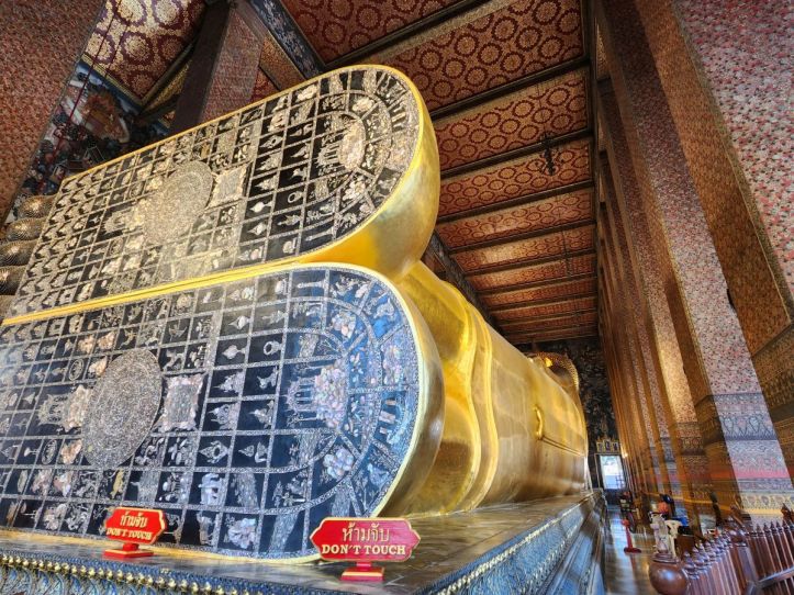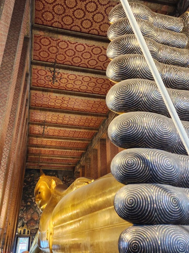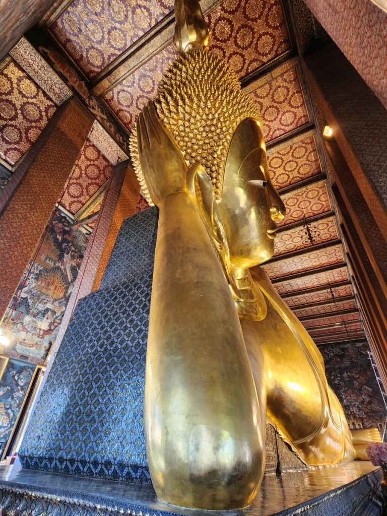 Next is the main event: The Reclining Buddha. We’ve been here before, albeit years ago, but it is still such an incredible sight. This massive Buddha icon, laying inside the ornate temple. Before we go in Udom explains that the Buddha image was created from bricks and stucco, then 7 layers of lacquer were applied before the final application of gold leaf.